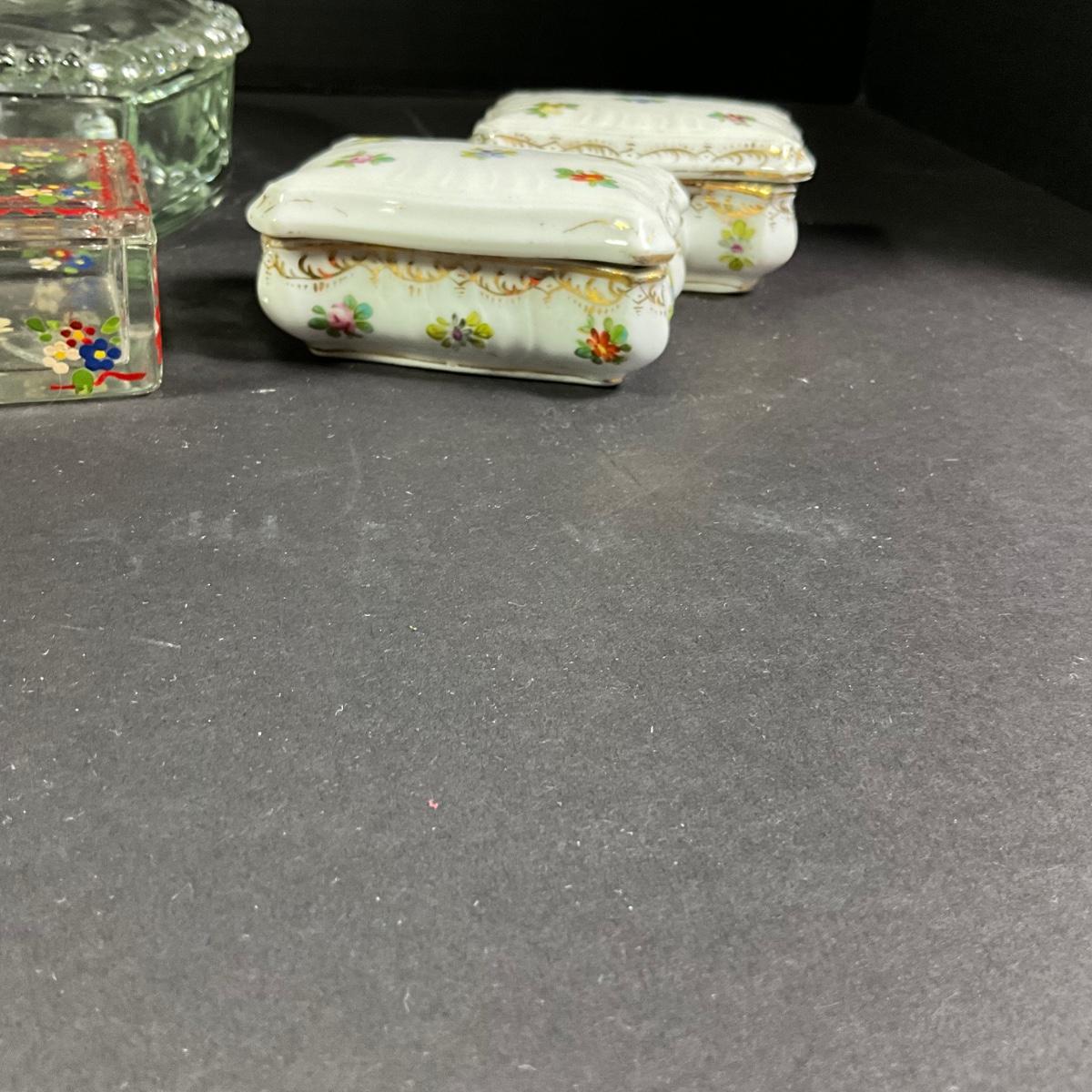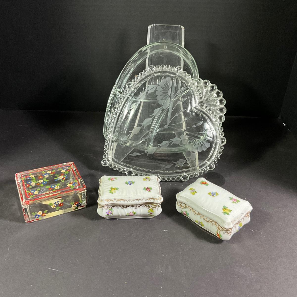 1114 Antique Pressed Glass Heart Dish and Fairing Boxes with Match Striker