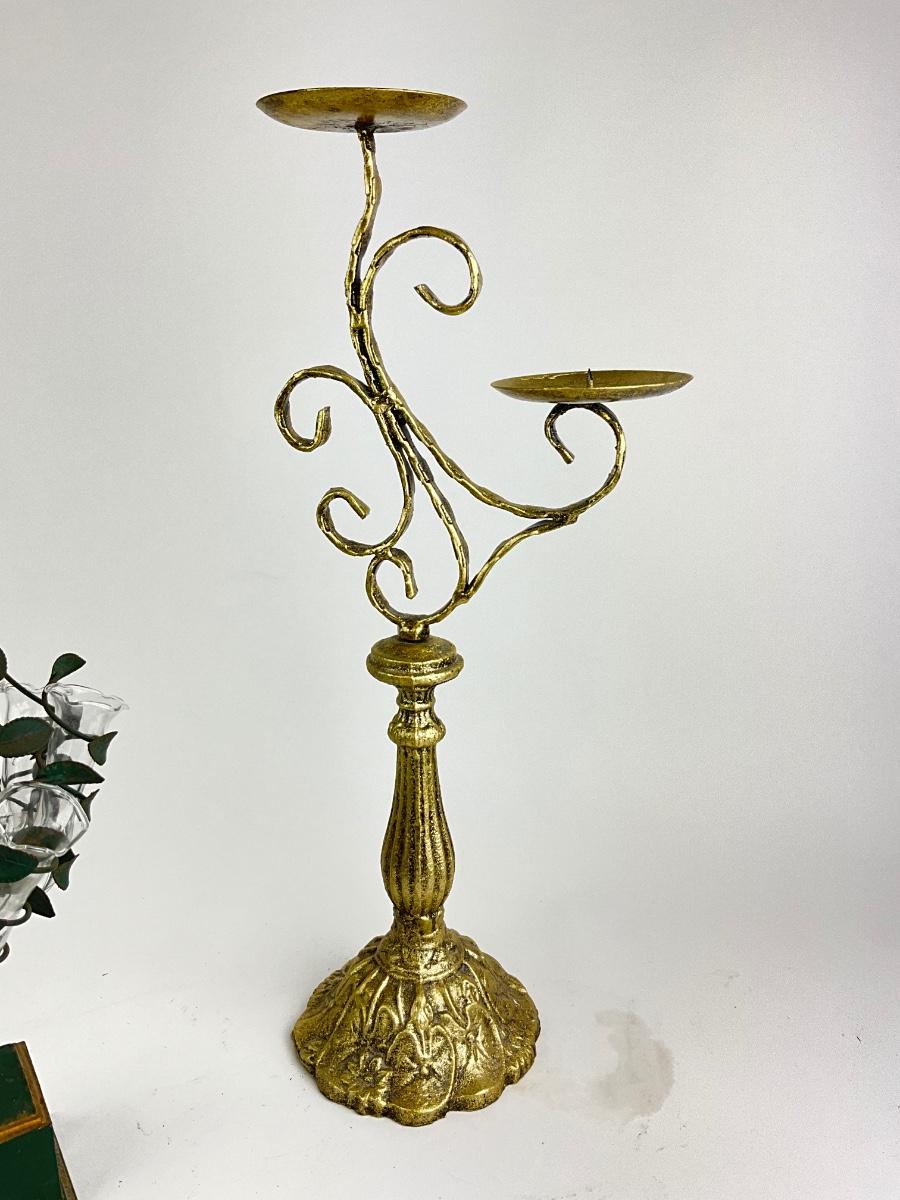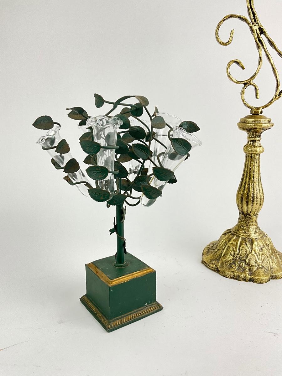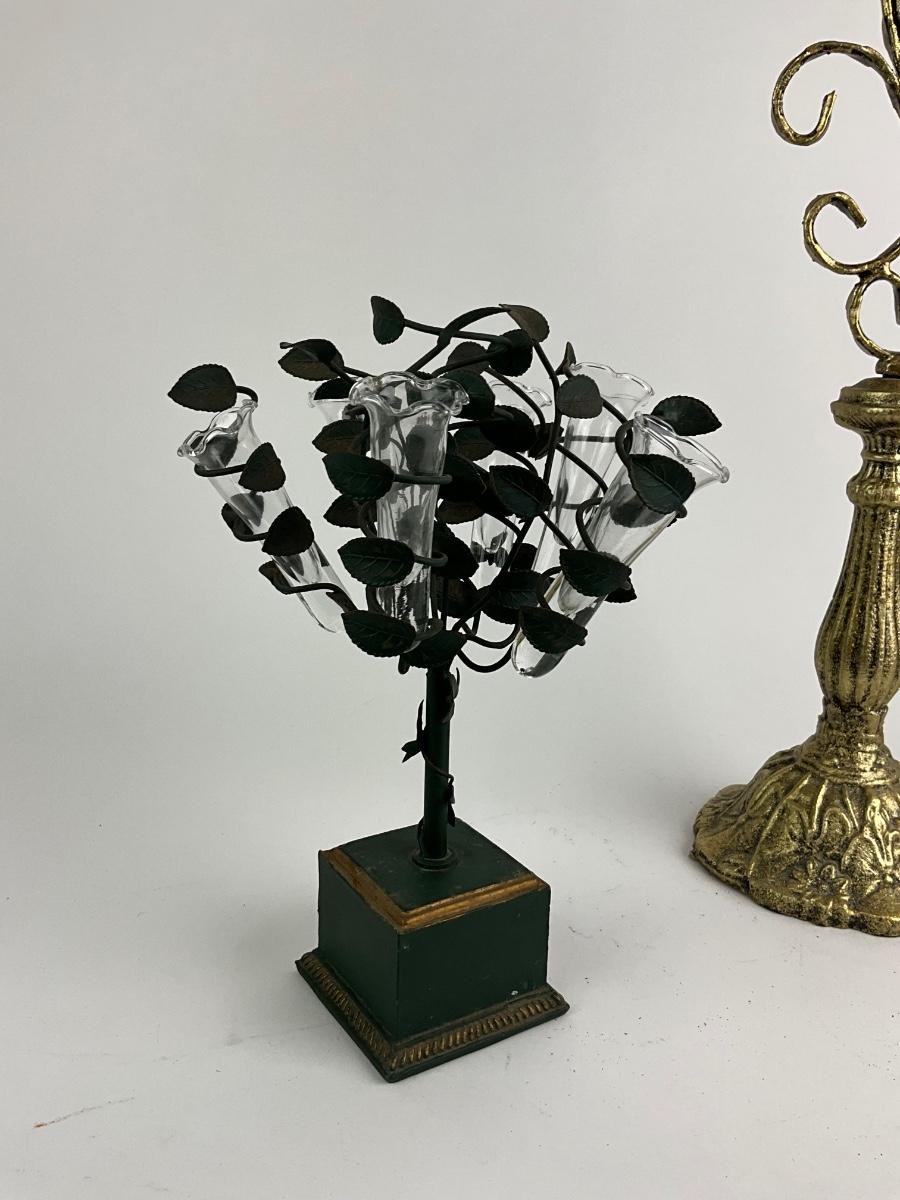 1114 Gold tone Candlestick with Glass Tube Floral Vase on Base