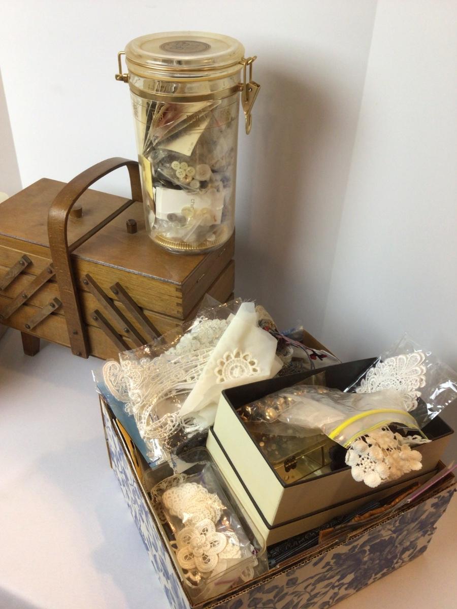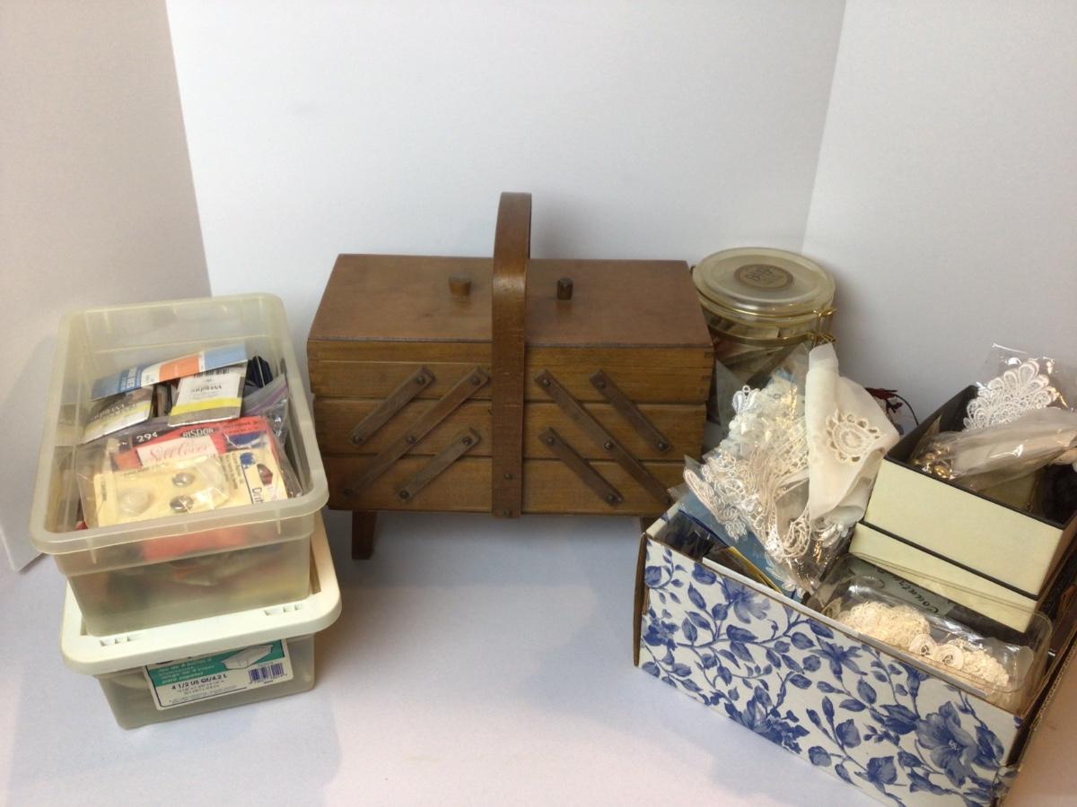 Lot contains buttons, zippers, bias tapes and vintage sewing box.
