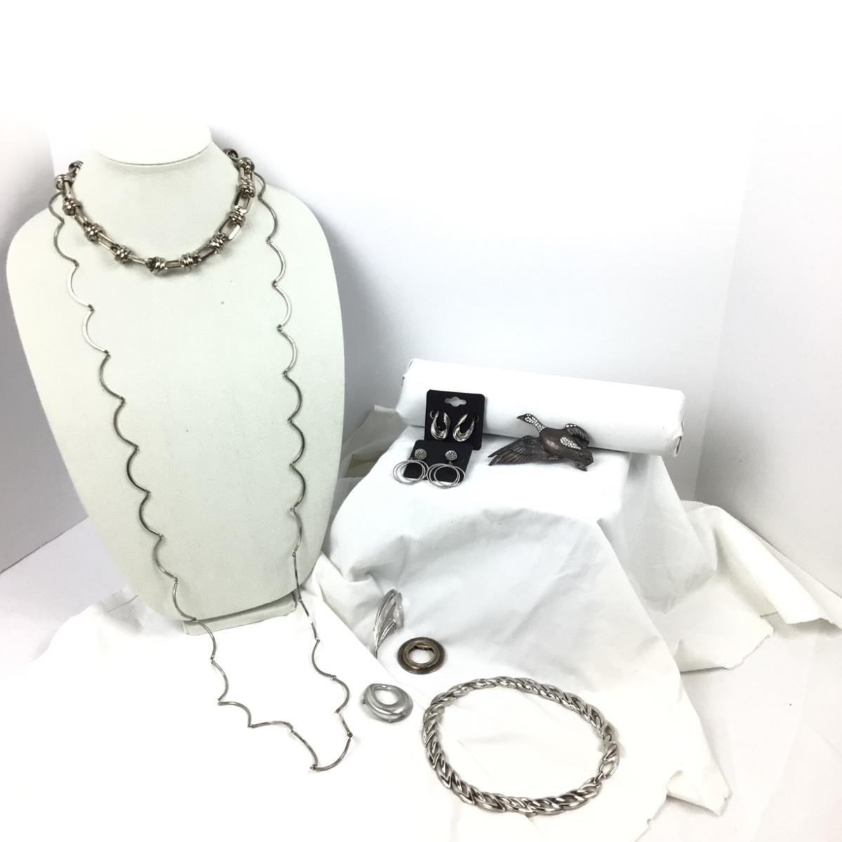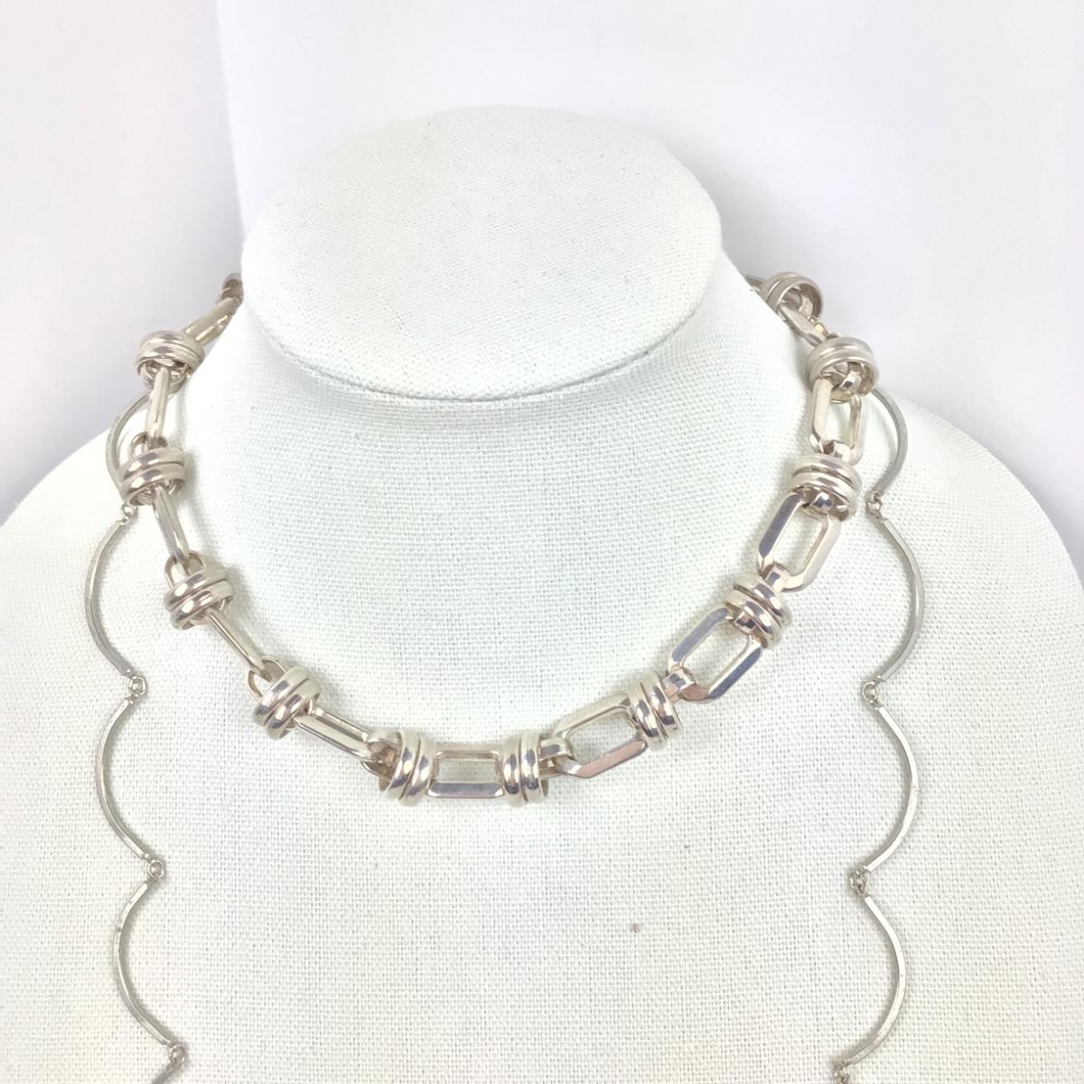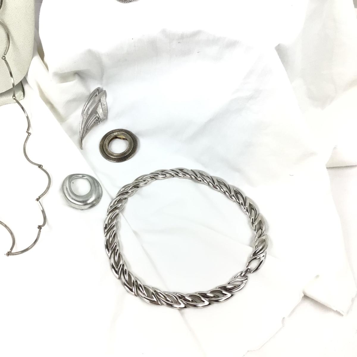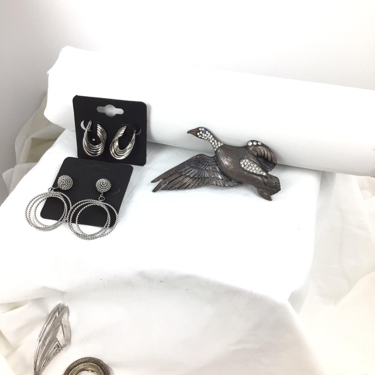 Long 1/2 round link necklace is 52” , large chunky necklace with open links is 18” , Flat leaf link necklace is 17” and one silver tone and flying duck/goose pin with rhinestones and two pairs of pierced silvertone earrings