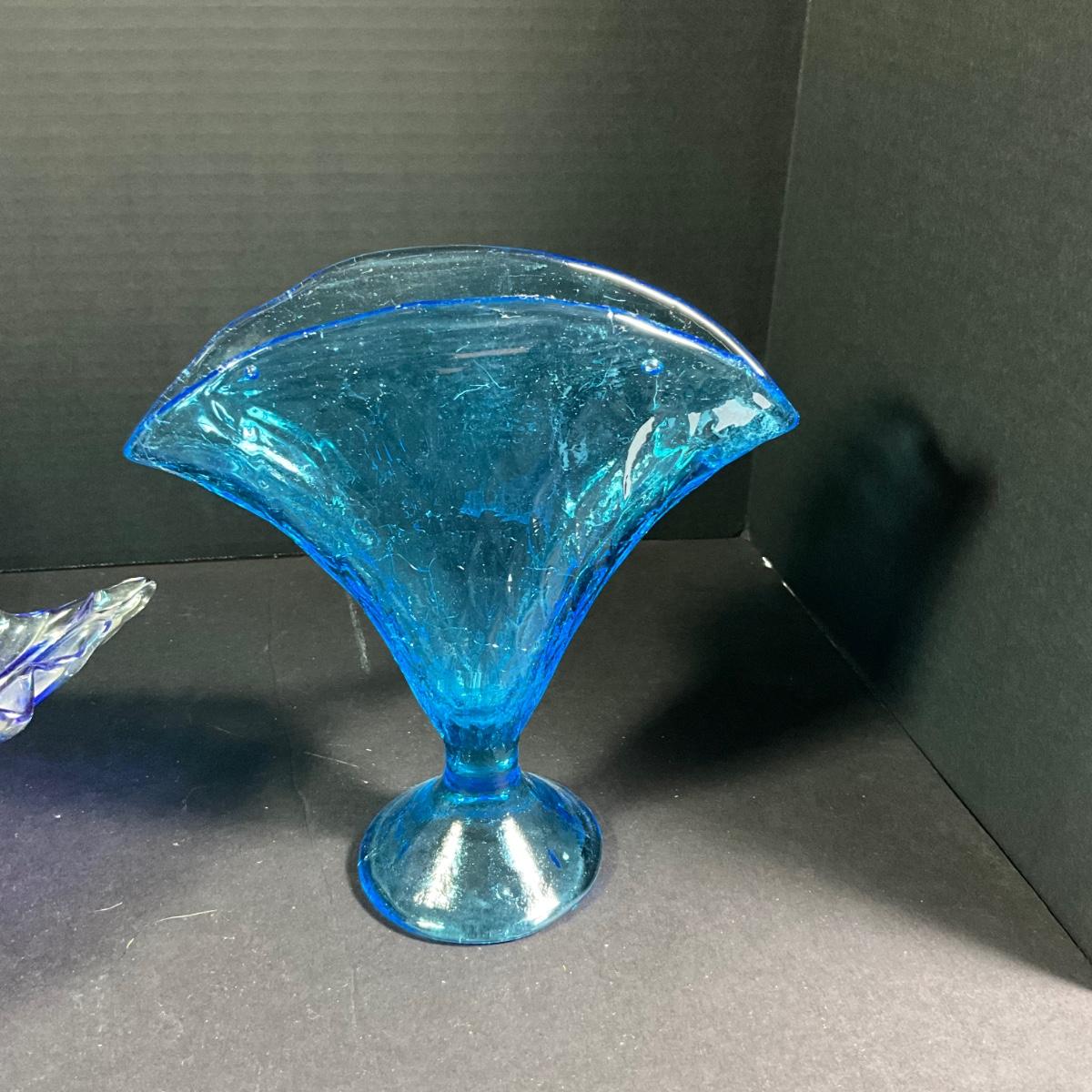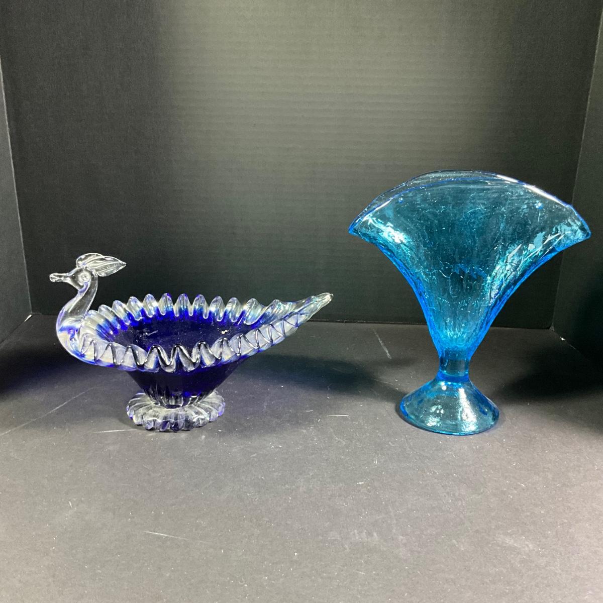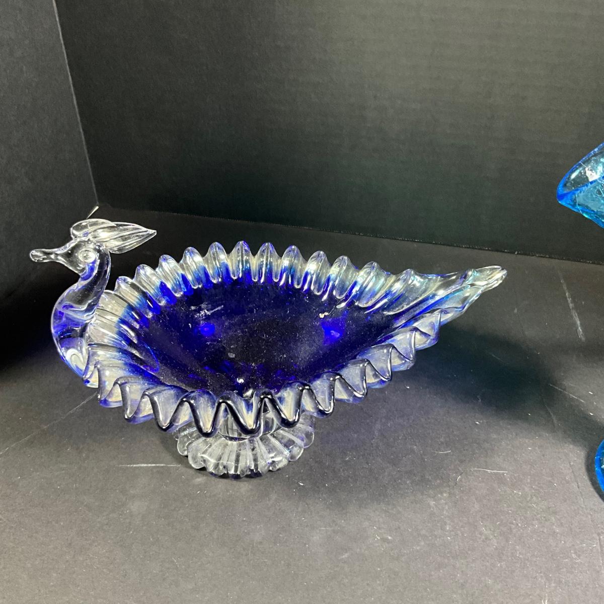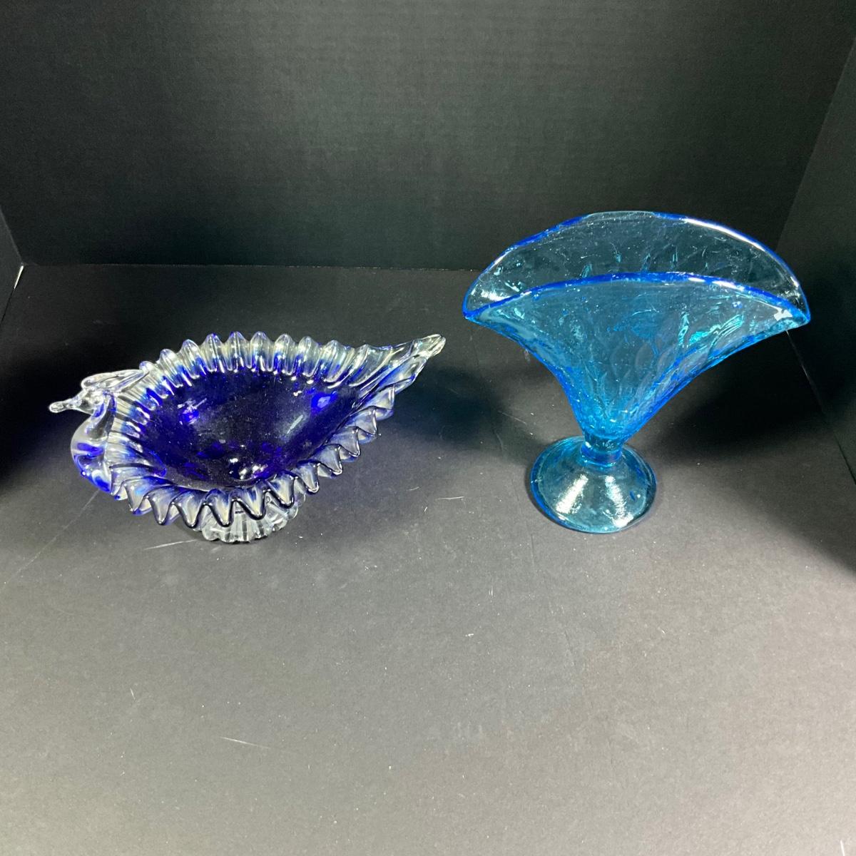 1115 Vintage Murano Glass Blue Peacock Bowl and Blue Glass Fan Vase