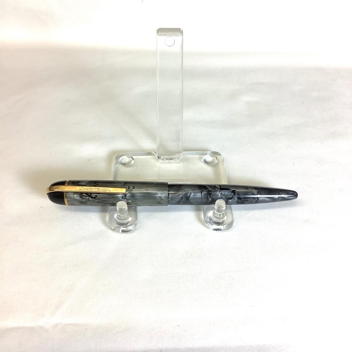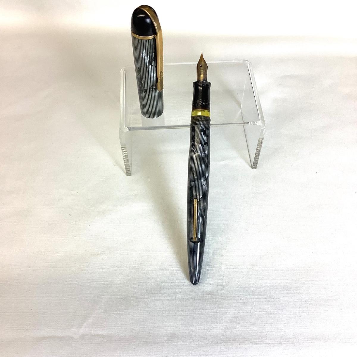 The vintage Eversharp lever fill fountain pen circa 1943, skyline gray moire celluloid, gold filled cap banding and lever bar. The pen has a 14k nib. The gray and black striped longitudinal celluloid pattern is known as moire.