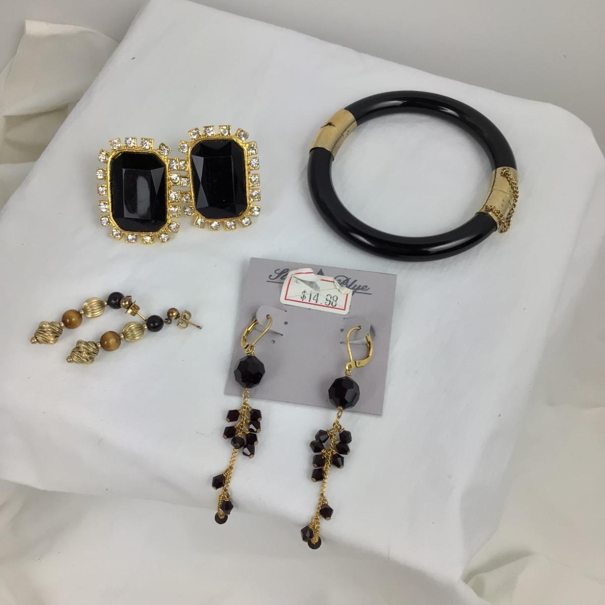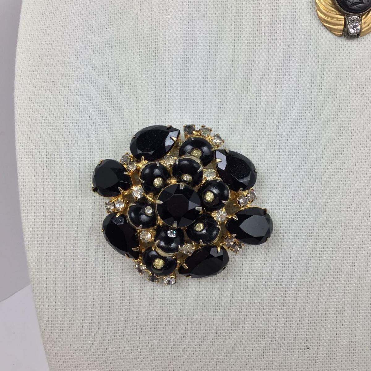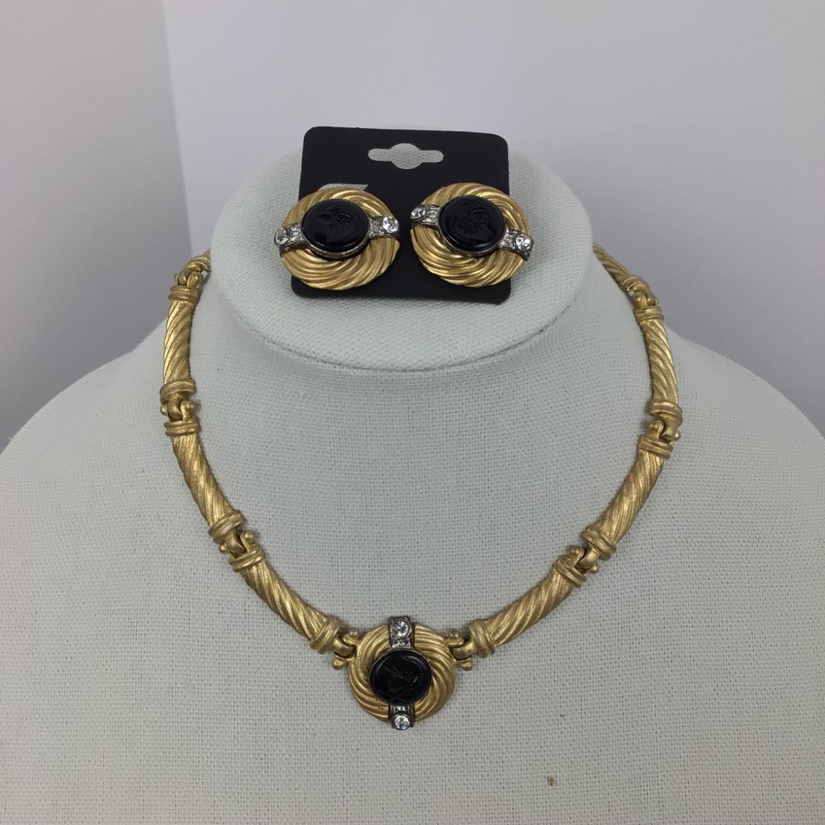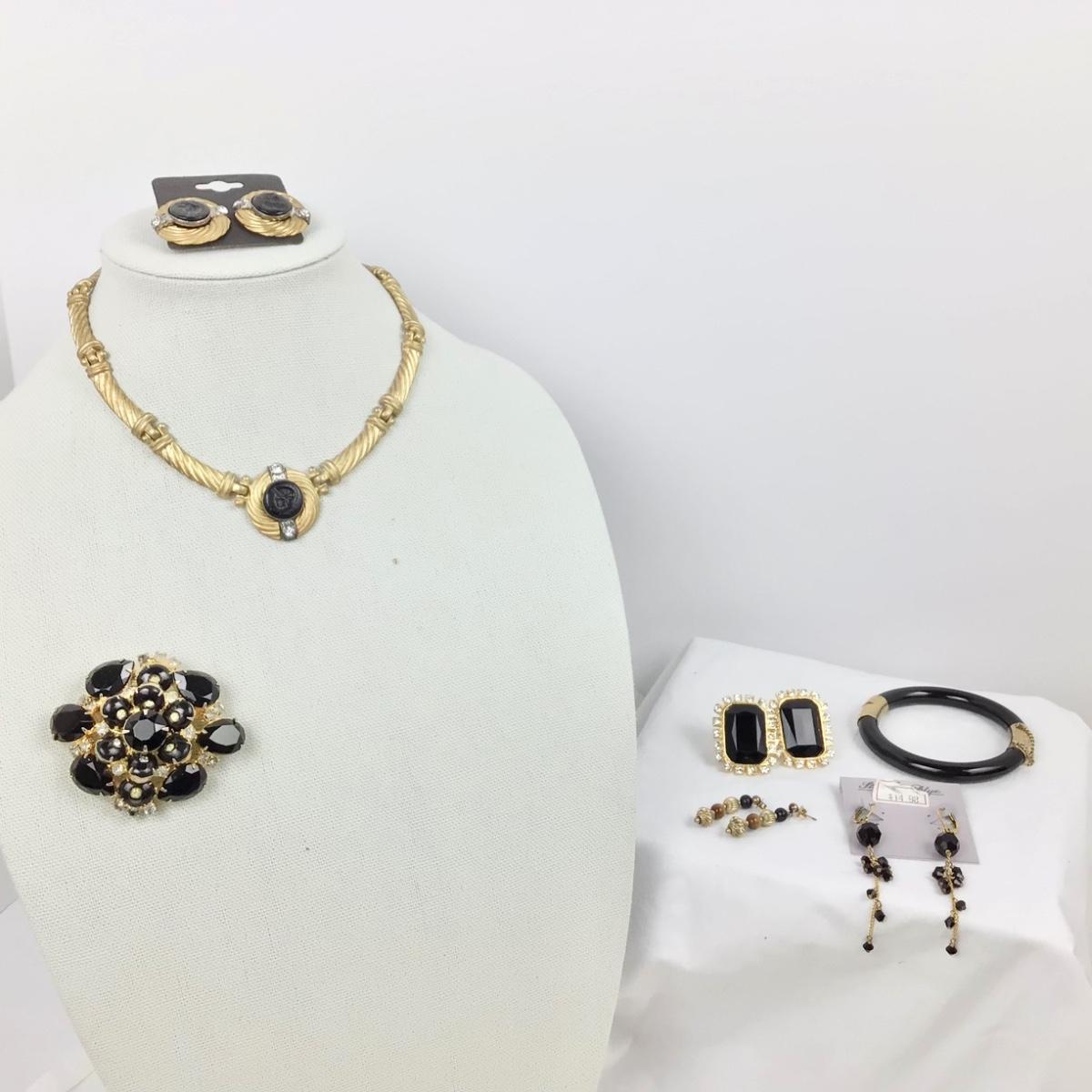 Vintage Roman Gold and Black Necklace with matching clip earrings , gold and black hinged bangle bracelet , gold and rhinestone clip on earrings , black and gold with stone pierced earring, black stone dangle pierces earrings , Black and gold vintage 2” brooch