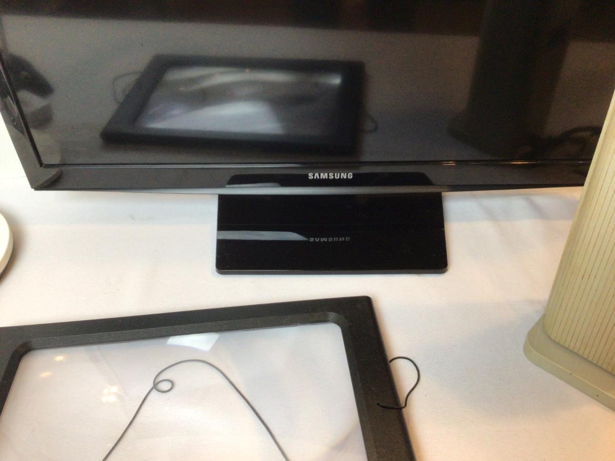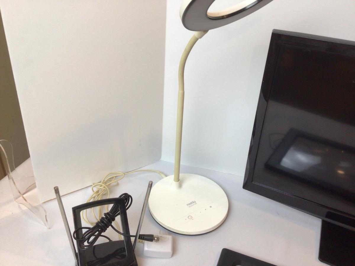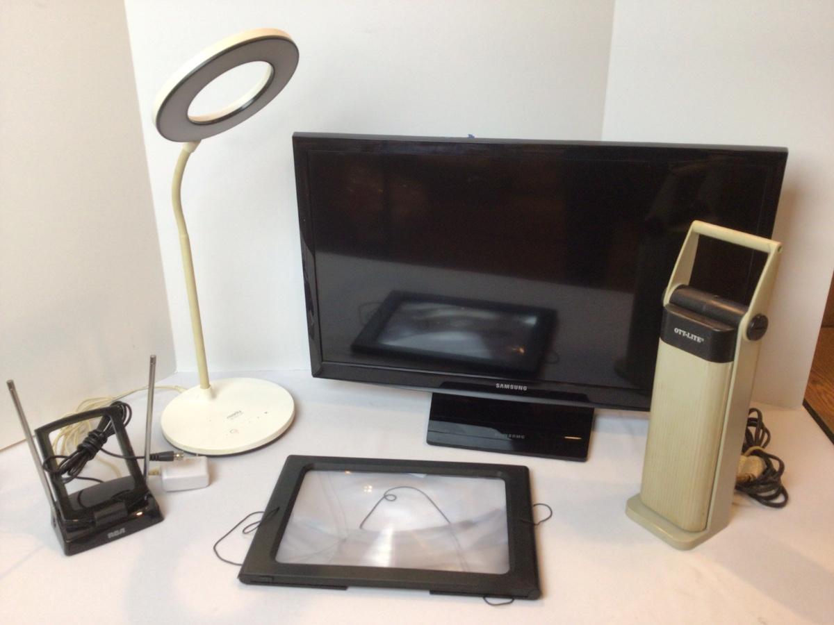 Lot contains 25” Samsung TV with remote, Ott lite, mlady magnifying light, RCA rabbit ears.