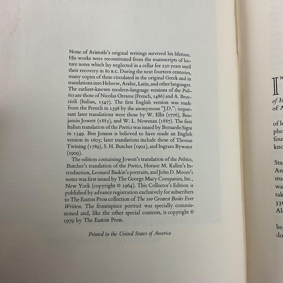 112 "Politics & Poetics" by ARISTOTLE. 1979; The Easton Press "Collector's Edition"