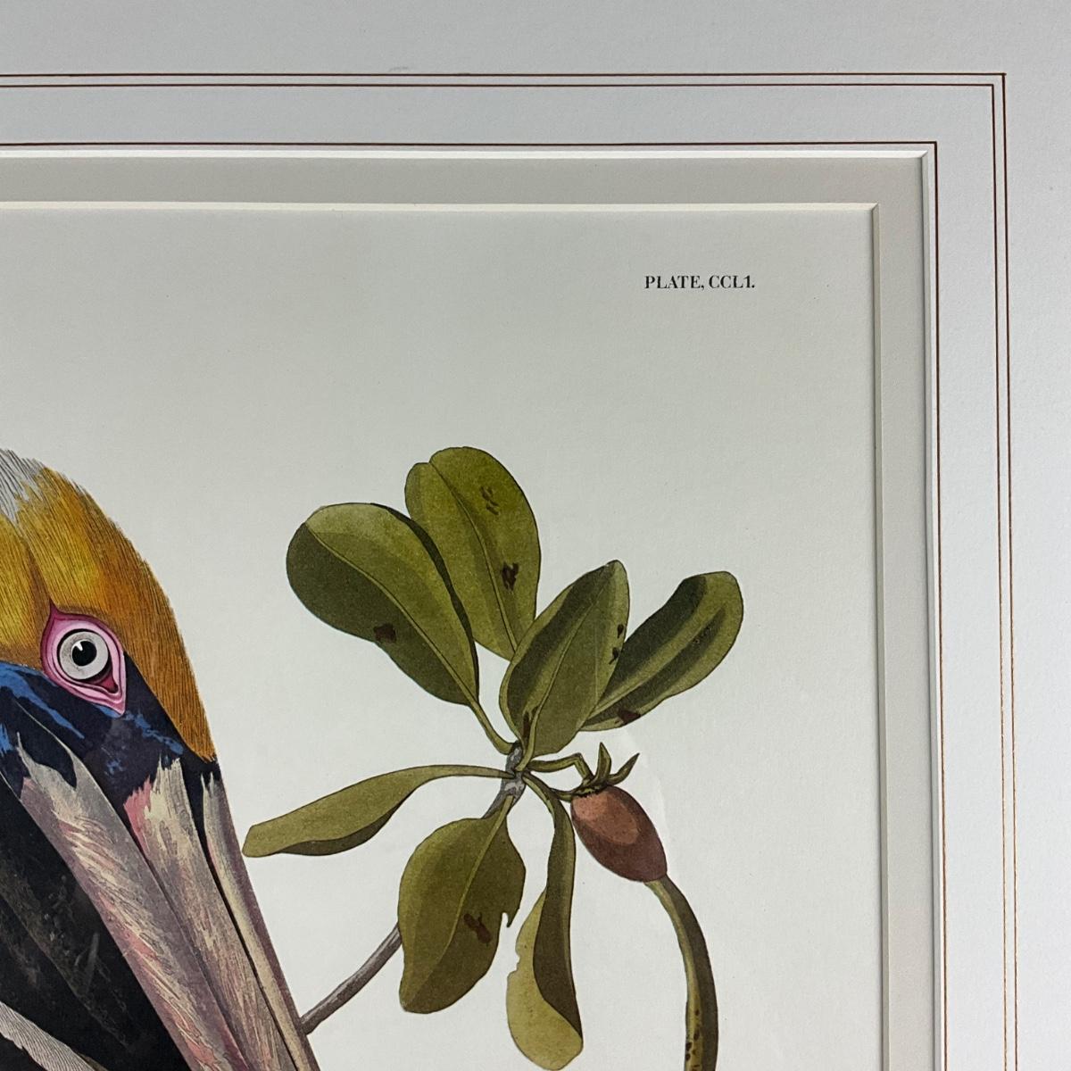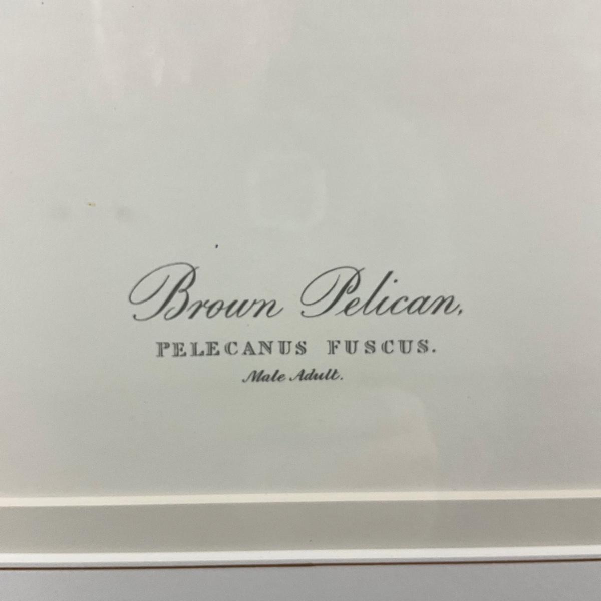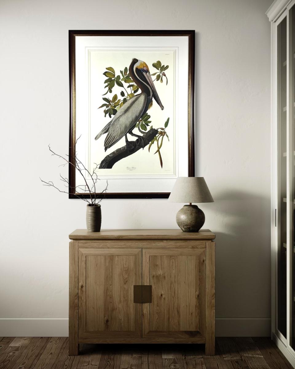 Reproduction after John James Audubon, depicting Brown Pelican (Pelecanus fuscus). From The Birds of America, originally drawn by Audubon and engraved by Robert Havell Jr. in 1835. This example is a later decorative reproduction print, not an original 19th-century engraving.
