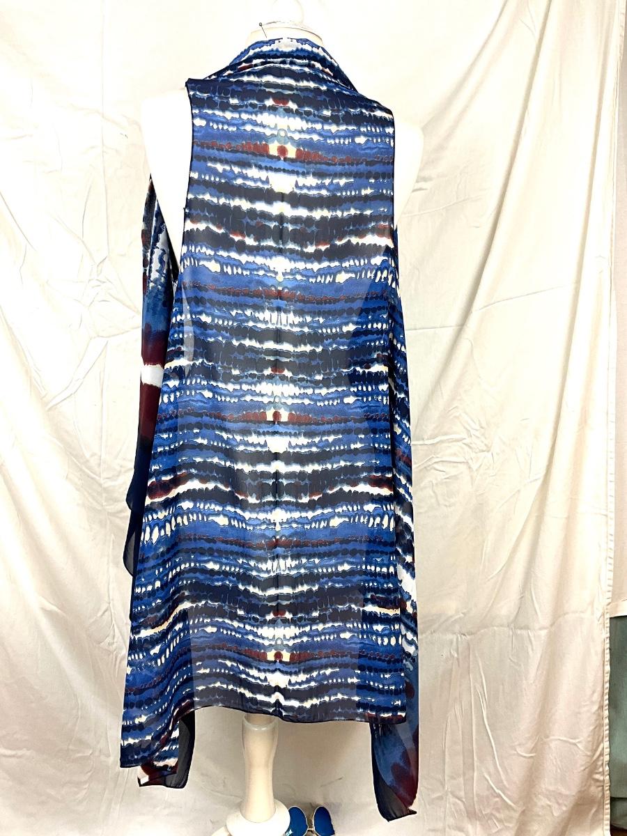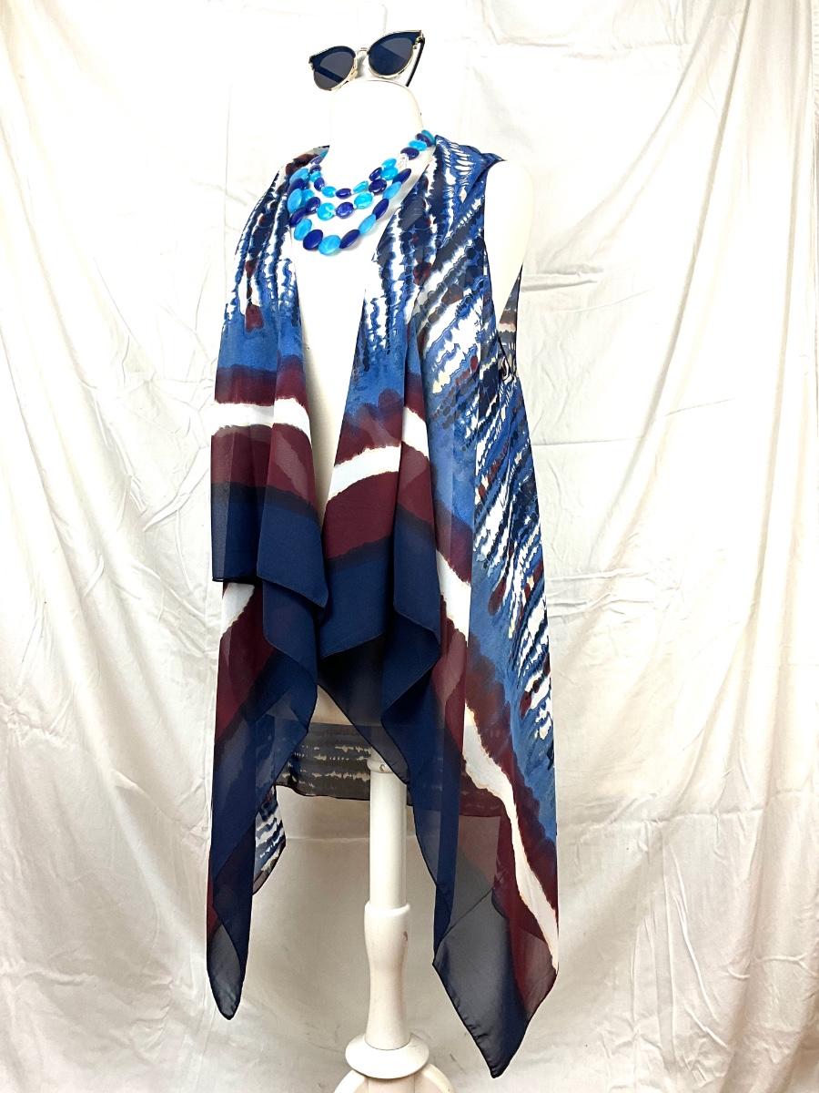 112 Blue, White, Burgundy Shawl/ Wrap with Beaded Necklace and Blue Tinted Sunglasses
