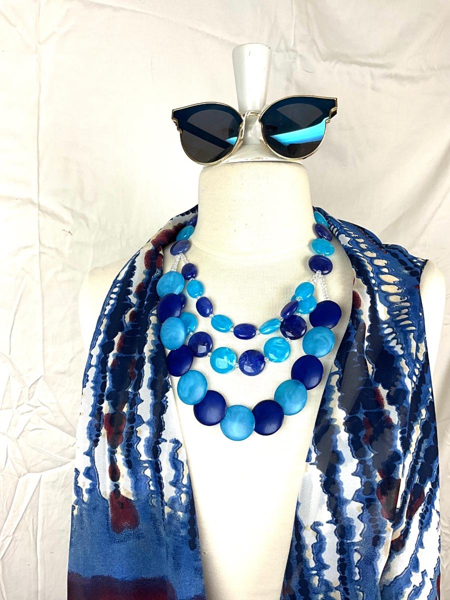 Polyester wrap with three strand beaded necklace with blue tinted sunglasses