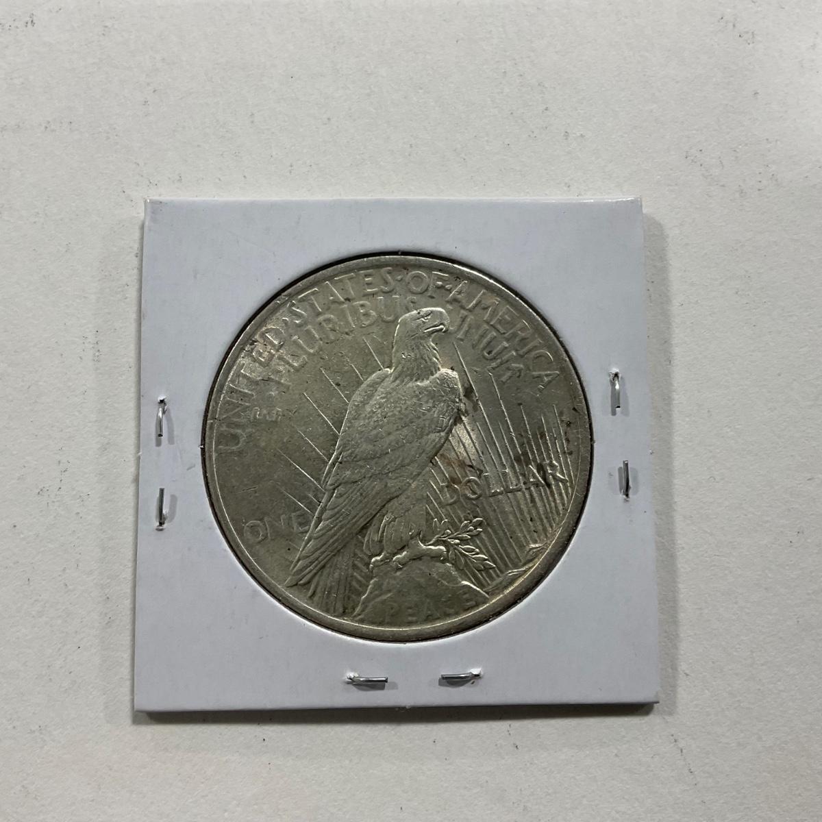 One 1922 peace dollar obverse - bag mark by nose, toning spots in ray overall nice luster. Please see photos for details and condition. ::: Shipping is available on this lot. If you require shipping you must let us know at the close of the auction. We will coordinate with you after the item has been won. Shipping fees will include insurance up to or exceeding the value of all items being mailed. If you have any questions regarding this lot please contact the auctioneer either via this website, by direct email or by phone. PICK UP TIMES and other important information can be found in the TERMS and DESCRIPTION of the auction. Please take a look for pertinent information. Thanks!