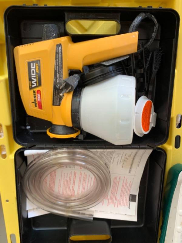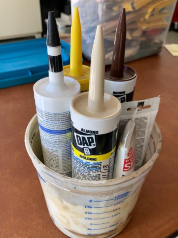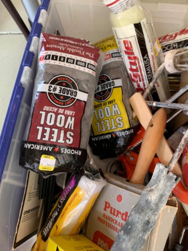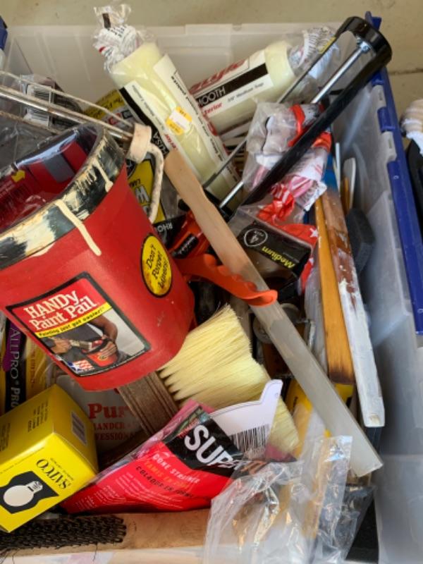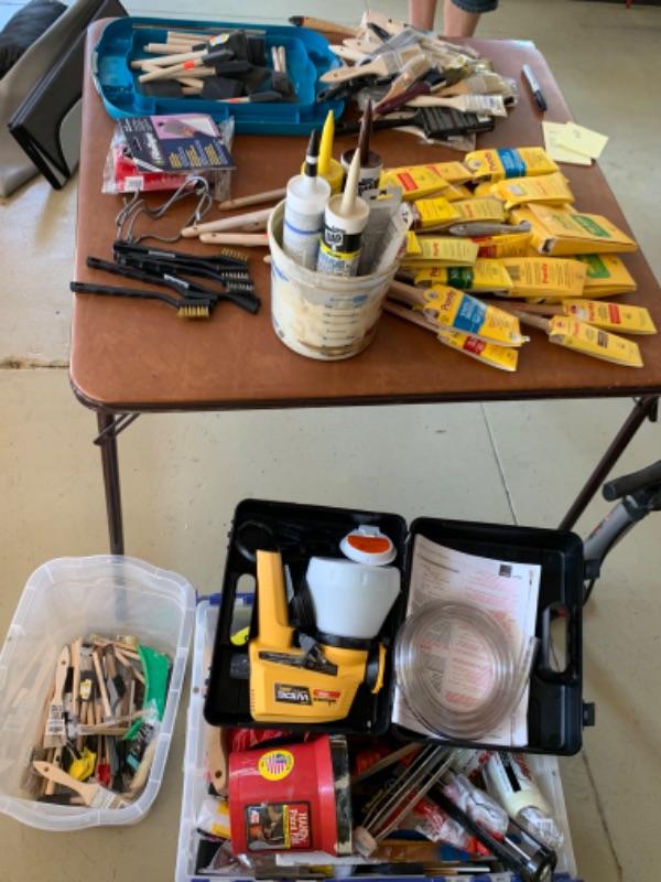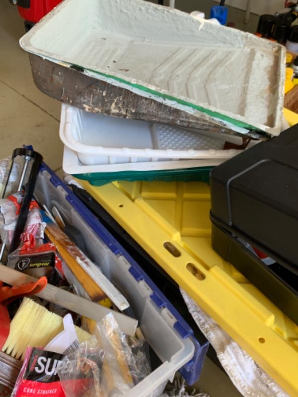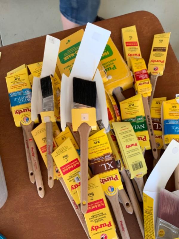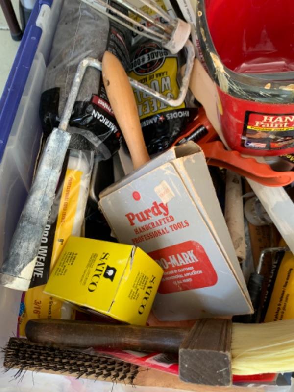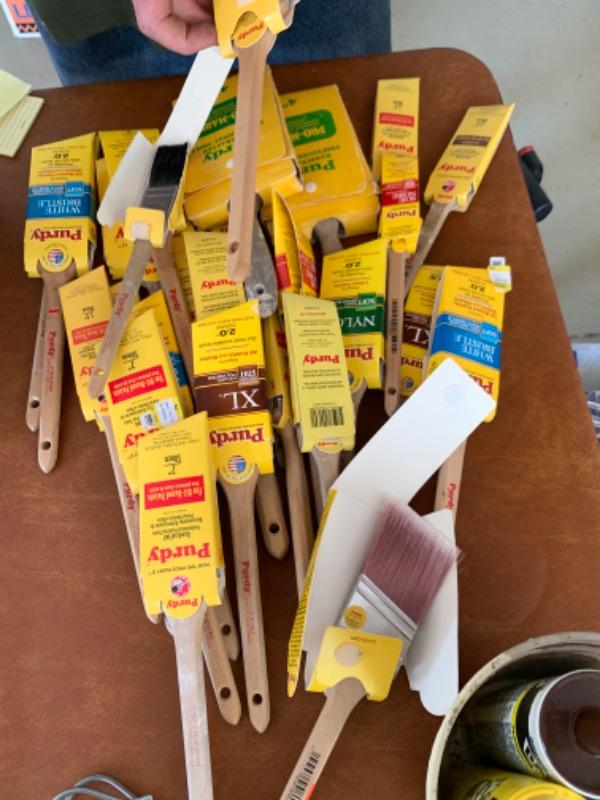 112. Large collection of painting supplies: 25 assorted Purdy brushes (new and used), trays, rollers, disposable foam brushes, caulking materials, tarps, steel wool, etc.--$295