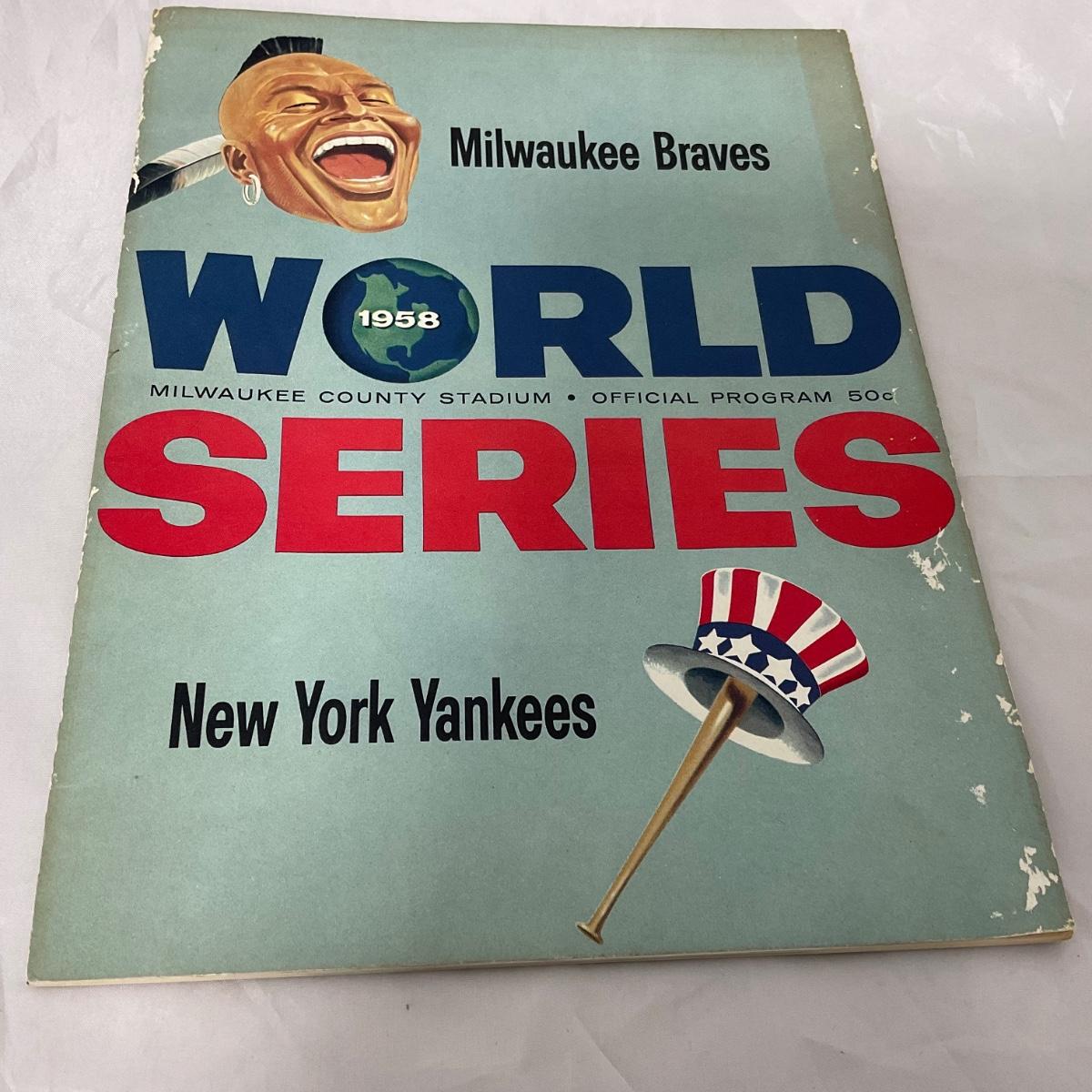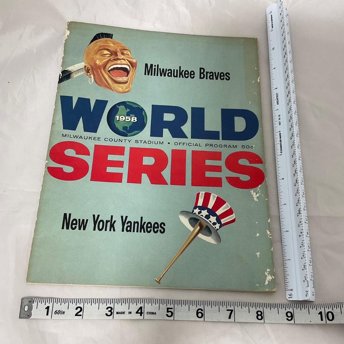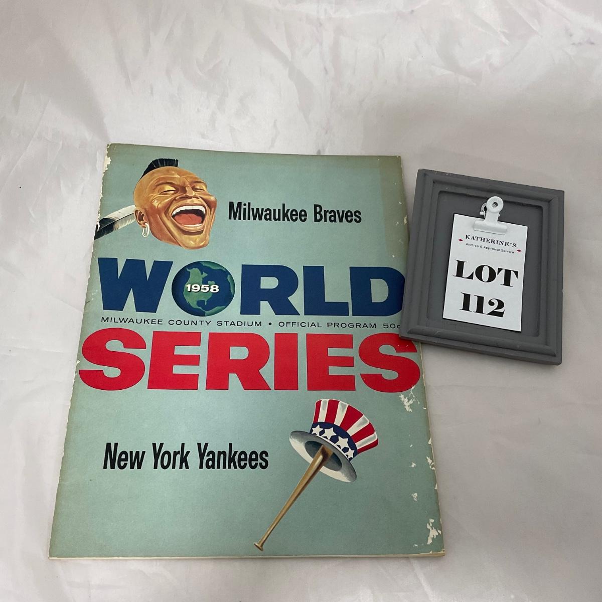 One 1958 World Series program, of Milwaukee Braves vs New York Yankees. Please see photos for details and condition. ::: Shipping is available on this lot. If you require shipping you must let us know at the close of the auction. We will coordinate with you after the item has been won. Shipping fees will include insurance up to or exceeding the value of all items being mailed. If you have any questions regarding this lot please contact the auctioneer either via this website, by direct email or by phone. PICK UP TIMES and other important information can be found in the TERMS and DESCRIPTION of the auction. Please take a look for pertinent information. Thanks!