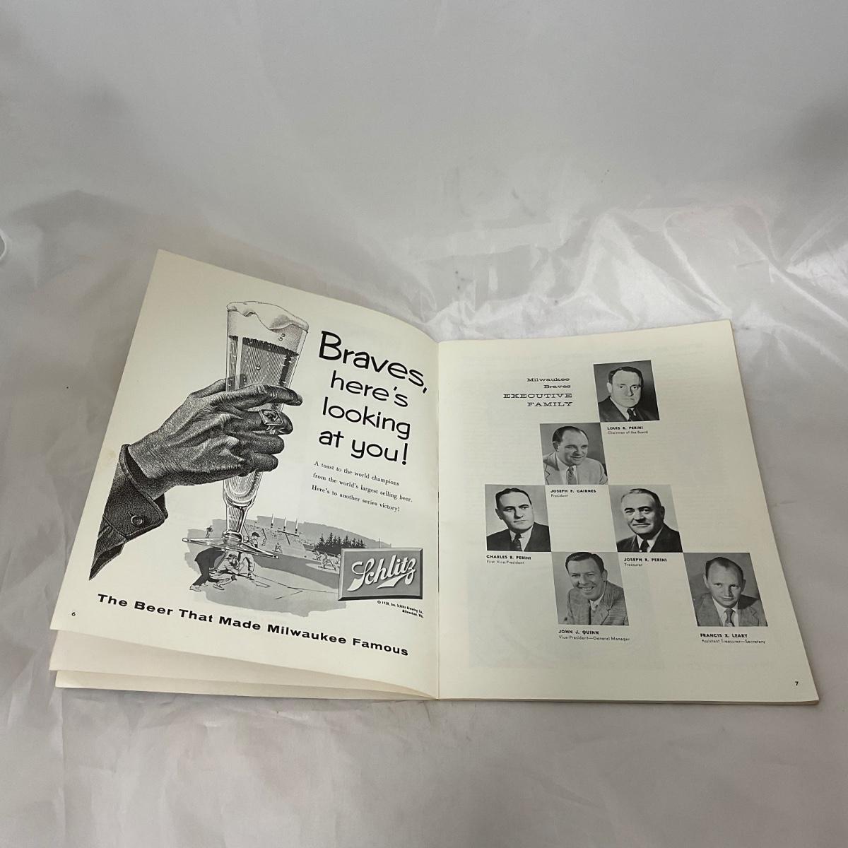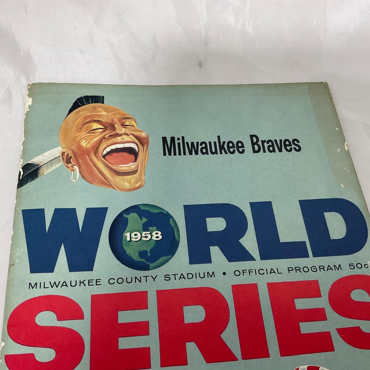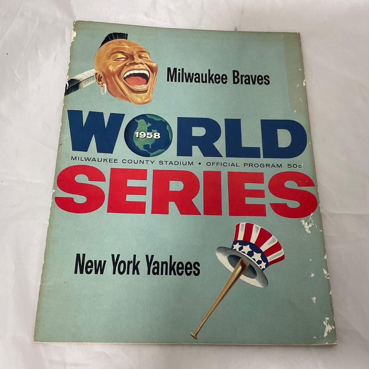 One 1958 World Series program, of Milwaukee Braves vs New York Yankees. Please see photos for details and condition. ::: Shipping is available on this lot. If you require shipping you must let us know at the close of the auction. We will coordinate with you after the item has been won. Shipping fees will include insurance up to or exceeding the value of all items being mailed. If you have any questions regarding this lot please contact the auctioneer either via this website, by direct email or by phone. PICK UP TIMES and other important information can be found in the TERMS and DESCRIPTION of the auction. Please take a look for pertinent information. Thanks!