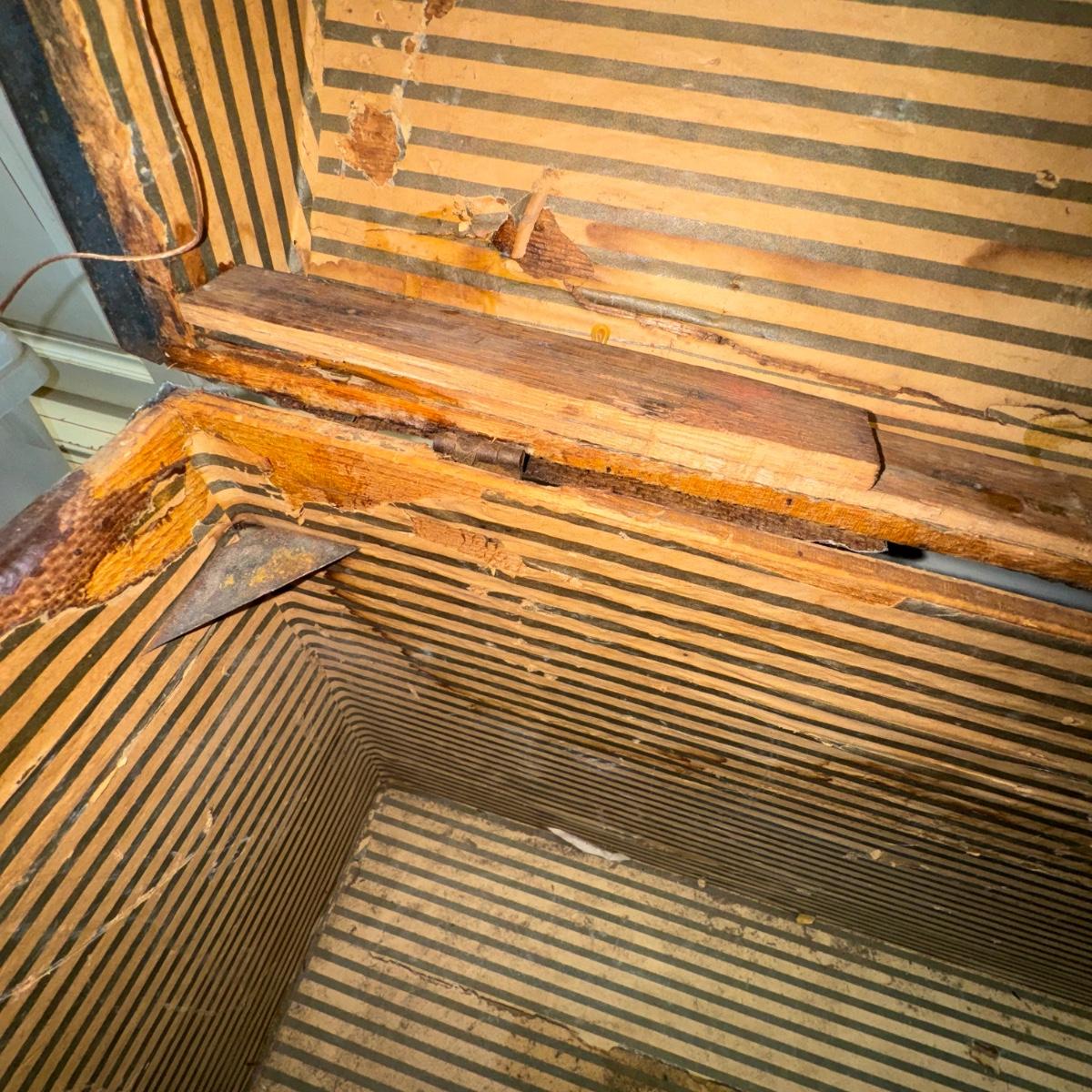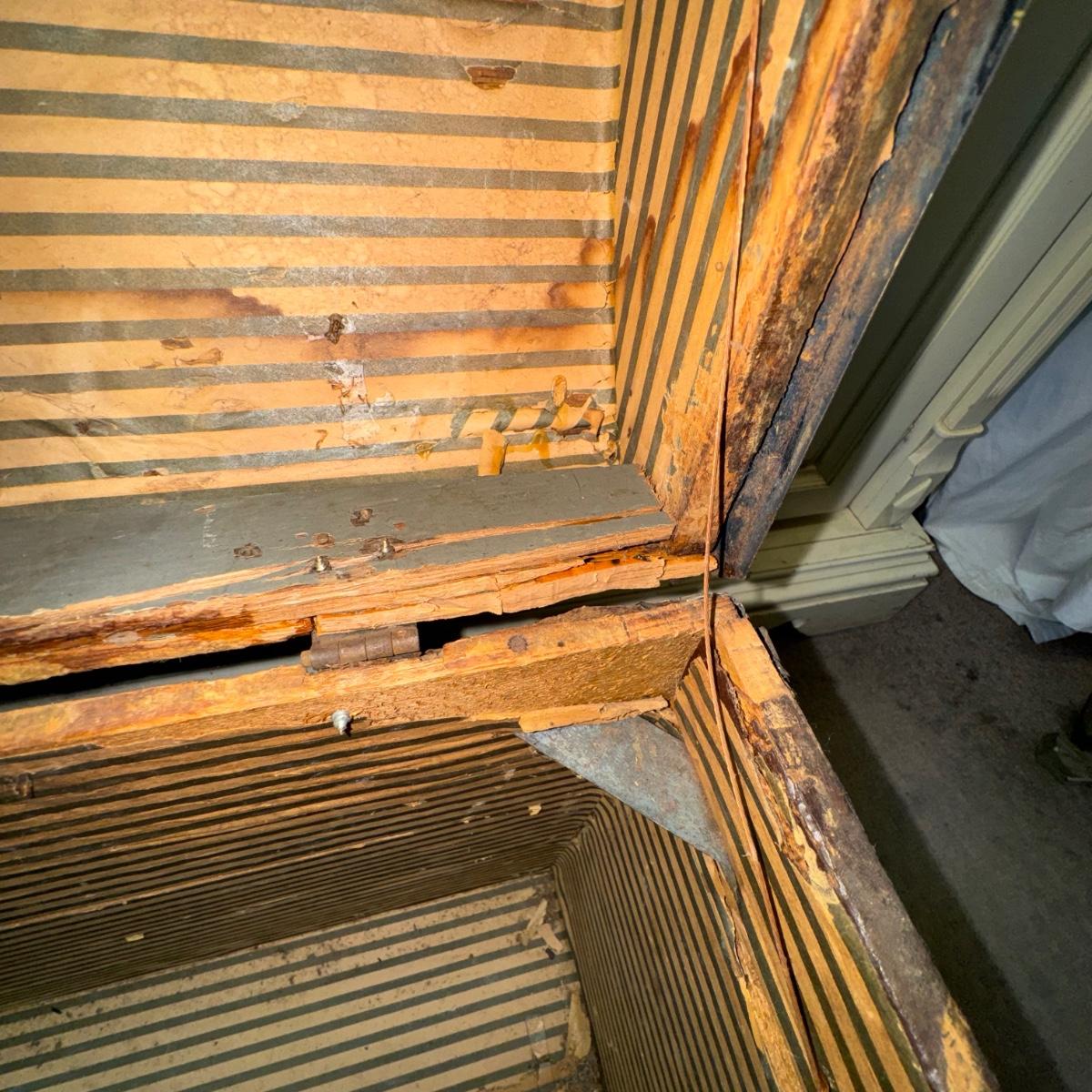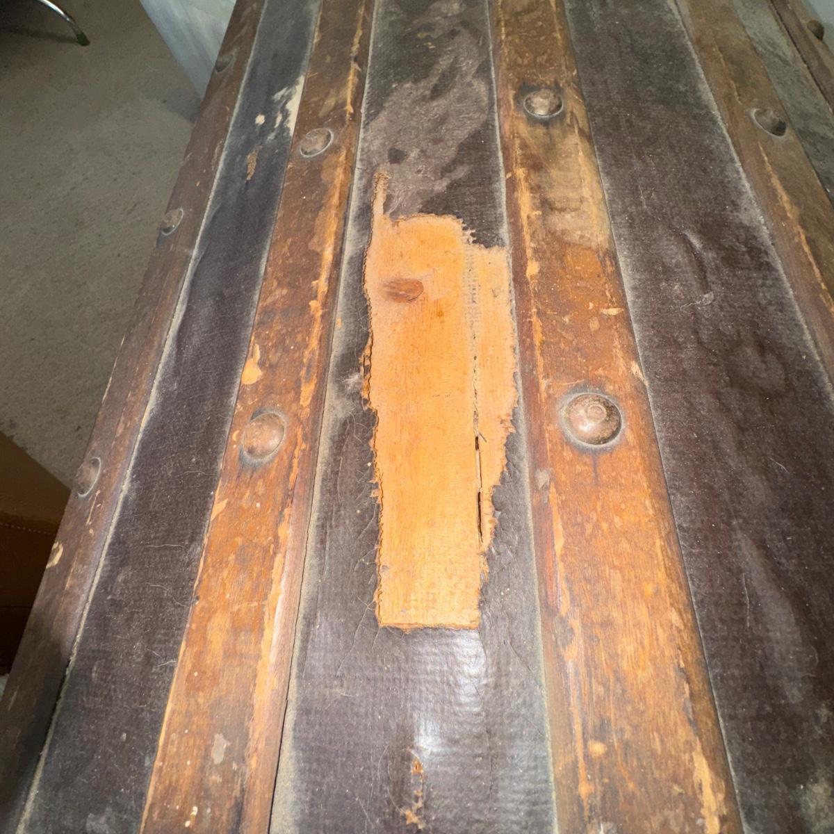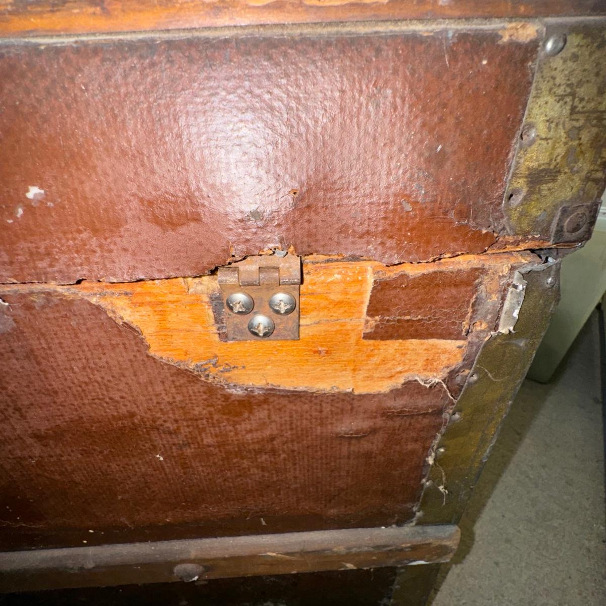 Antique Trunk. Overall good condition considering its age. Has wonderful patina. Some screws have been replace. All other hardware; hinges etc appear to be original. There are some areas where the hinges connect are damaged and the supporting wood is cracked. Also some surface areas are missing and cracked on the top, sides and back. A great collectors piece!