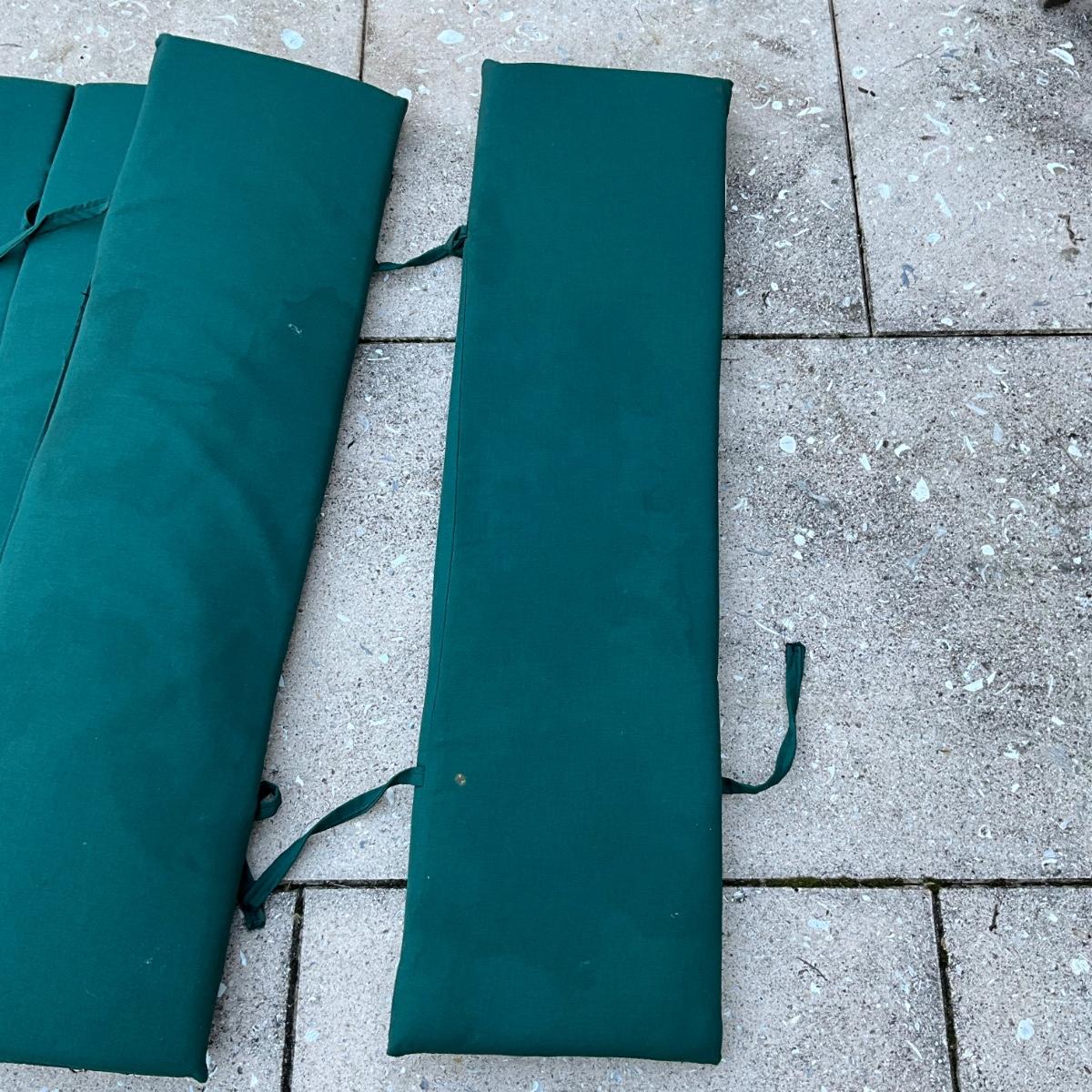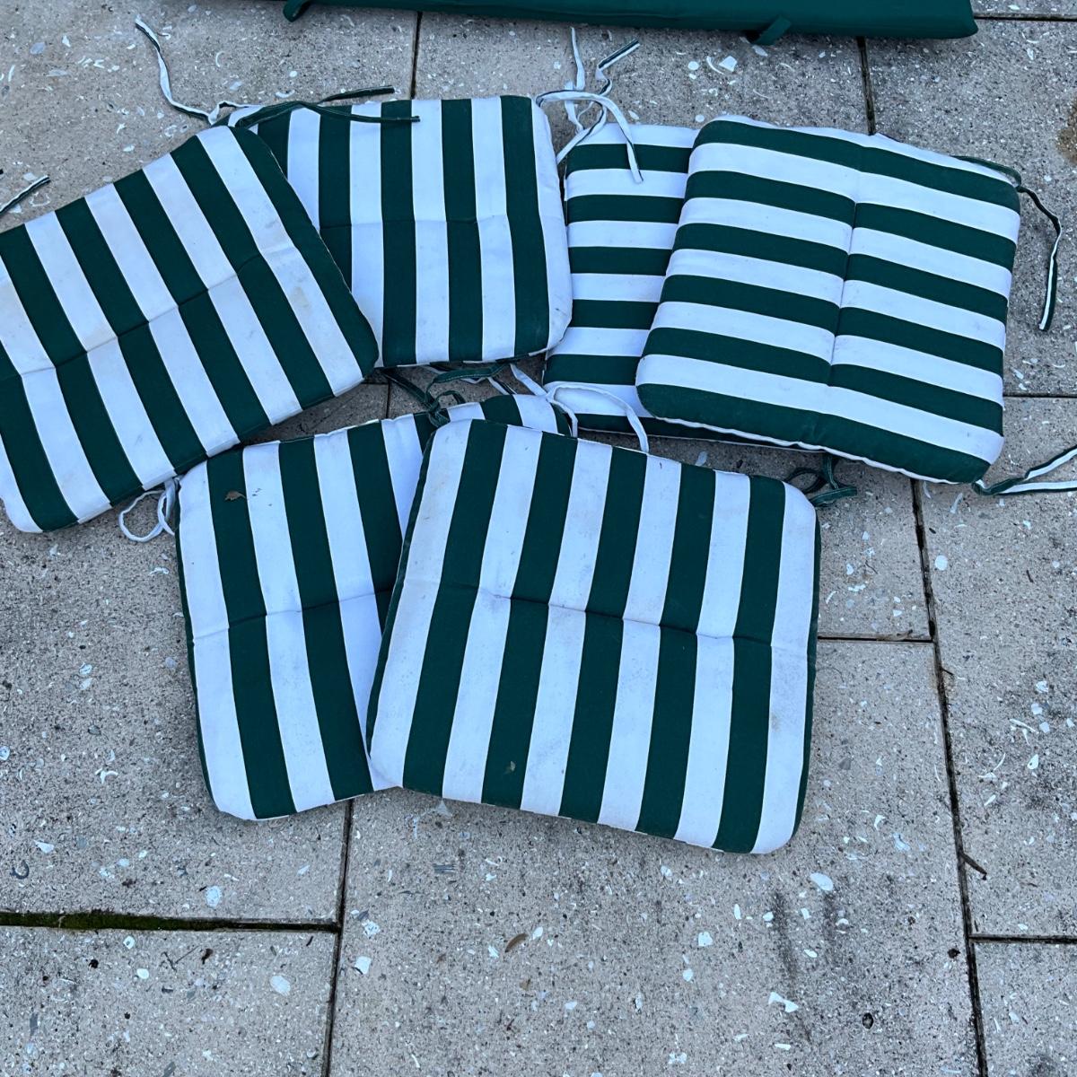 Green bench cushions measure 42" wide x 11" high , with 6 square green and white striped cushions