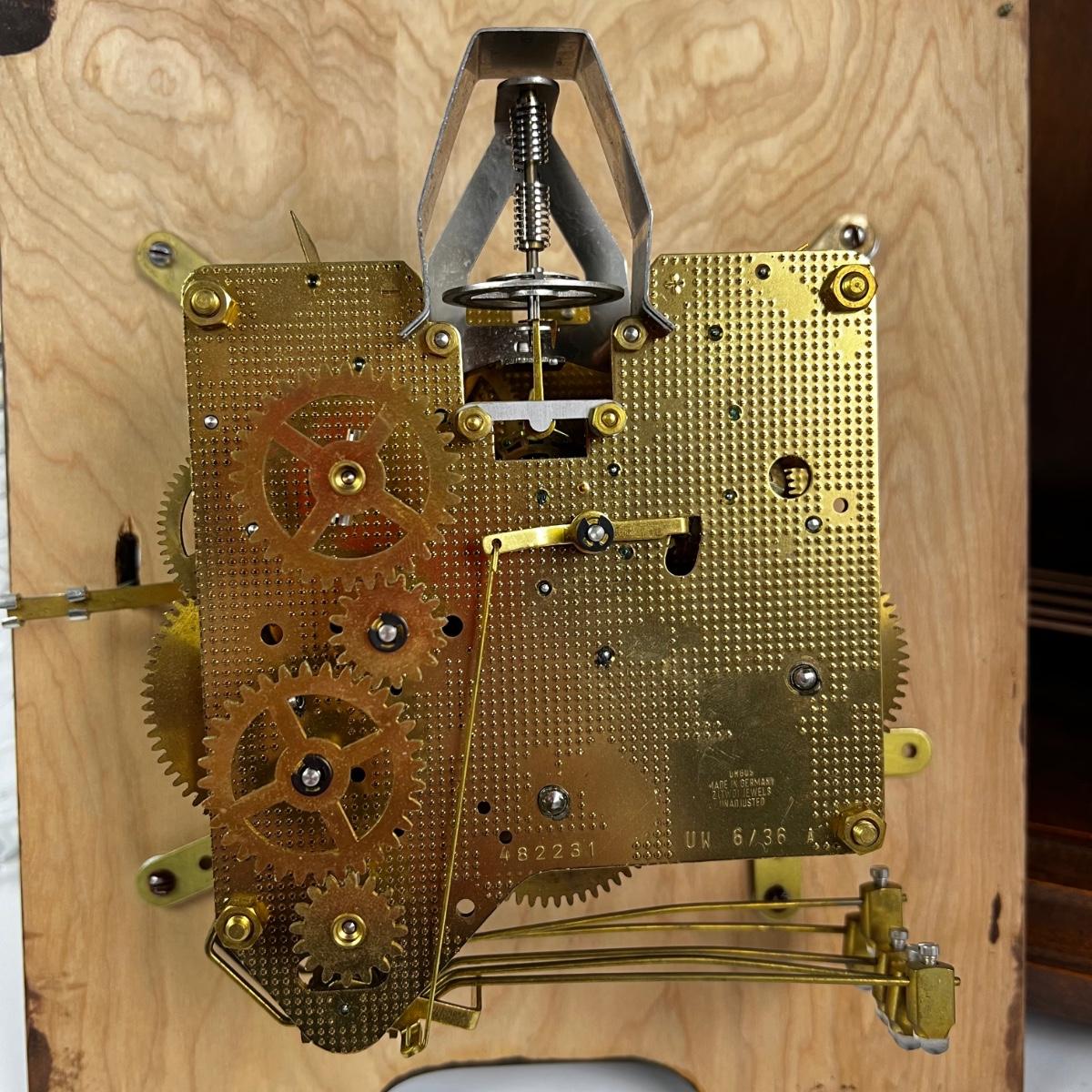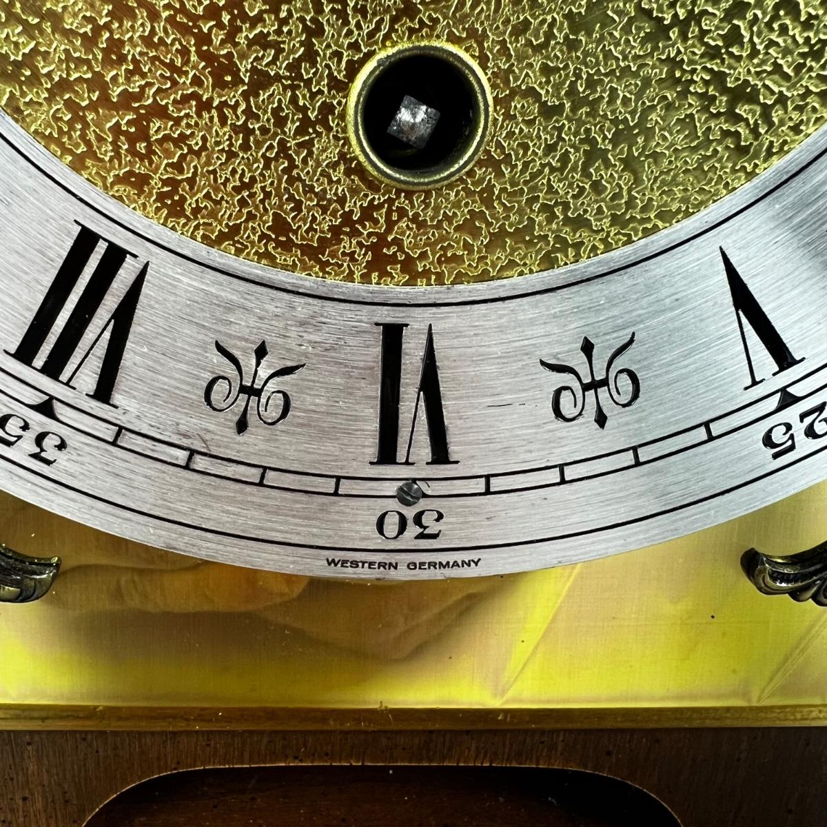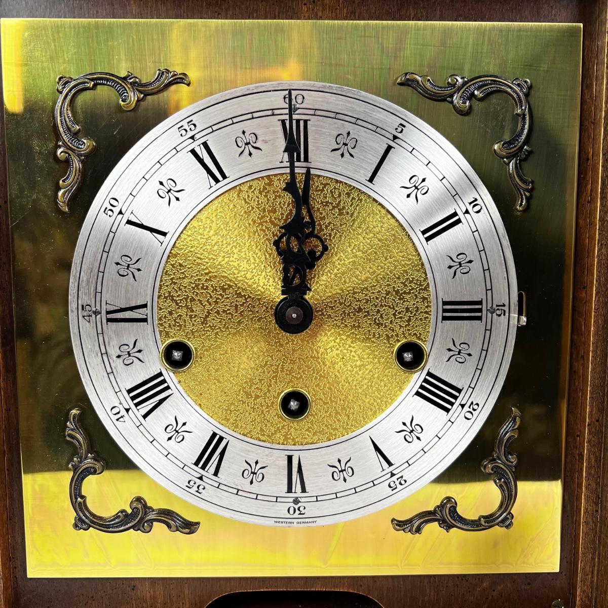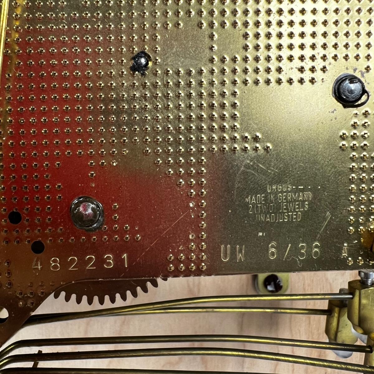 Clock is cased in wood, has a brass face, with Roman numbers. Made in Western Germany. Clock is also marked #482231.