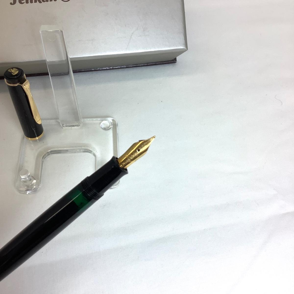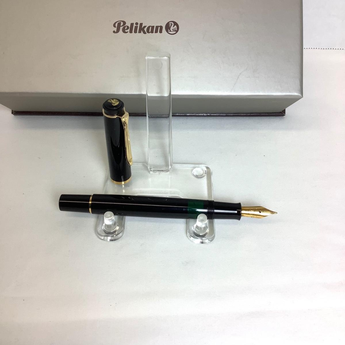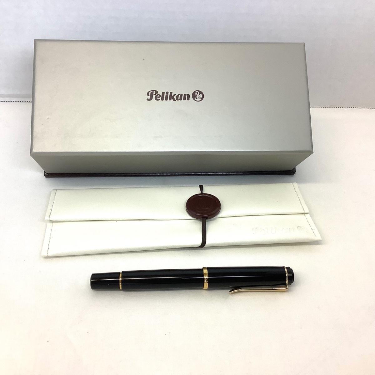The Pelikan pen is complete with leather case and original box. The pen is black and gold fountain pen.
