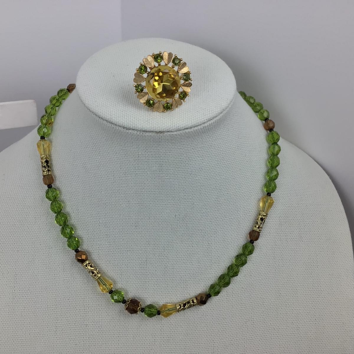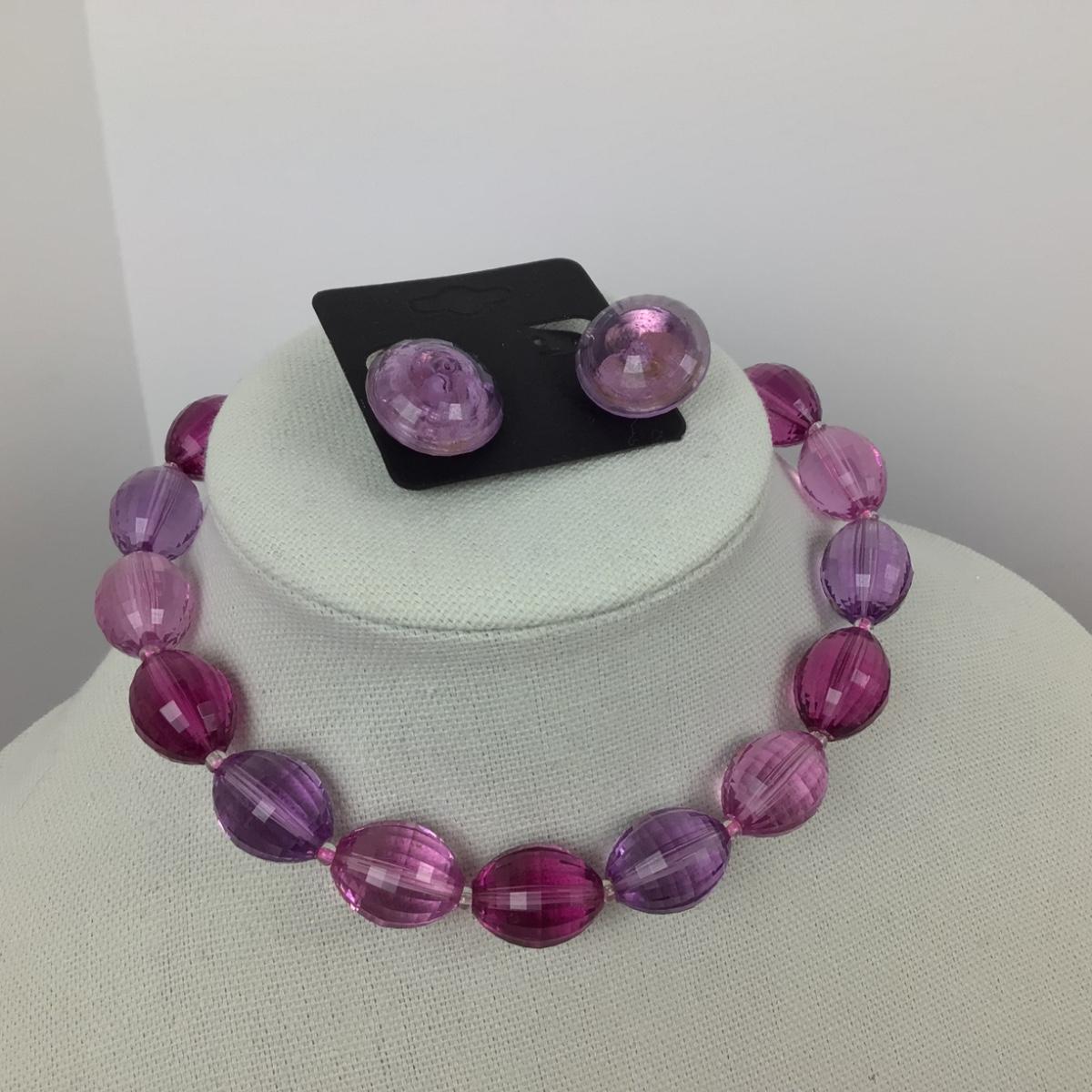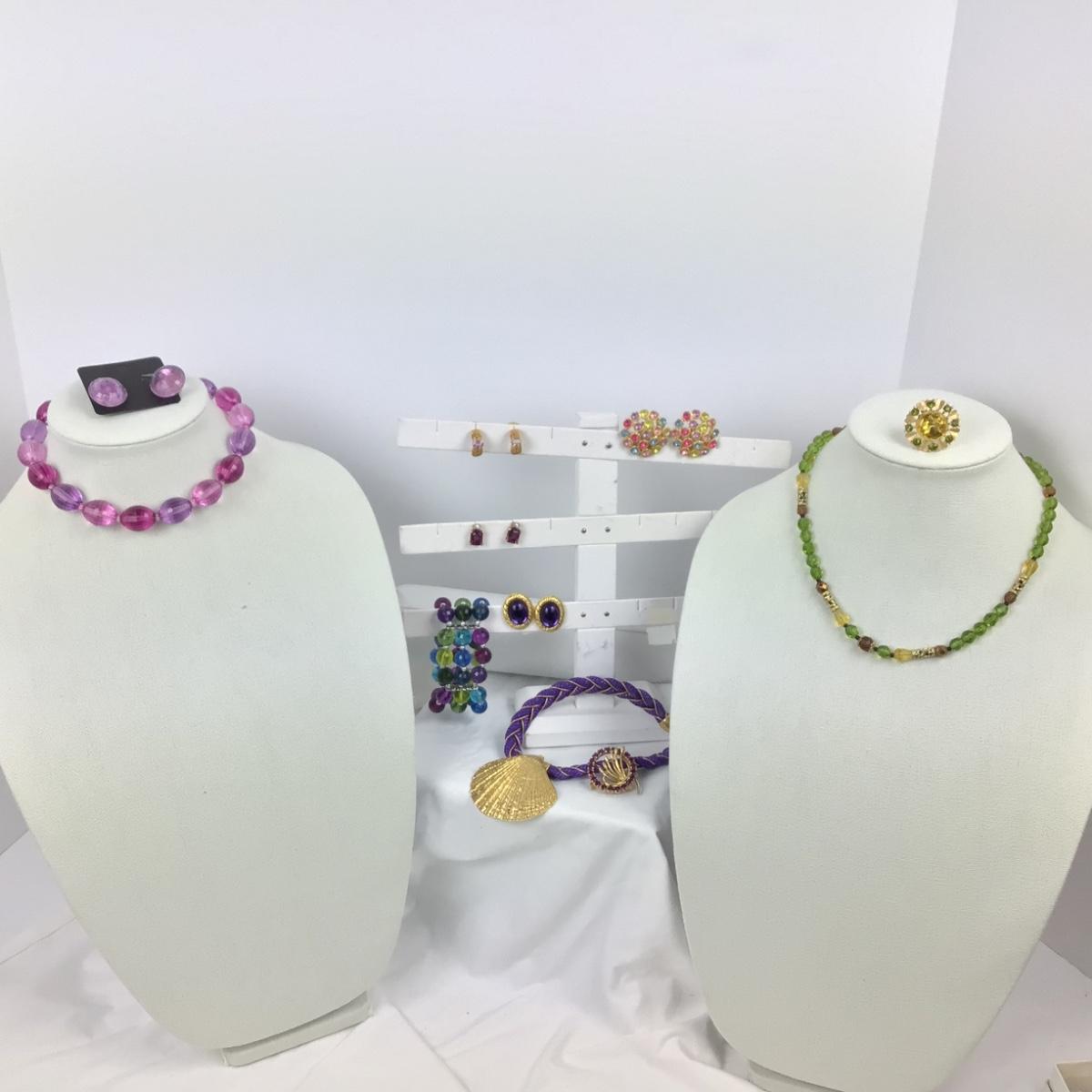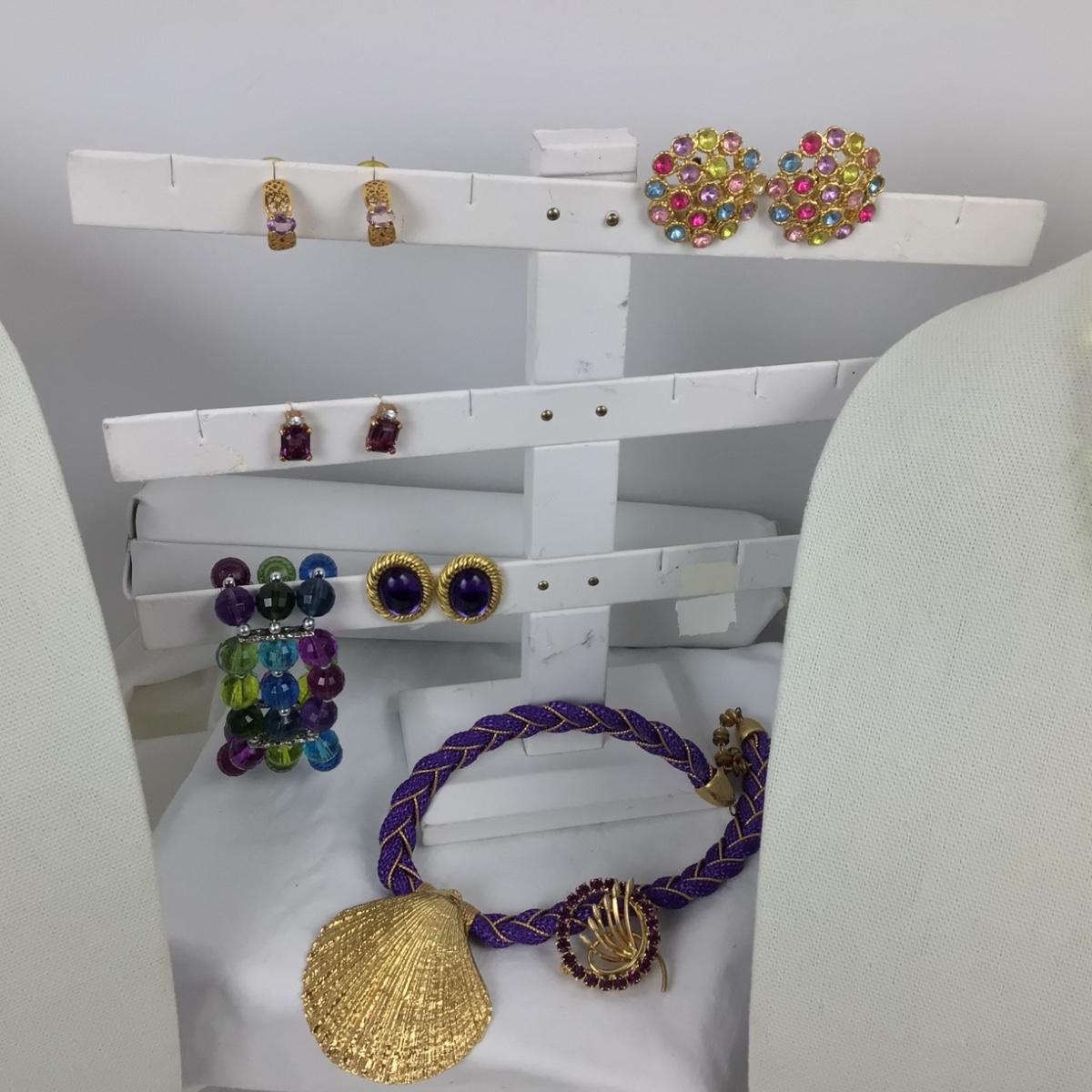 Green necklace measures 20 “ , purple plastic faceted necklace measures 16” long , purple shell rope necklace is 20” with two pairs of clip earrings , one stretch bracelet and two brooches