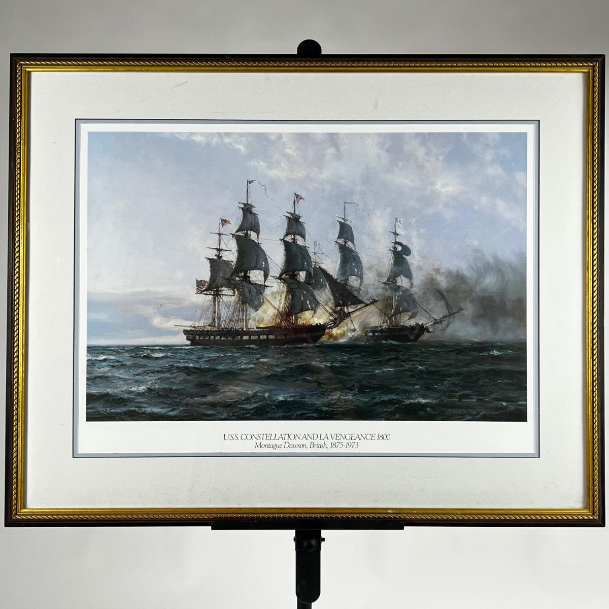 Vintage Nautical Print of U.S.S. Constellation and La Vengeance battling 1800 by Montague Dawson.