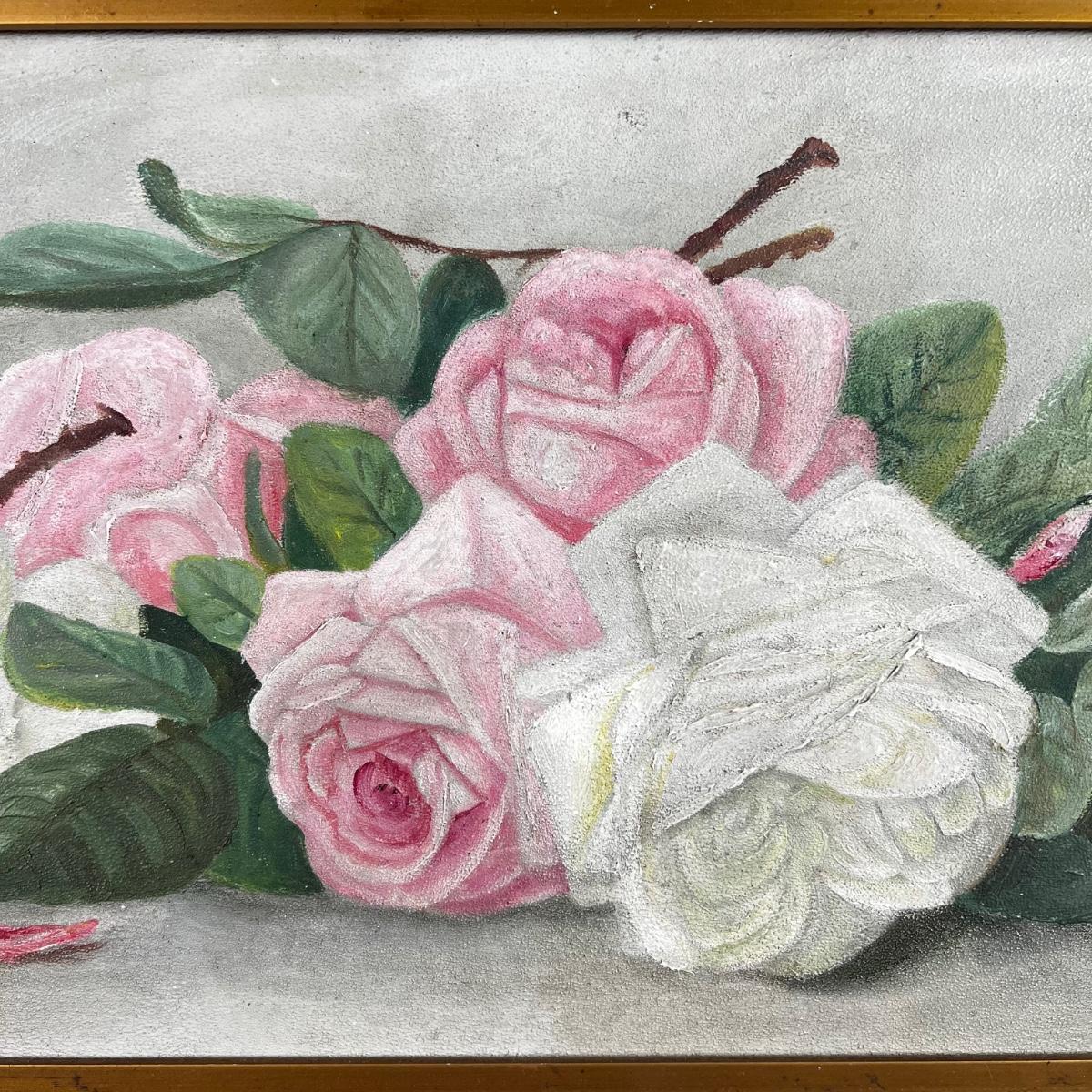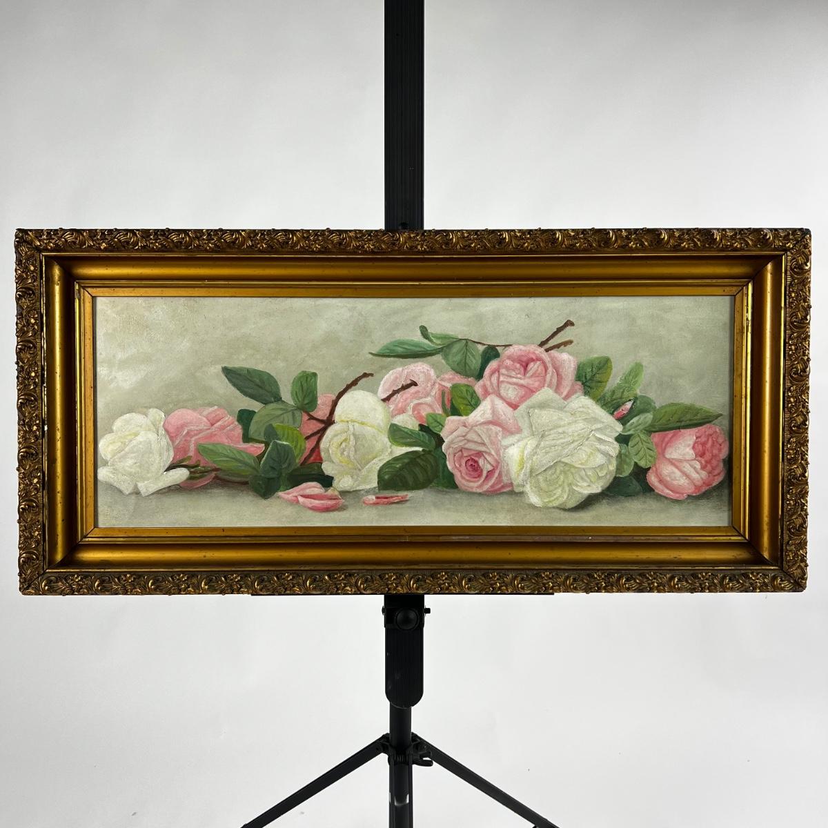 Antique Original Oil Painting of Roses in a gold decorative frame.