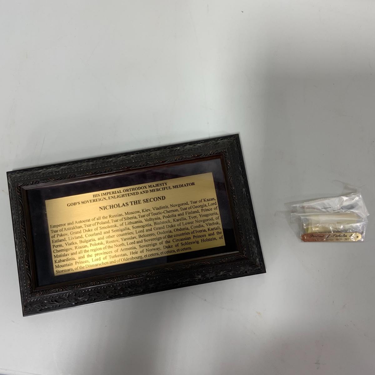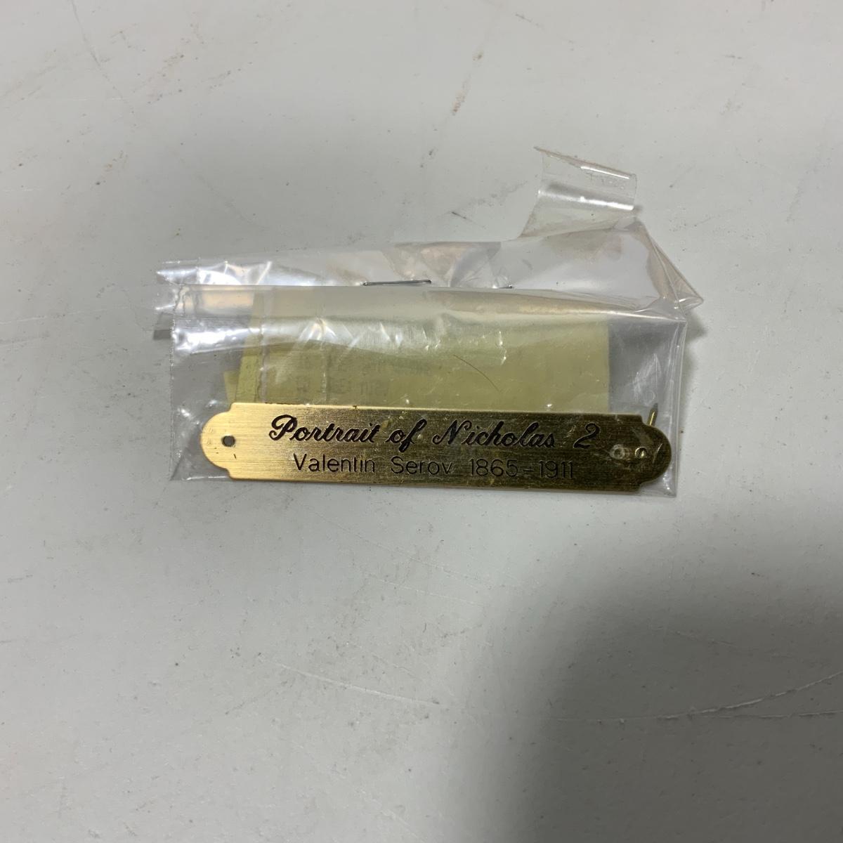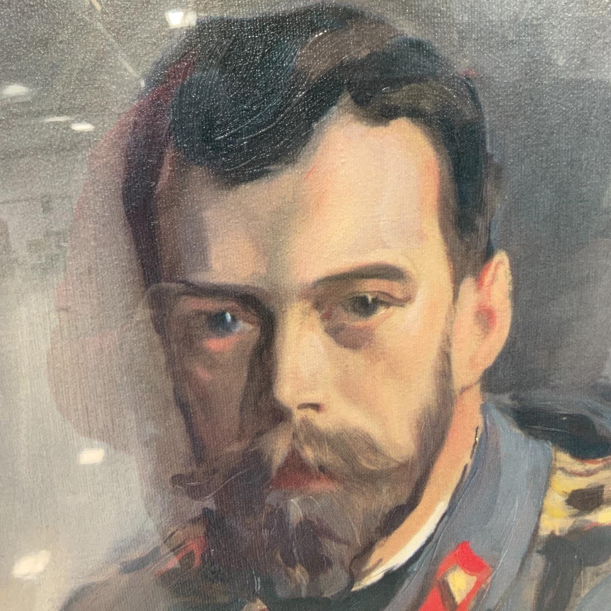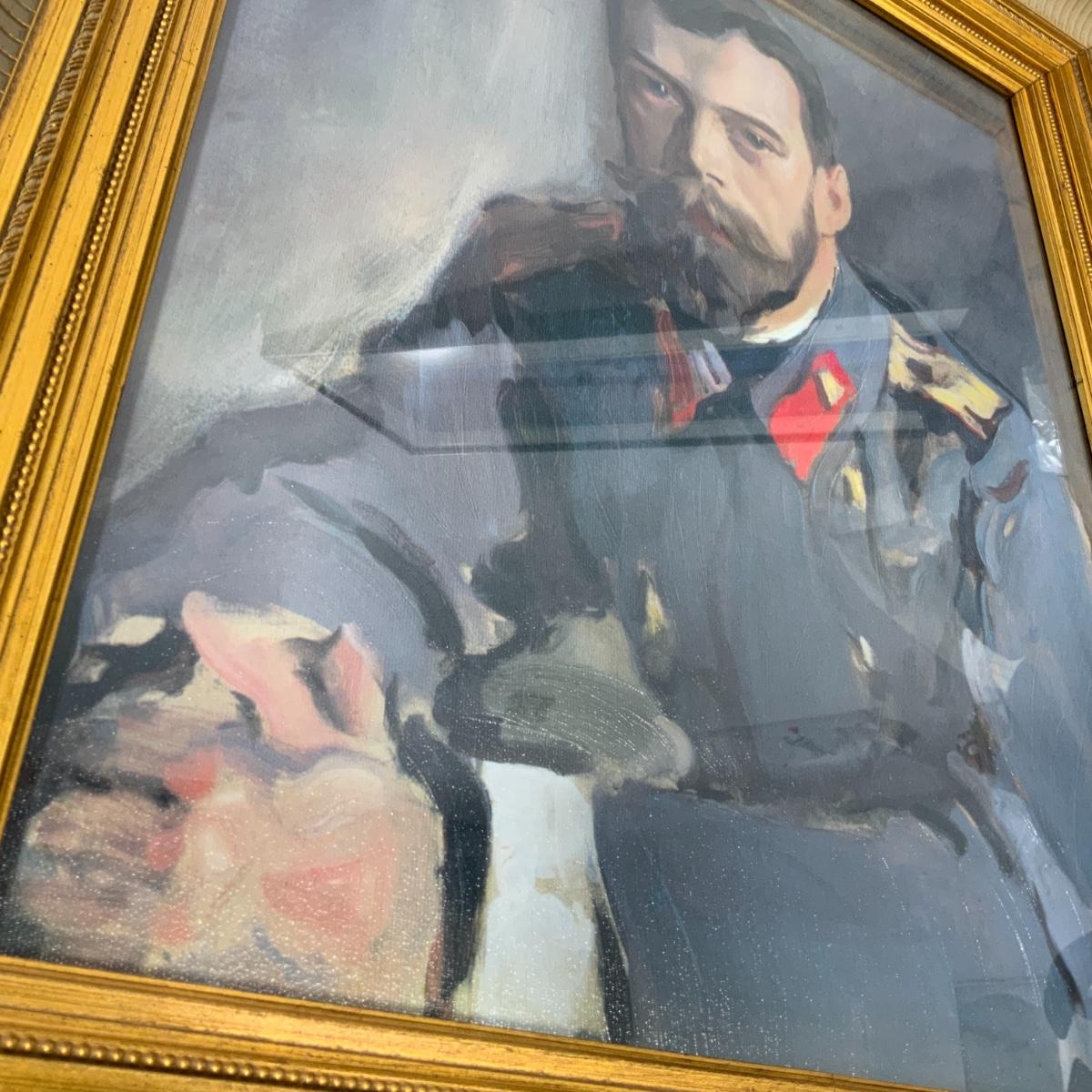 From the Estate of Peter and Alice Radovanovich: Exceptional Reproduction, Expertly framed Oil Painting of Czar Nicholas II by Serov. Painted originally in 1900 this is how history will remember him. Framed under Conservation Glass by a reputable local frame shop. This piece comes with two plaques, one framed - to make a bold statement, and one smaller - for those with space constraints. The frame measures 27” x 22”. The larger plaque measures 12” x 7”. The painting has been printed onto a stretched canvas and treated with an over coating to simulate brush strokes. Please see photos for details and condition. ::: Shipping is available on this lot. If you require shipping you must let us know at the close of the auction. We will coordinate with you after the item has been won. Shipping fees will include insurance up to or exceeding the value of all items being mailed. If you have any questions regarding this lot please contact the auctioneer either via this website, by direct email or by phone. PICK UP TIMES and other important information can be found in the TERMS and DESCRIPTION of the auction. Please take a look for pertinent information. Thanks!