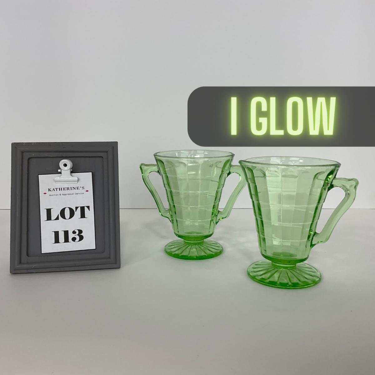 Two pieces of Anchor Hocking Glass Co. Optic Block creamer and sugar. I am Uranium glass so I DO GLOW under blacklight. Please see photos for details and condition. ::: Shipping is available on this lot. If you require shipping you must let us know at the close of the auction. We will coordinate with you after the item has been won. Shipping fees will include insurance up to or exceeding the value of all items being mailed. If you have any questions regarding this lot please contact the auctioneer either via this website, by direct email or by phone. PICK UP TIMES and other important information can be found in the TERMS and DESCRIPTION of the auction. Please take a look for pertinent information. Thanks!