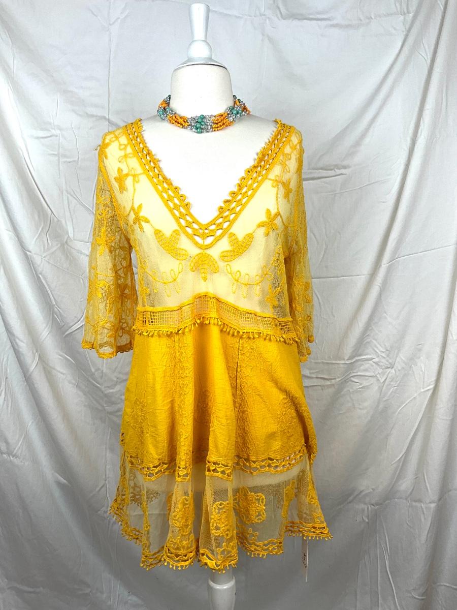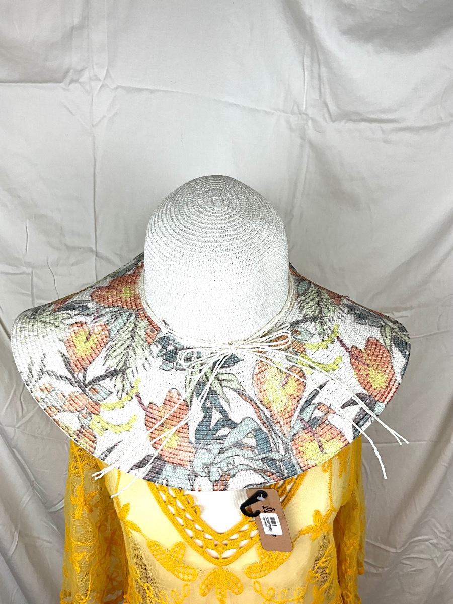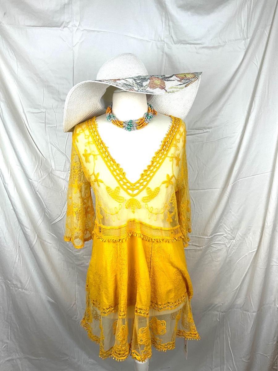113 Yellow Lace Pullover with Beaded Necklace and Floral Sunhat