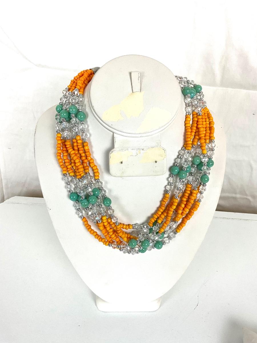 Turquoise and yellow beaded necklace with large floral sun wrap
