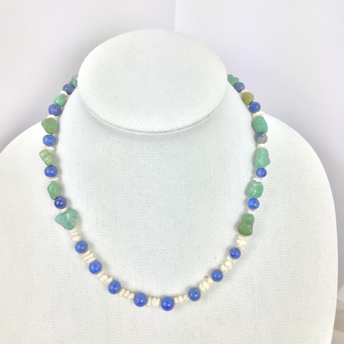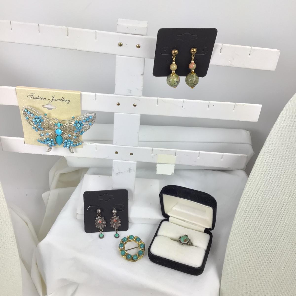 Pearl, turquoise, lapis necklace with Turquoise and coral double strand necklace, turquoise sterling ring, sterling turquoise and coral pierced earrings, costume stone bracelet and brooch