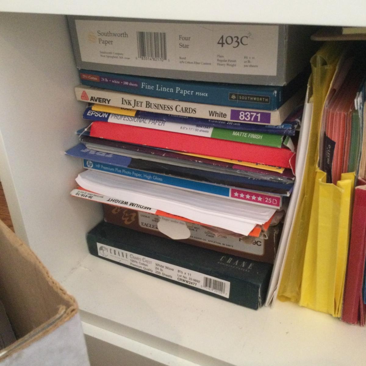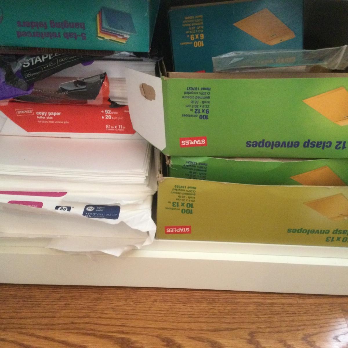 Large lot-entire contents of shelf-assorted printer paper, writing paper, envelopes of all sizes and shipping envelopes and mailers.