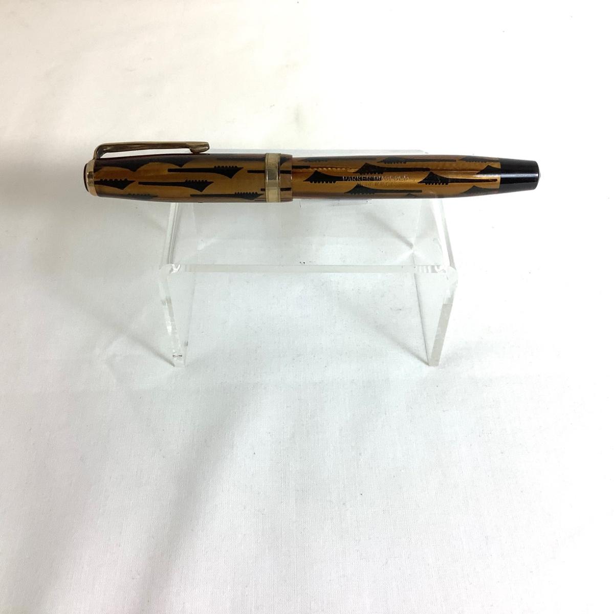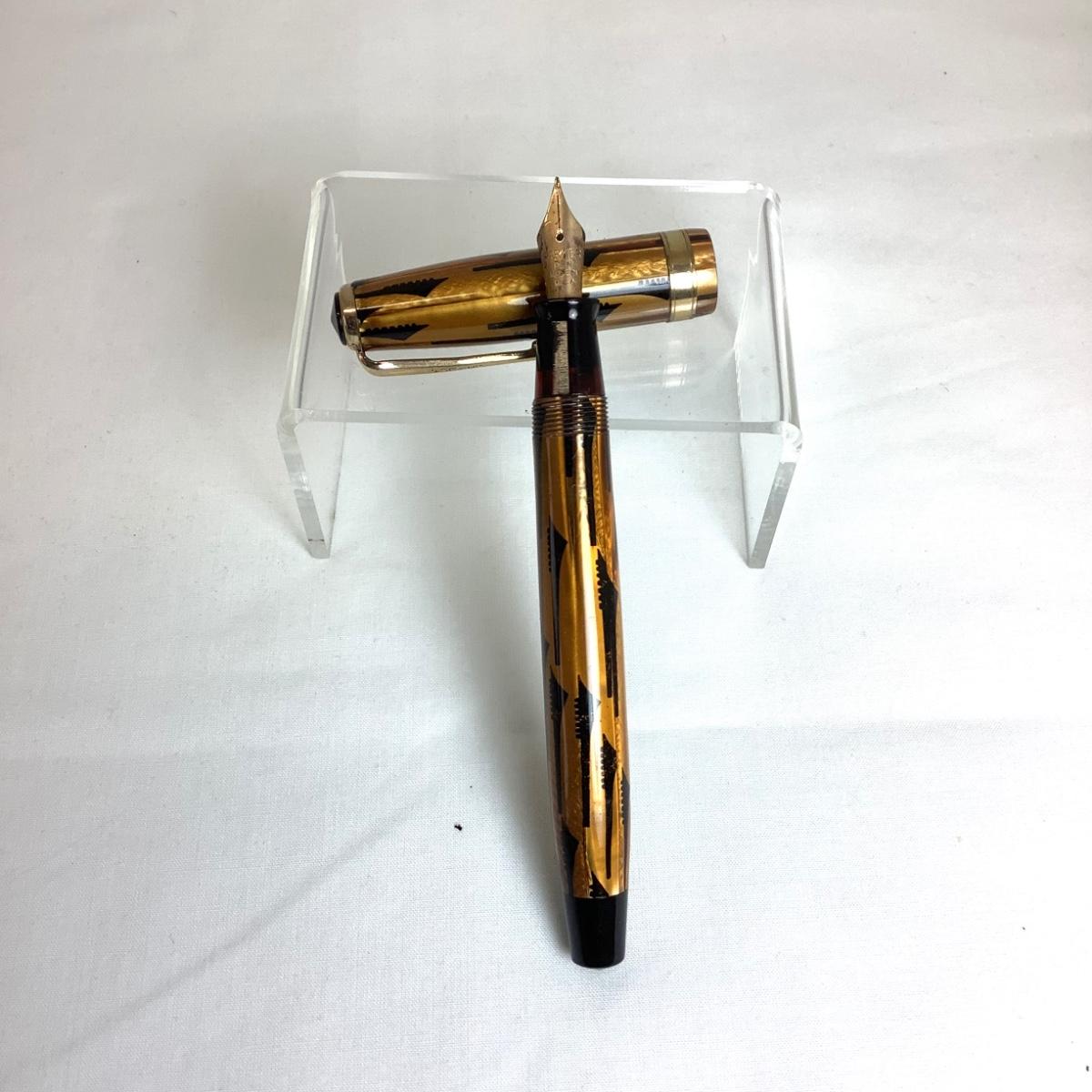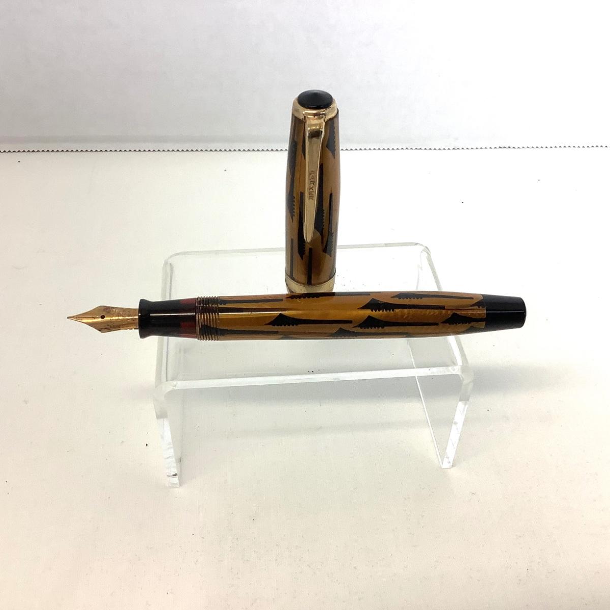 The fountain pen is brown and gold with geometric toothbrush pattern, circa 1940, it has been inked, it is in great condition-wear consistent with age.