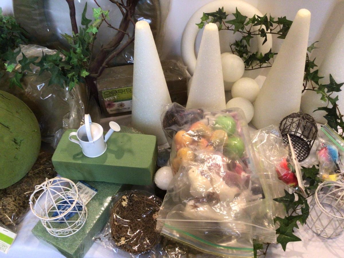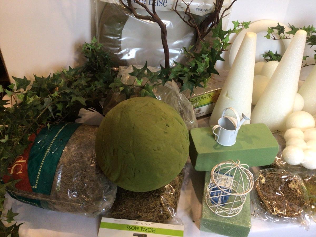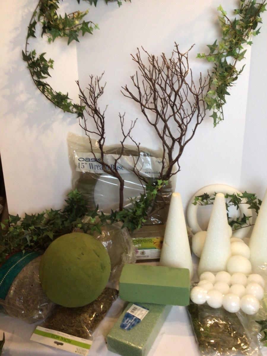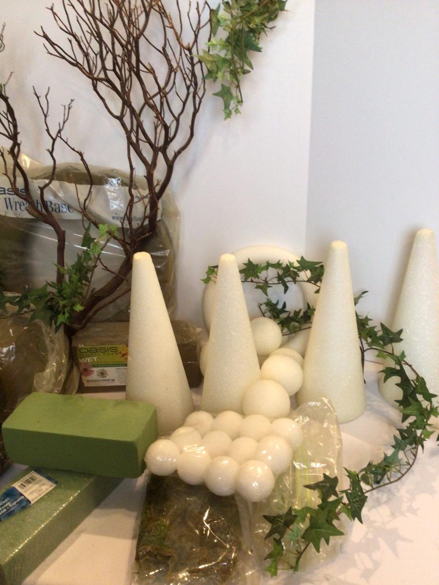 Large lot of Oasis, wreath, styrofoam molds for arranging, ivy and large decorative branch.
