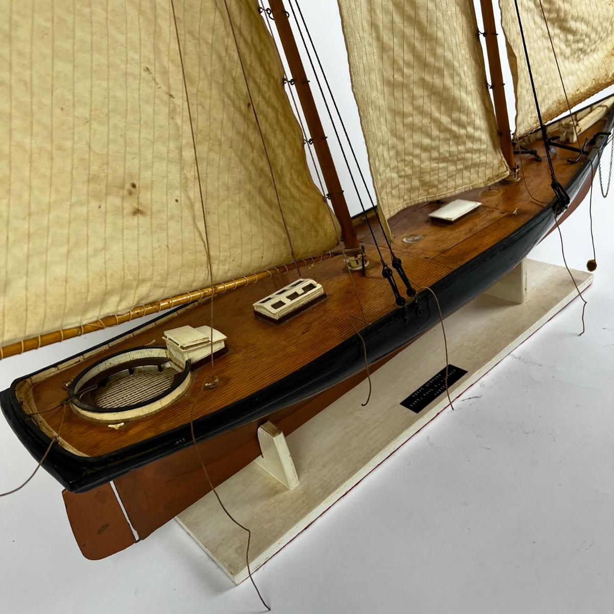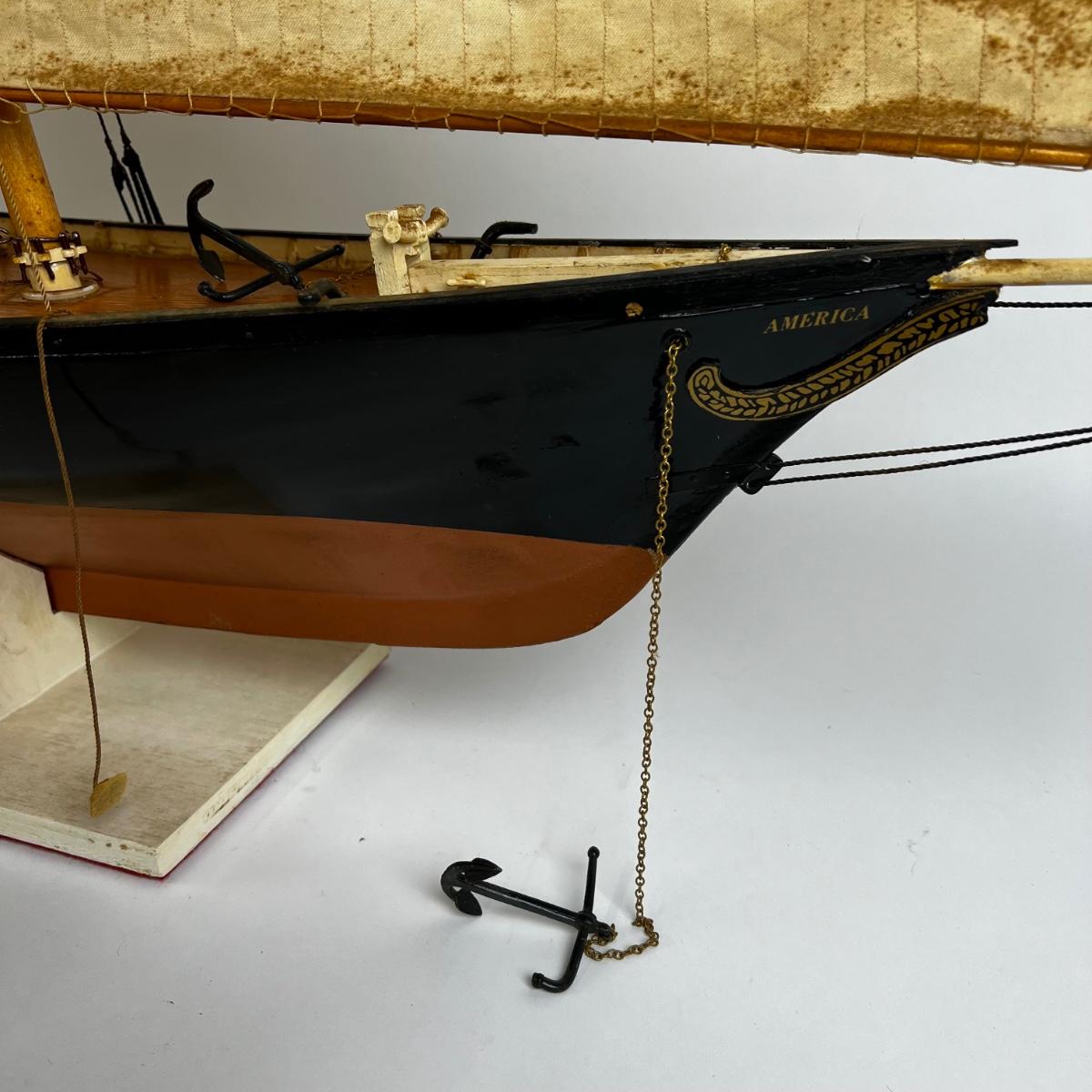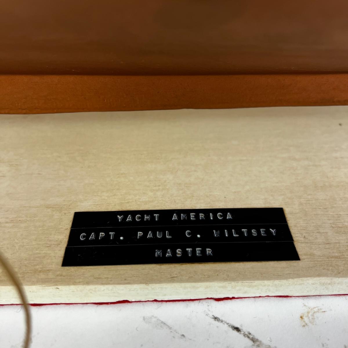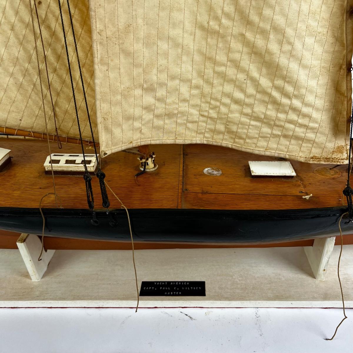 Ship model labeled Yacht America Paul C. Wiltsey Master. The ship name is America. The canvas sails have foxing, and there is a bag of broken on pieces for anyone planning to repair the ship.