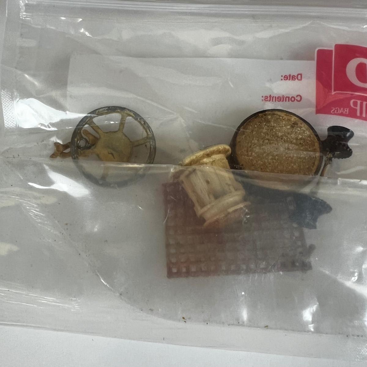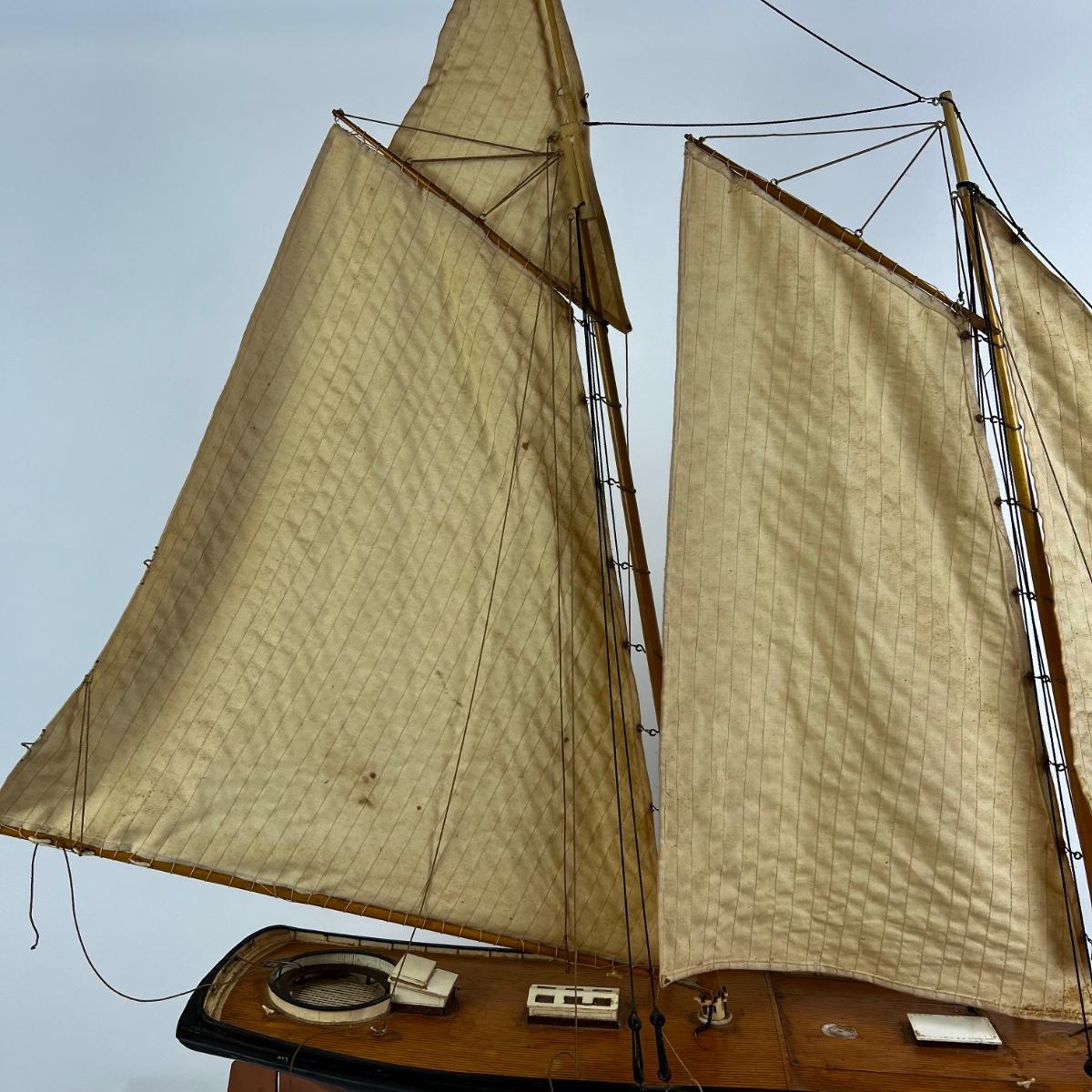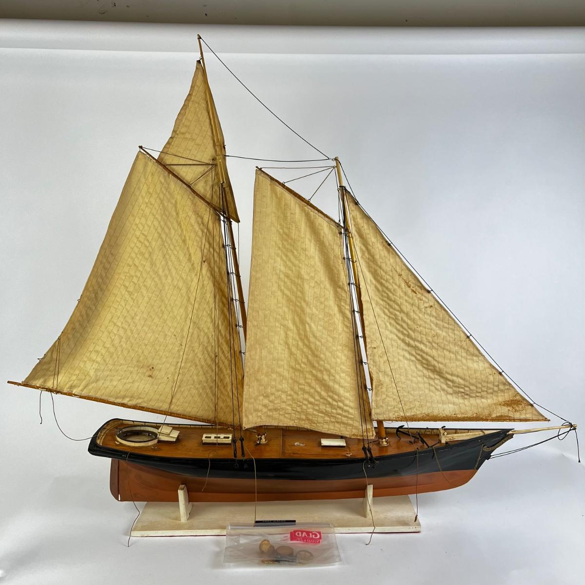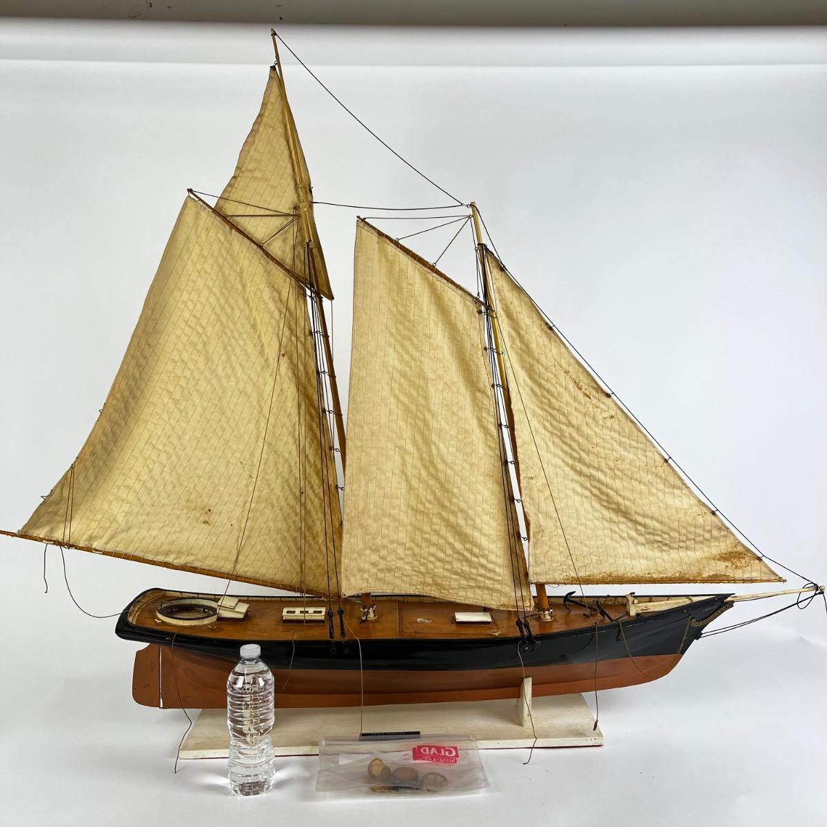 Ship model labeled Yacht America Paul C. Wiltsey Master. The ship name is America. The canvas sails have foxing, and there is a bag of broken on pieces for anyone planning to repair the ship.