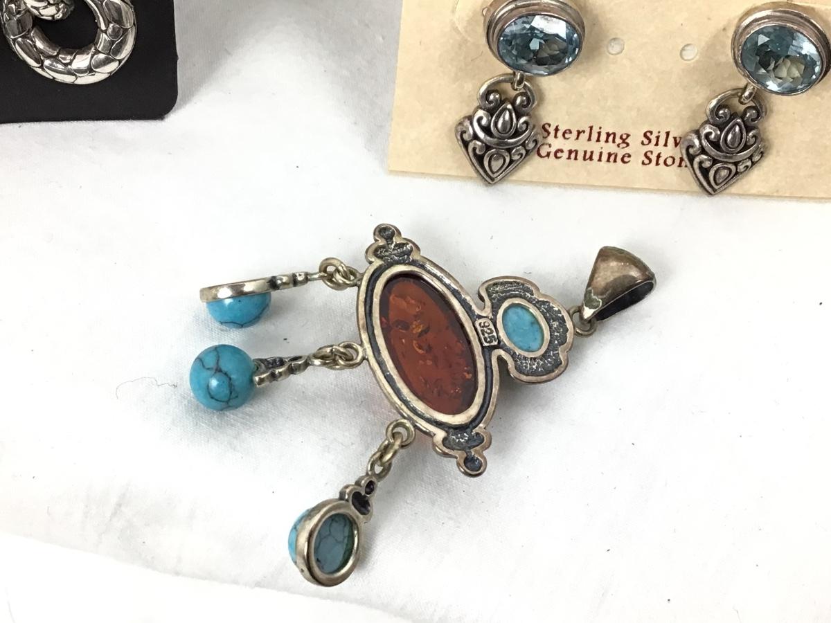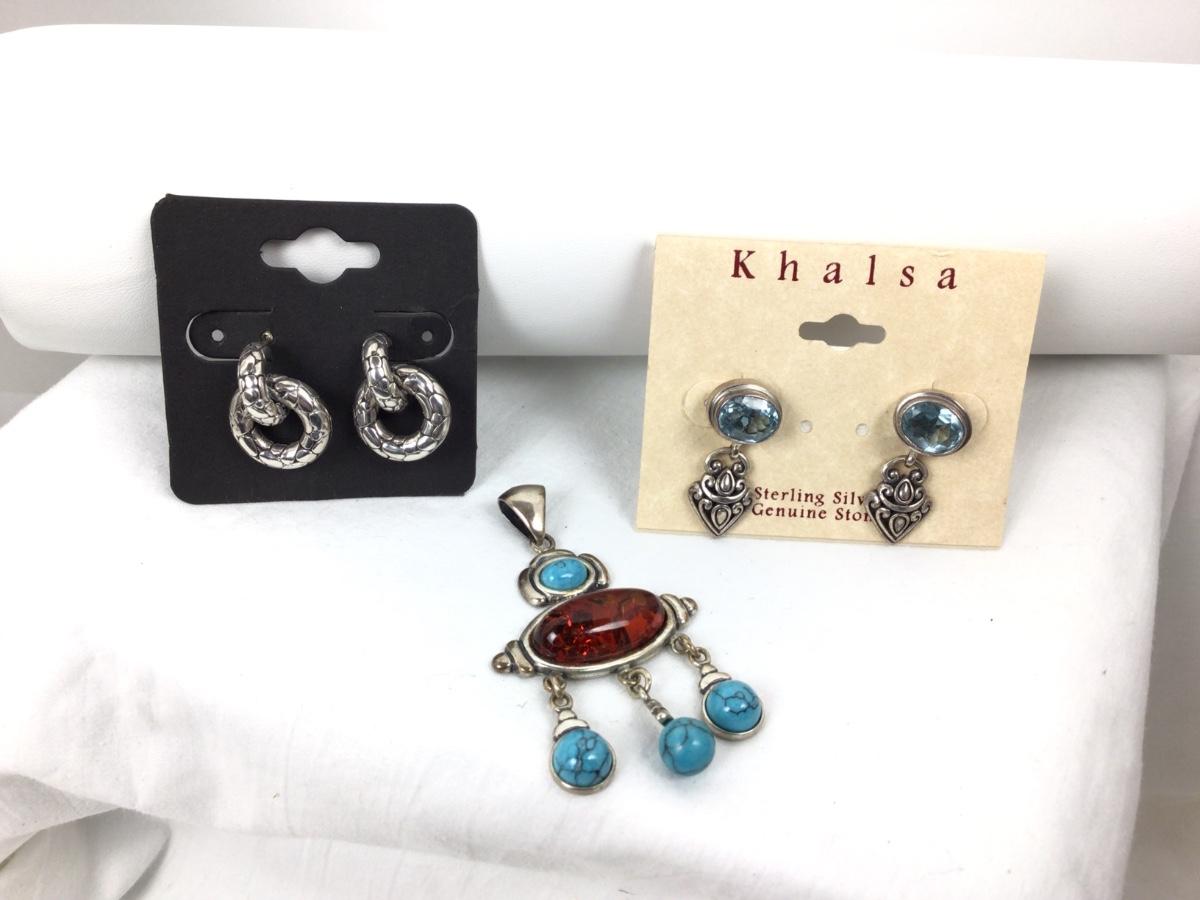1138 Sterling Earrings , Turquoise, Amber Pendant