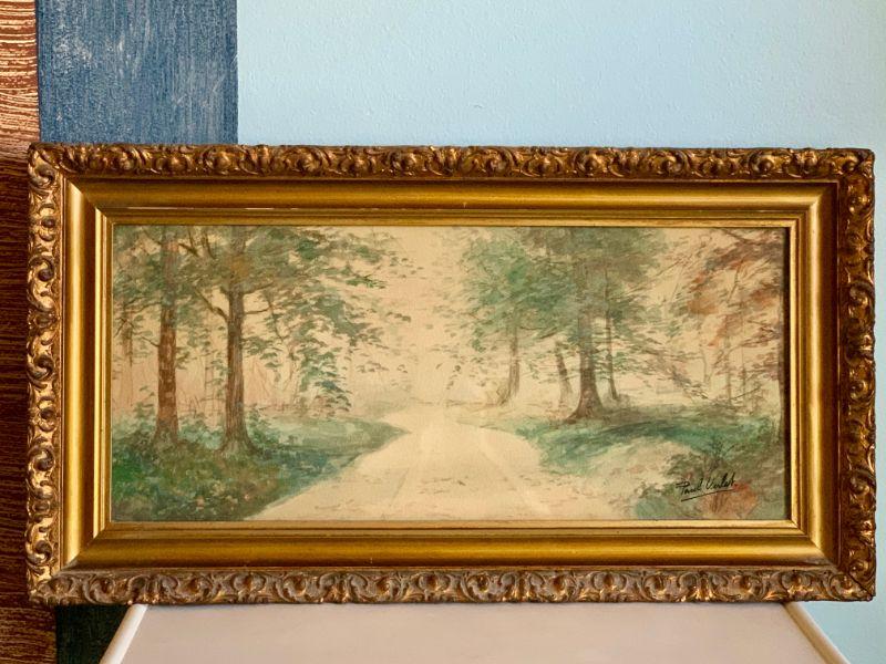 Antique framed water color by Paul Verlet. Listed American artist. Country road through trees. 26"x14" framed size.