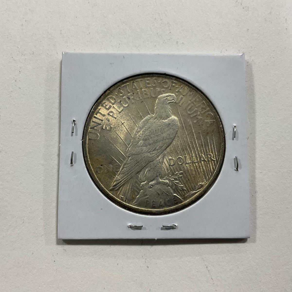 One 1923 Peace Dollar Some Obverse Spotting Solid Eagle Feathers coin. Please see photos for details and condition. ::: Shipping is available on this lot. If you require shipping you must let us know at the close of the auction. We will coordinate with you after the item has been won. Shipping fees will include insurance up to or exceeding the value of all items being mailed. If you have any questions regarding this lot please contact the auctioneer either via this website, by direct email or by phone. PICK UP TIMES and other important information can be found in the TERMS and DESCRIPTION of the auction. Please take a look for pertinent information. Thanks!
