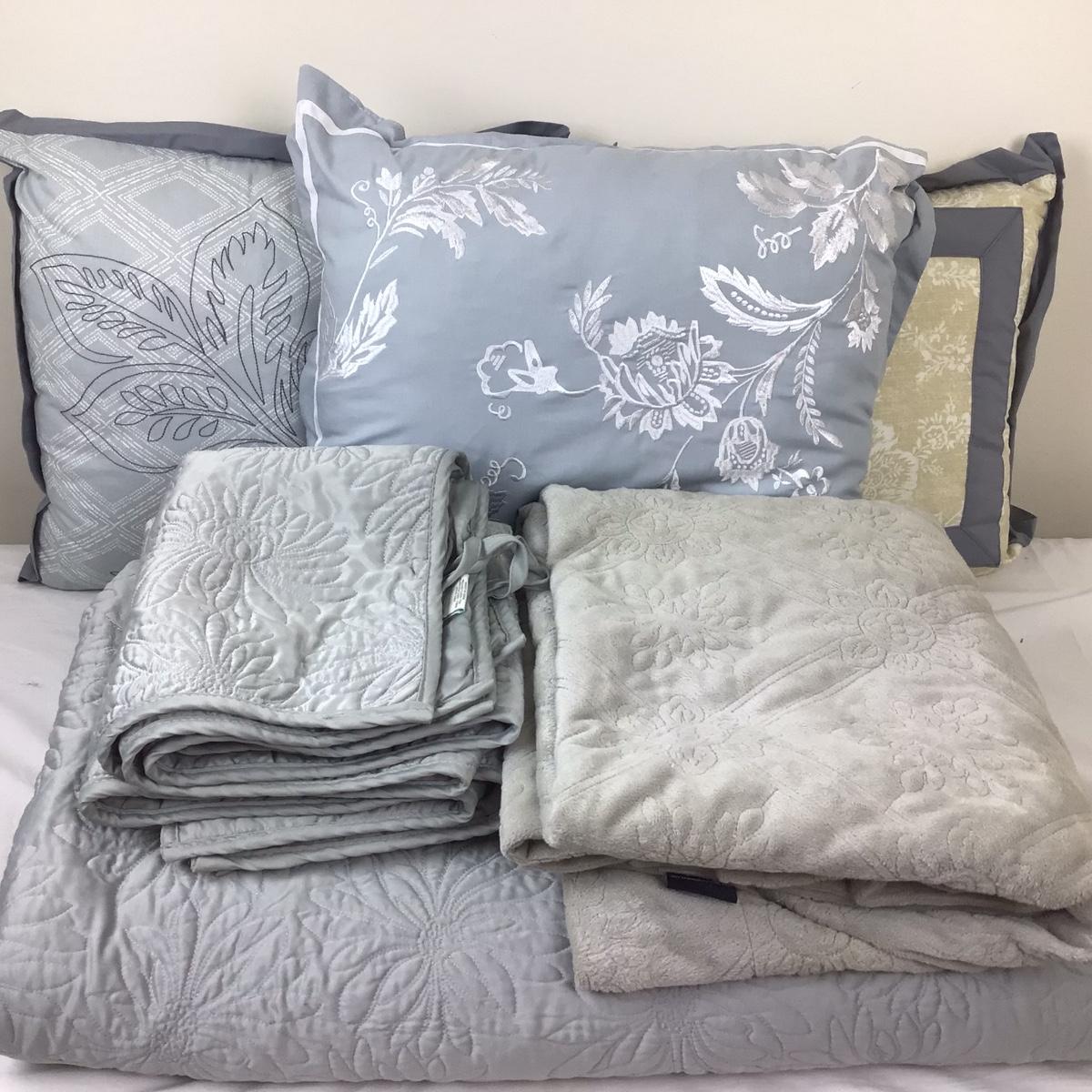 The set contains bedspread, shams, decor pillows, Berkshire fleece blanket. King size grey and white in color.