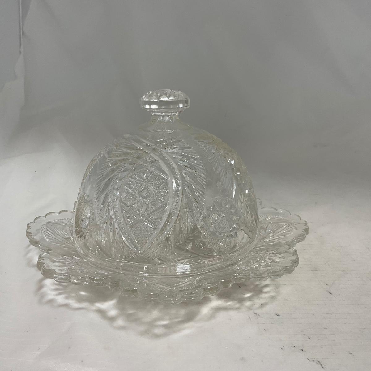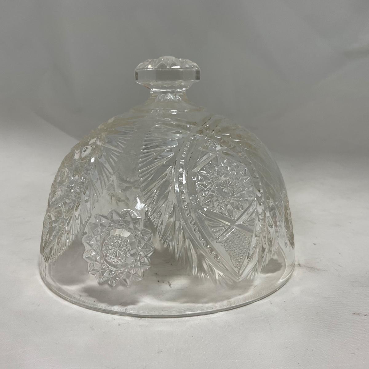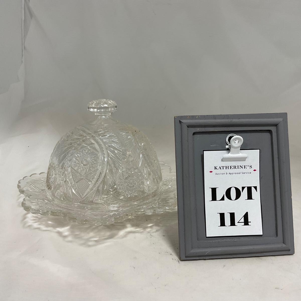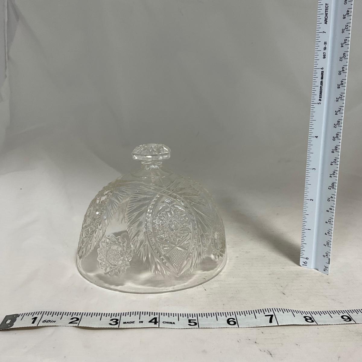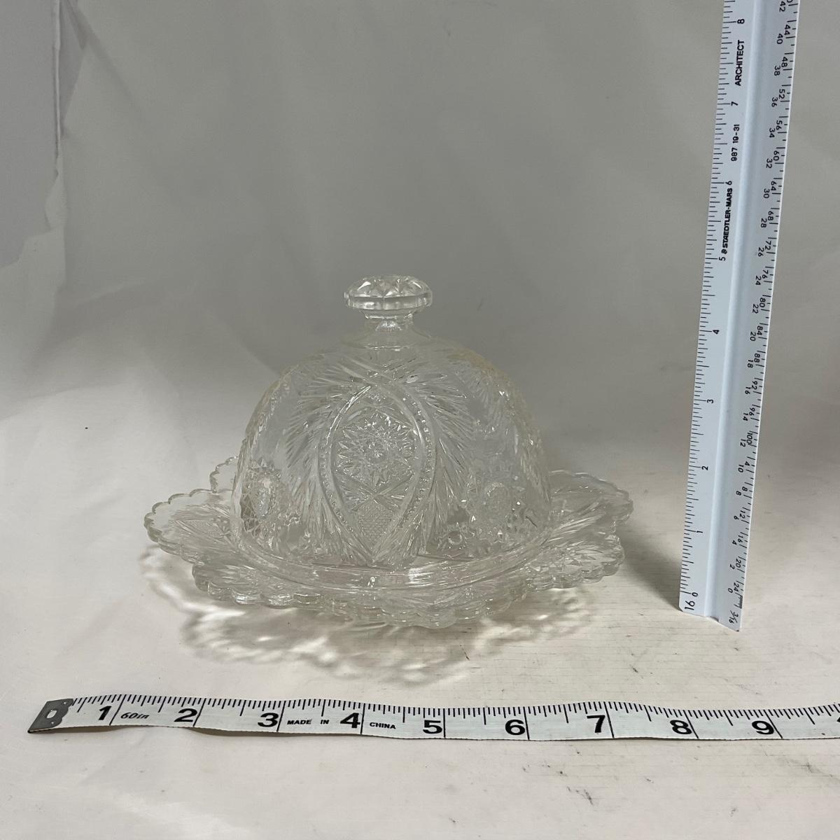 One medium sized clear glass covered butter dish. With intricate design. Please see photos for details and condition. ::: Shipping is available on this lot. If you require shipping you must let us know at the close of the auction. We will coordinate with you after the item has been won. Shipping fees will include insurance up to or exceeding the value of all items being mailed. If you have any questions regarding this lot please contact the auctioneer either via this website, by direct email or by phone. PICK UP TIMES and other important information can be found in the TERMS and DESCRIPTION of the auction. Please take a look for pertinent information. Thanks!