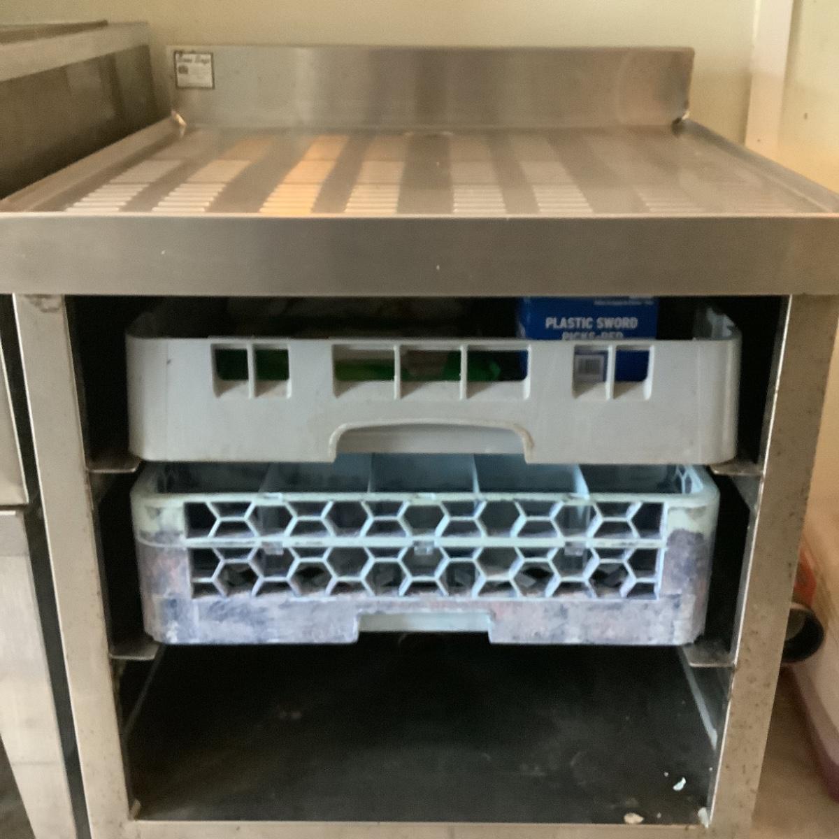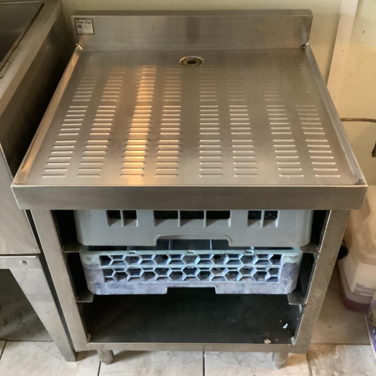 24" wide x 24" deep x 30" high with 3.5" back splash , top has drain board. Qty 3 clean dish rack storage below.