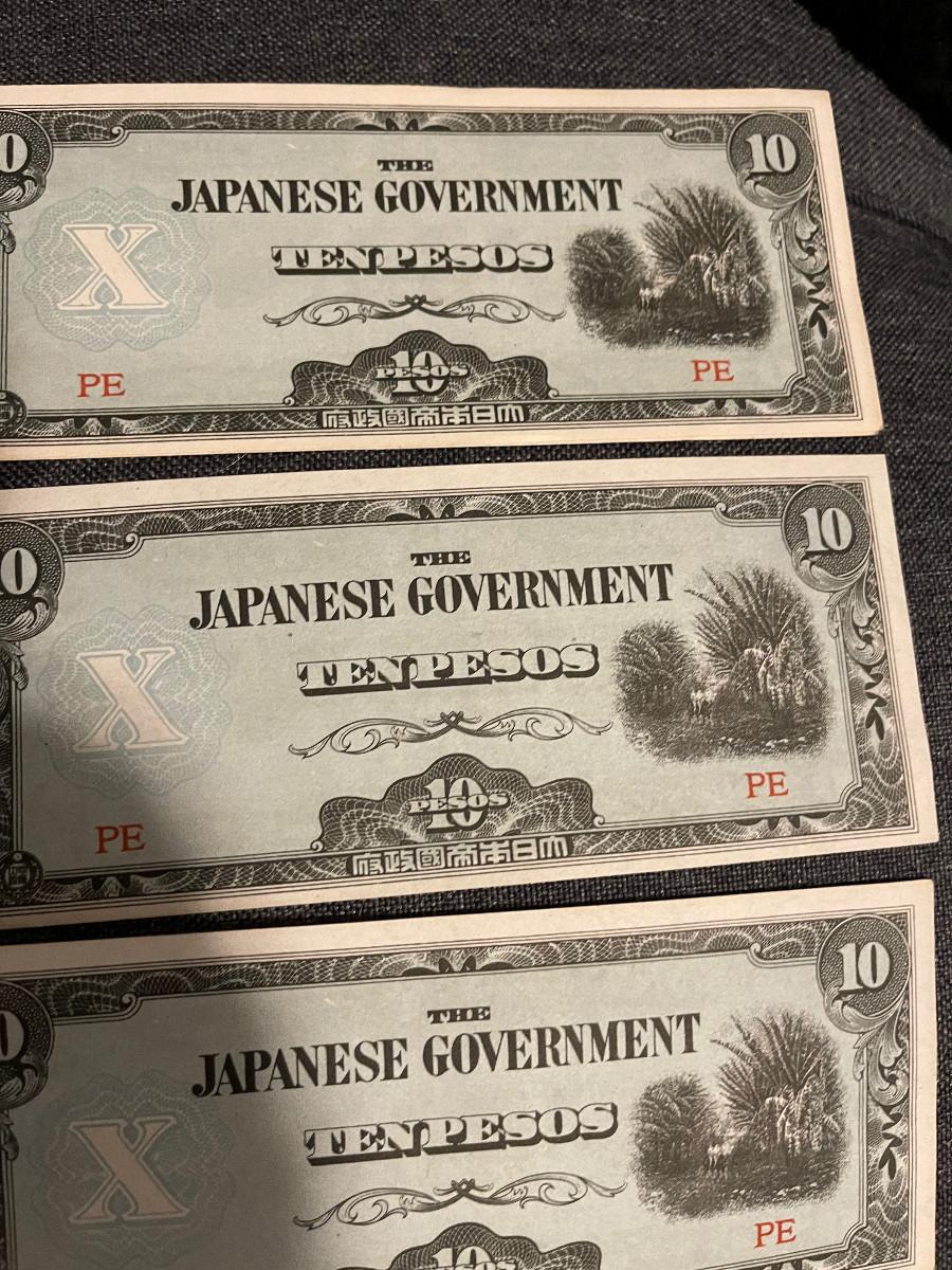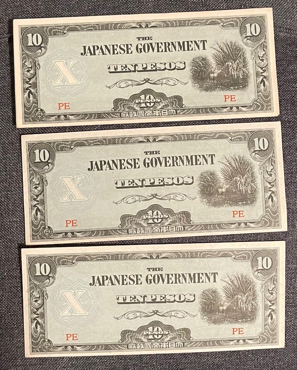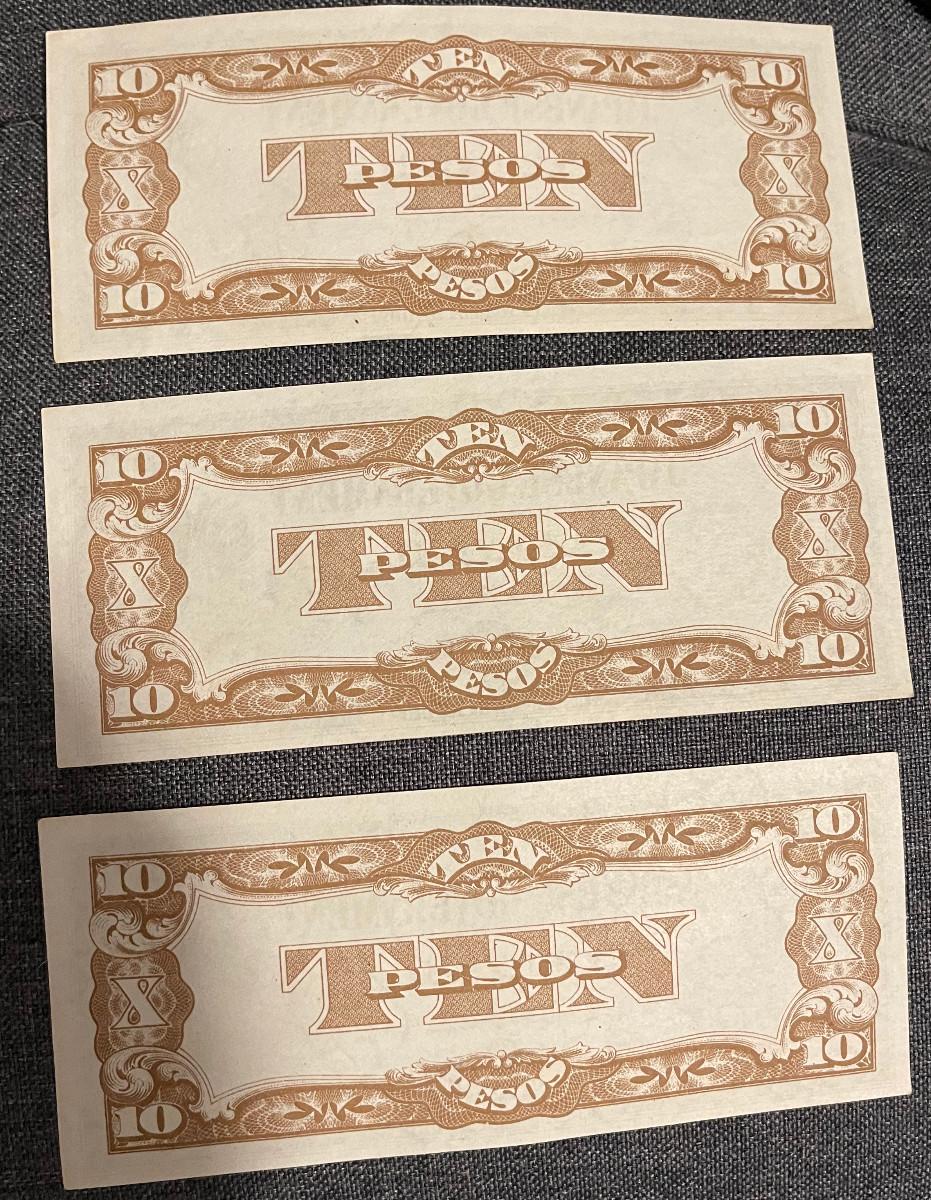 Excellent un-circulated condition, 3 Ten Peso Bank notes Japanese occupation money.