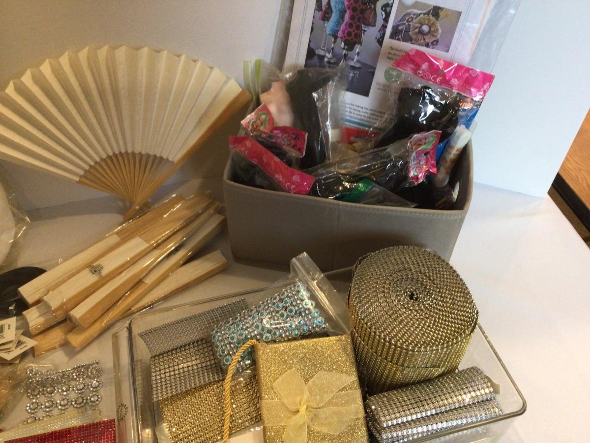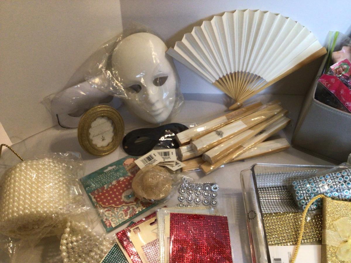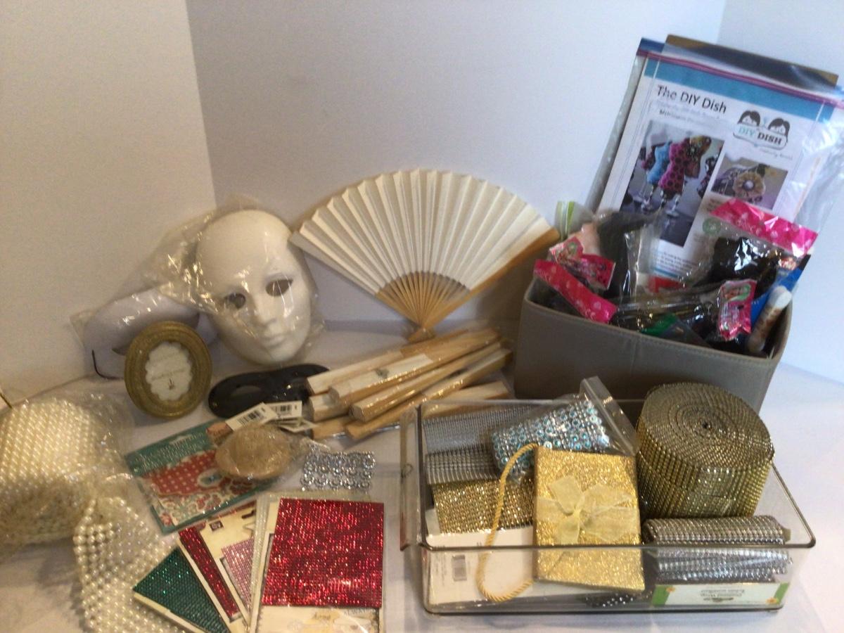Assorted craft project items, pearl trim, crystal sheets and more.