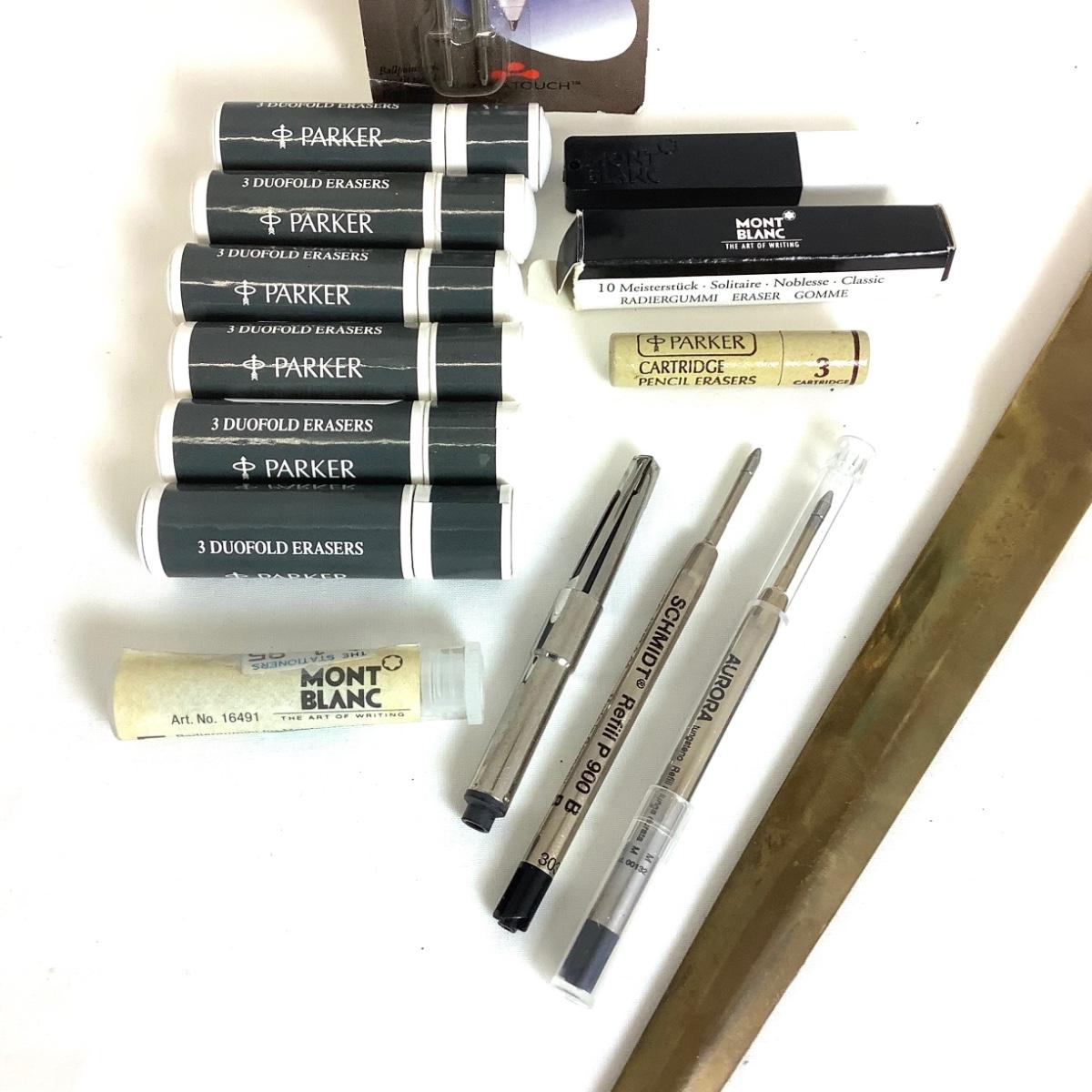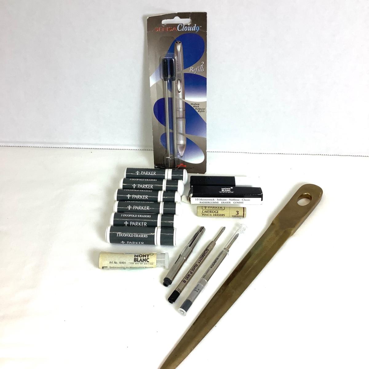 The lot contains a brass letter opener, Parker erasers for mechanical pencils, Montblan lead and erasers, and more.