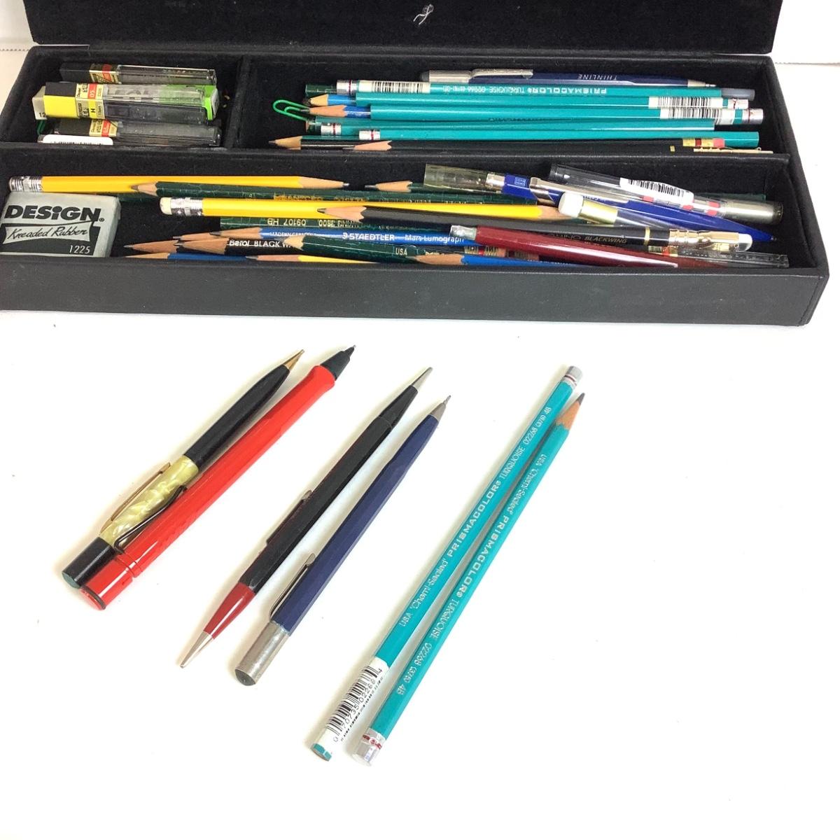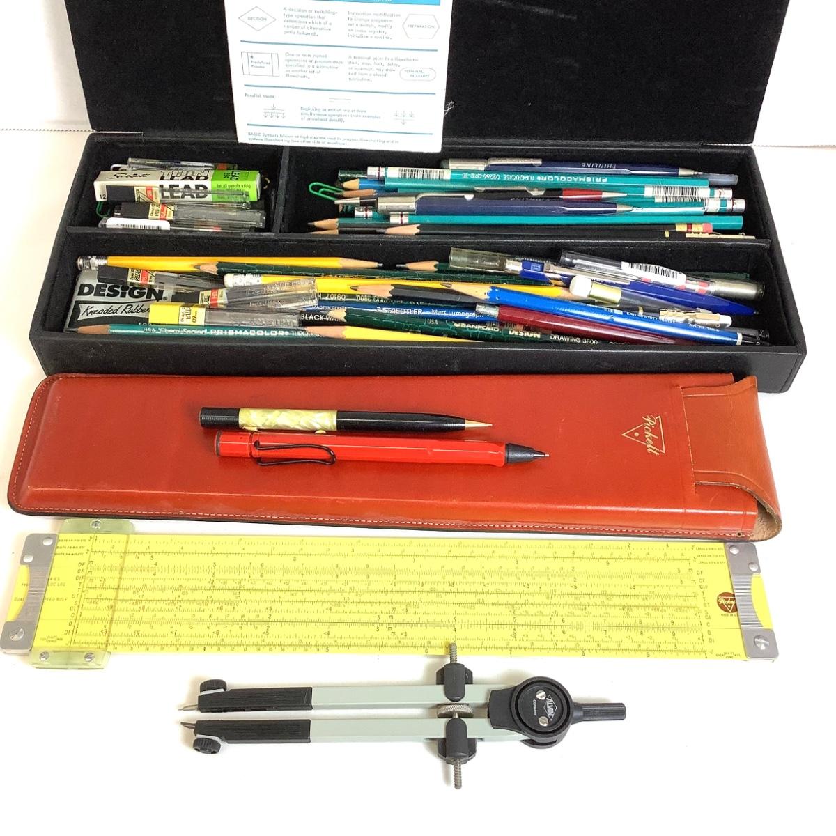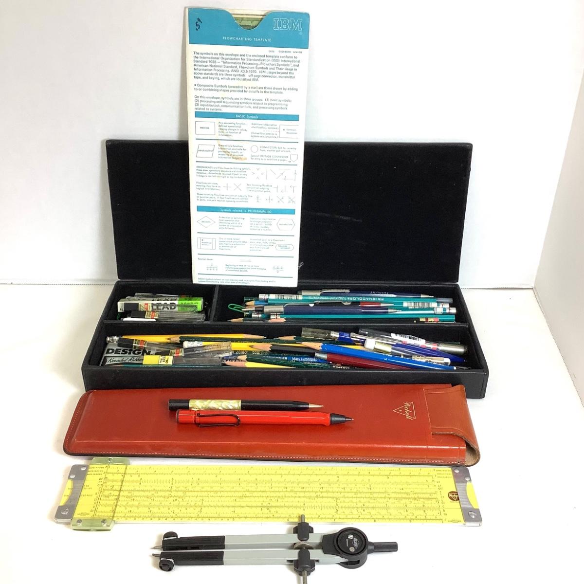 IBM Flow chart template, Alvin compass, Pickett slide ruler with case, Lamy, Staedler, Prismacolor pencils as well as lead, erasers and more.