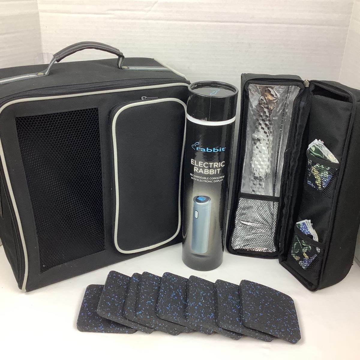 Travel bag, Wine picnic bag, Rabbit opener and coasters.