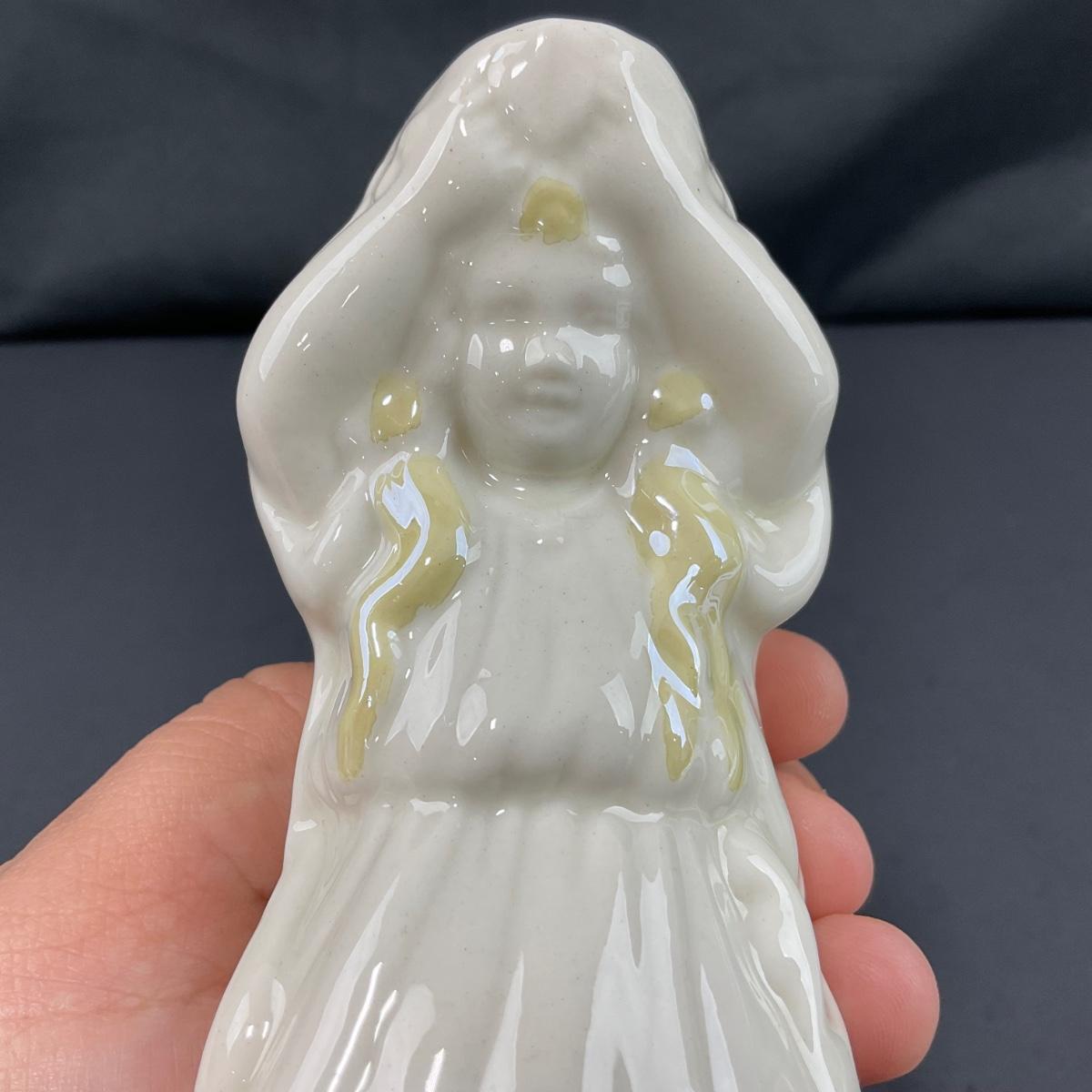 One vintage Belleek 4th mark maiden kneeling small pitcher. This piece has no damage, and appears to be in great shape with no visable chips, cracks, or broken pieces. Please see photos for details and condition. Any condition statement is given as a courtesy to a client, is an opinion, and should not be treated as a statement of fact. Reference to condition written, oral or within a condition report shall not be regarded as a full account of condition and may not include all defects, alterations, or restorations. Absence of a condition report does not imply a lot is flawless or lacking imperfections or damage. Katherine’s Auction & Appraisal Service shall have no responsibility for any error or omission. Returns shall not be accepted on the basis of condition. ::: Shipping is available on this lot. If you require shipping you must let us know at the close of the auction. We will coordinate with you after the item has been won. Shipping fees will include insurance up to or exceeding the value of all items being mailed. If you have any questions regarding this lot please contact the auctioneer either via this website, by direct email or by phone. PICK UP TIMES and other important information can be found in the TERMS and DESCRIPTION of the auction. Please take a look for pertinent information. Thanks!