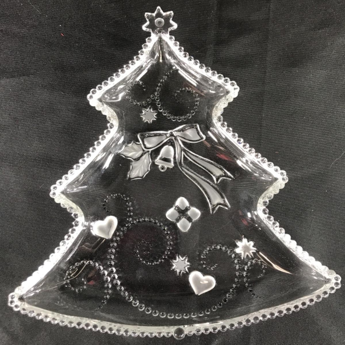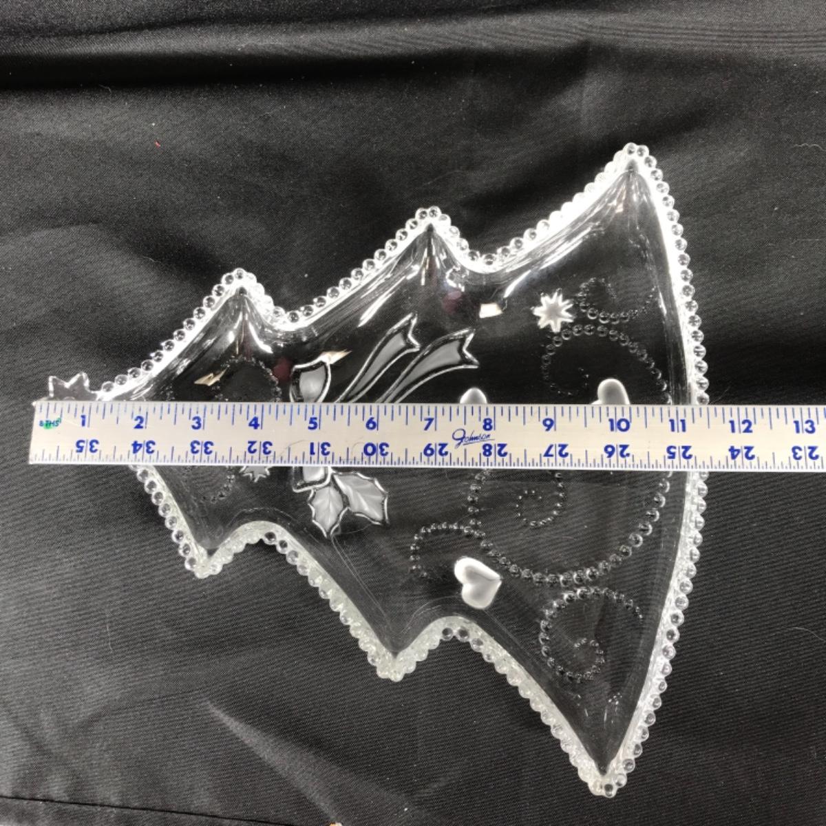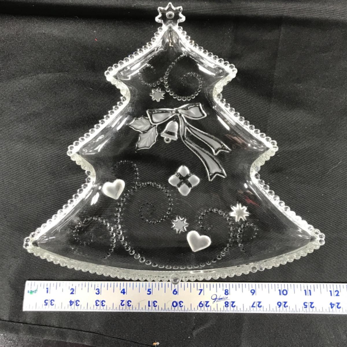 Up for auction is an 11 1/2 inch glass holiday trinket dish in the shape of a Christmas tree. It is in excellent condition with no visible chips unmarked; see pictures.