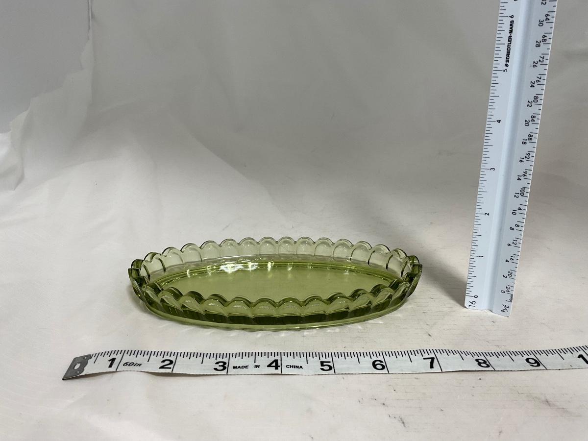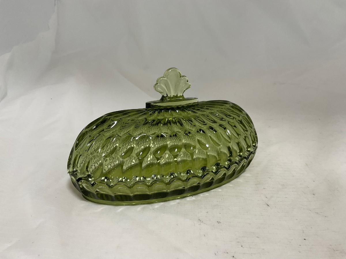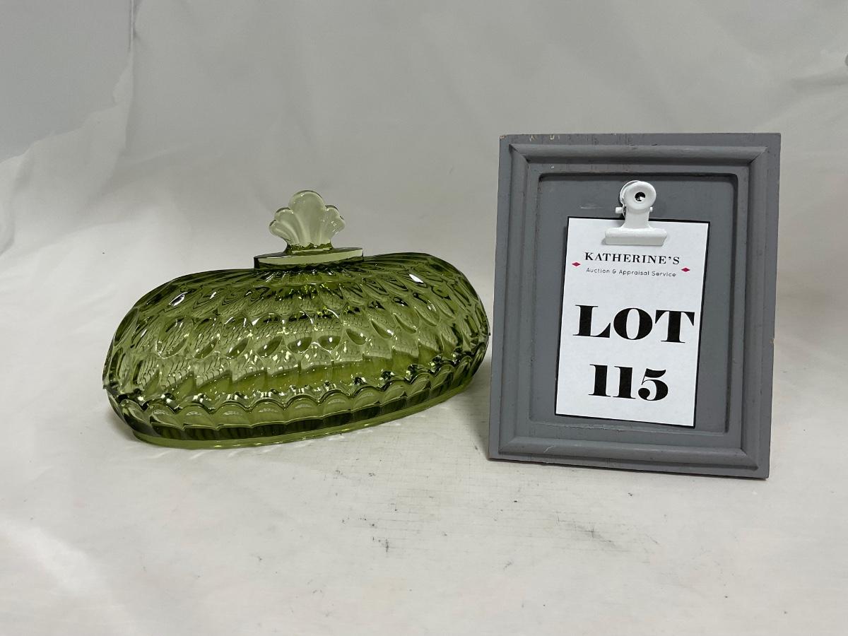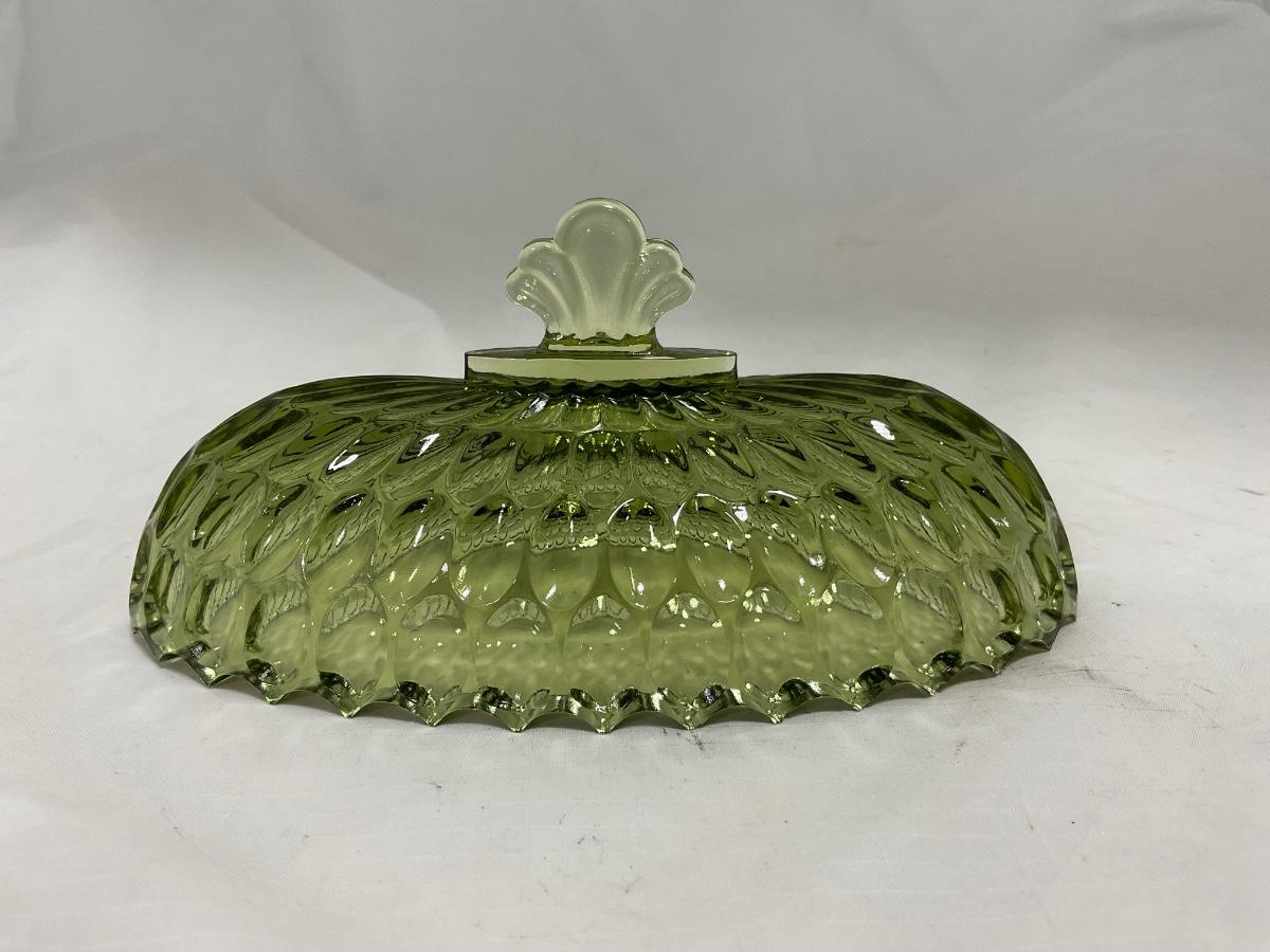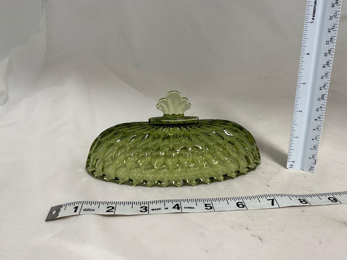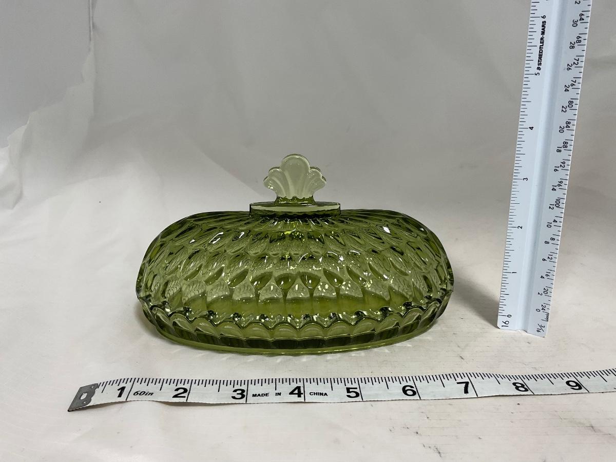 One long green glass covered butter dish. In amazing condition. Please see photos for details and condition. ::: Shipping is available on this lot. If you require shipping you must let us know at the close of the auction. We will coordinate with you after the item has been won. Shipping fees will include insurance up to or exceeding the value of all items being mailed. If you have any questions regarding this lot please contact the auctioneer either via this website, by direct email or by phone. PICK UP TIMES and other important information can be found in the TERMS and DESCRIPTION of the auction. Please take a look for pertinent information. Thanks!