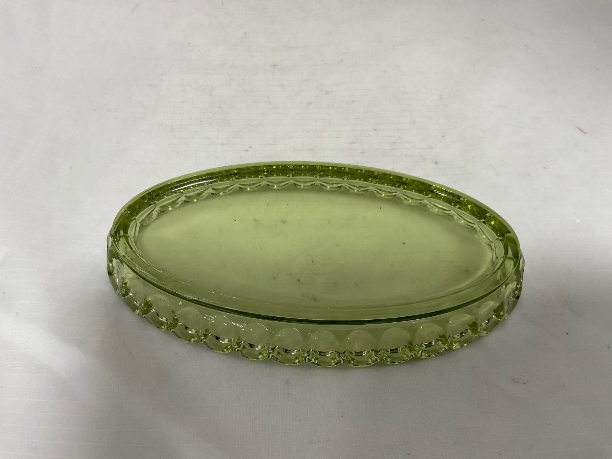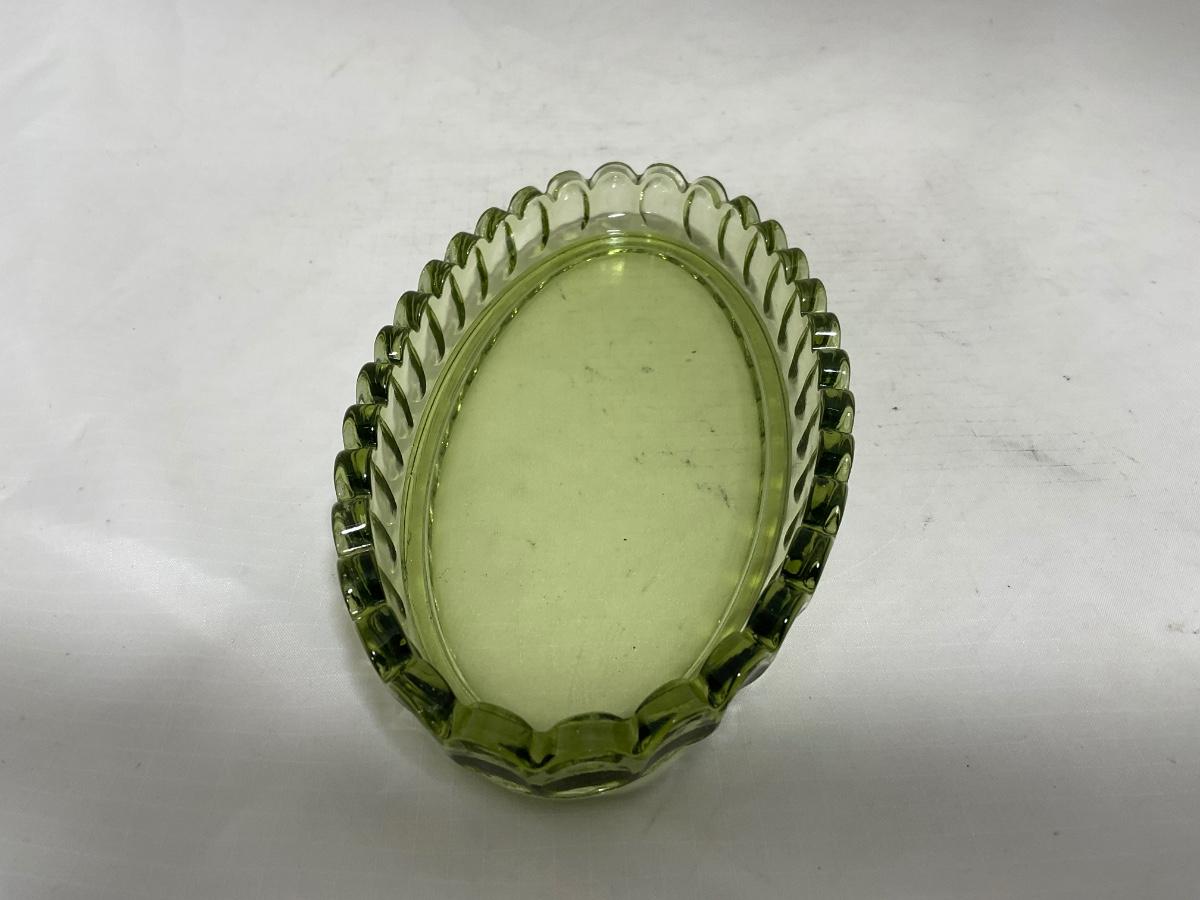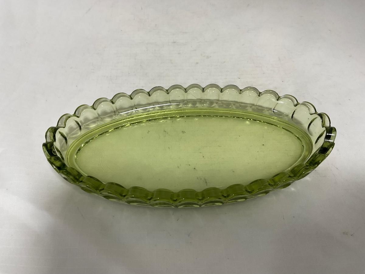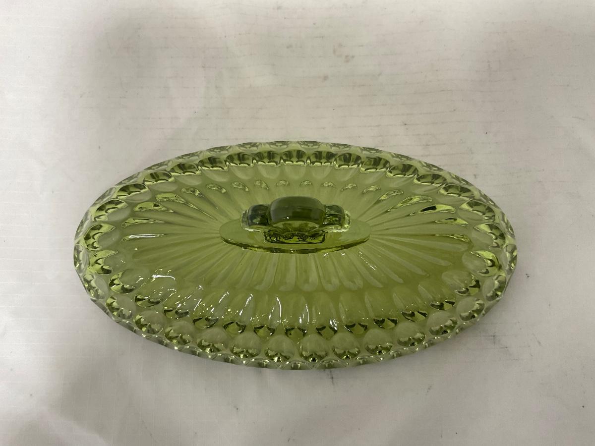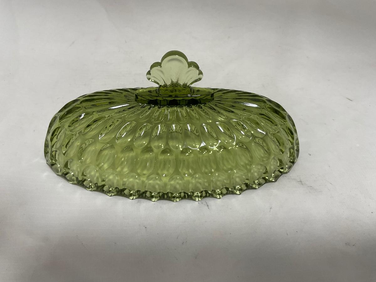 One long green glass covered butter dish. In amazing condition. Please see photos for details and condition. ::: Shipping is available on this lot. If you require shipping you must let us know at the close of the auction. We will coordinate with you after the item has been won. Shipping fees will include insurance up to or exceeding the value of all items being mailed. If you have any questions regarding this lot please contact the auctioneer either via this website, by direct email or by phone. PICK UP TIMES and other important information can be found in the TERMS and DESCRIPTION of the auction. Please take a look for pertinent information. Thanks!