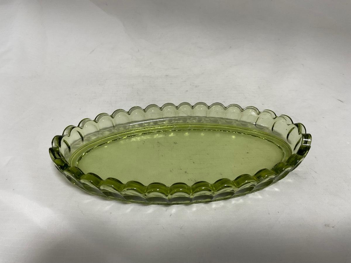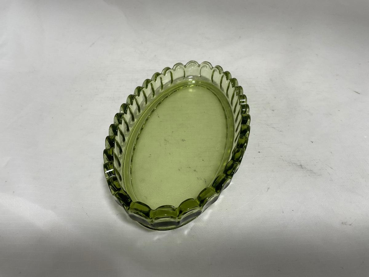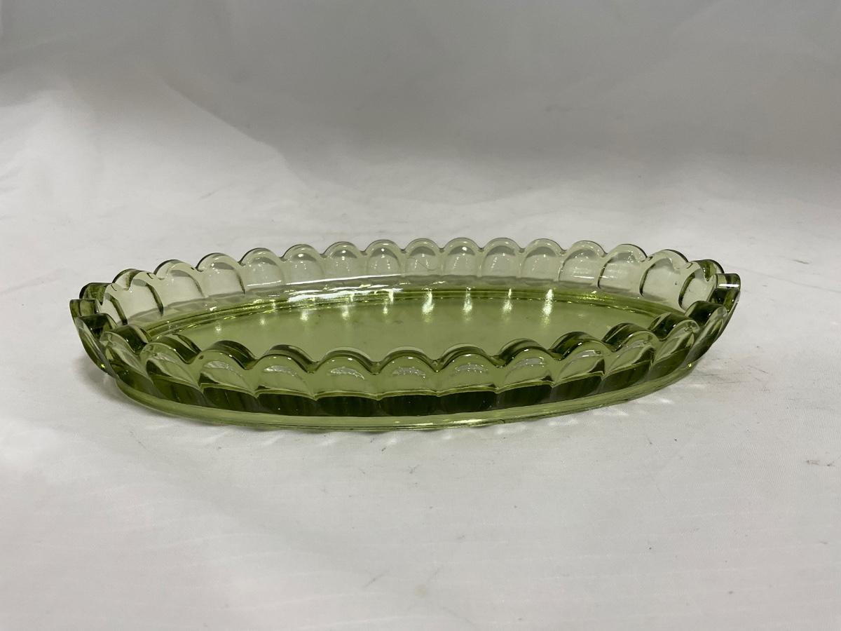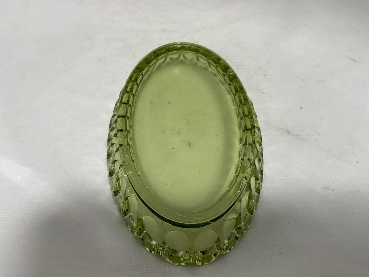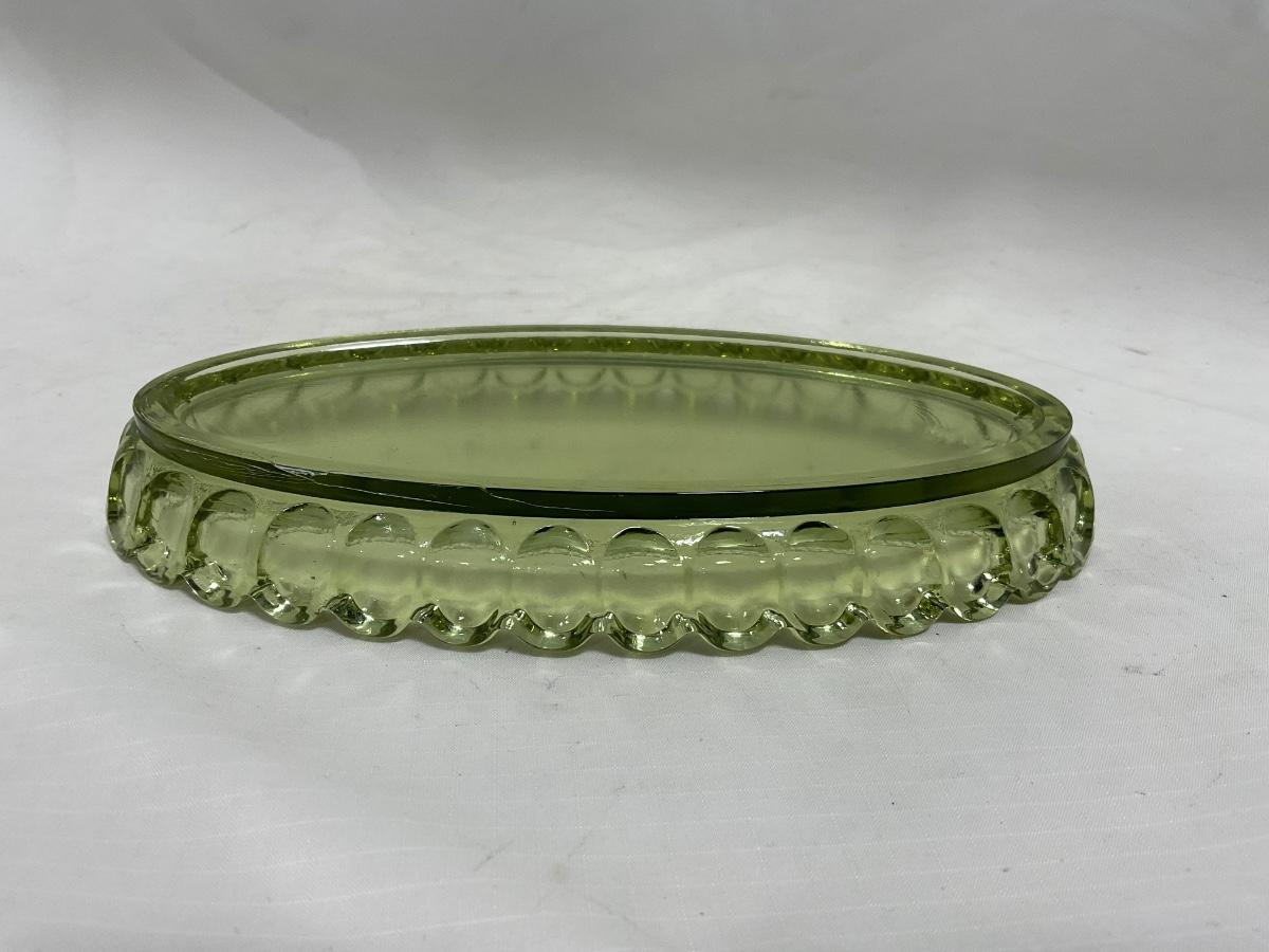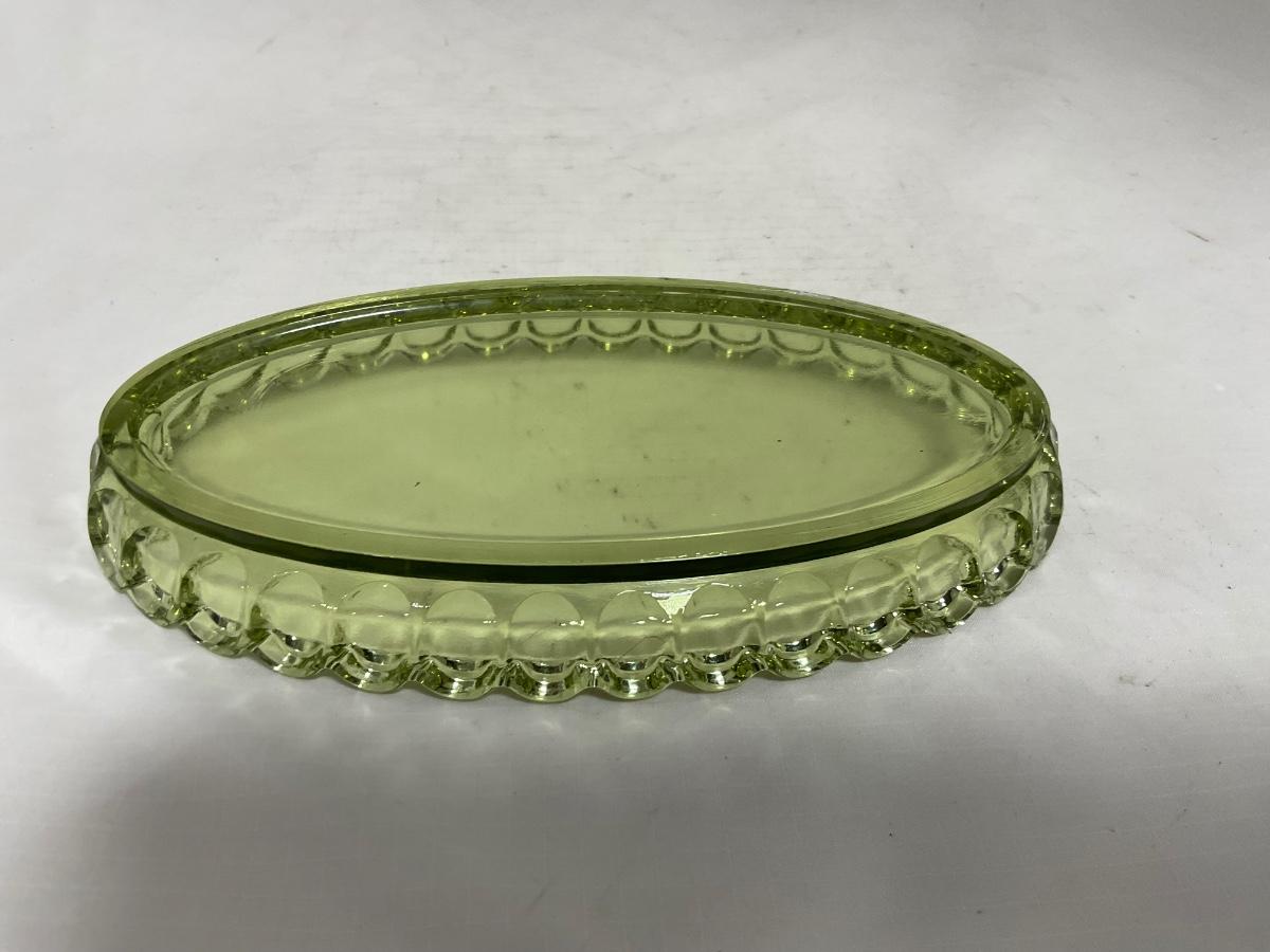 One long green glass covered butter dish. In amazing condition. Please see photos for details and condition. ::: Shipping is available on this lot. If you require shipping you must let us know at the close of the auction. We will coordinate with you after the item has been won. Shipping fees will include insurance up to or exceeding the value of all items being mailed. If you have any questions regarding this lot please contact the auctioneer either via this website, by direct email or by phone. PICK UP TIMES and other important information can be found in the TERMS and DESCRIPTION of the auction. Please take a look for pertinent information. Thanks!
