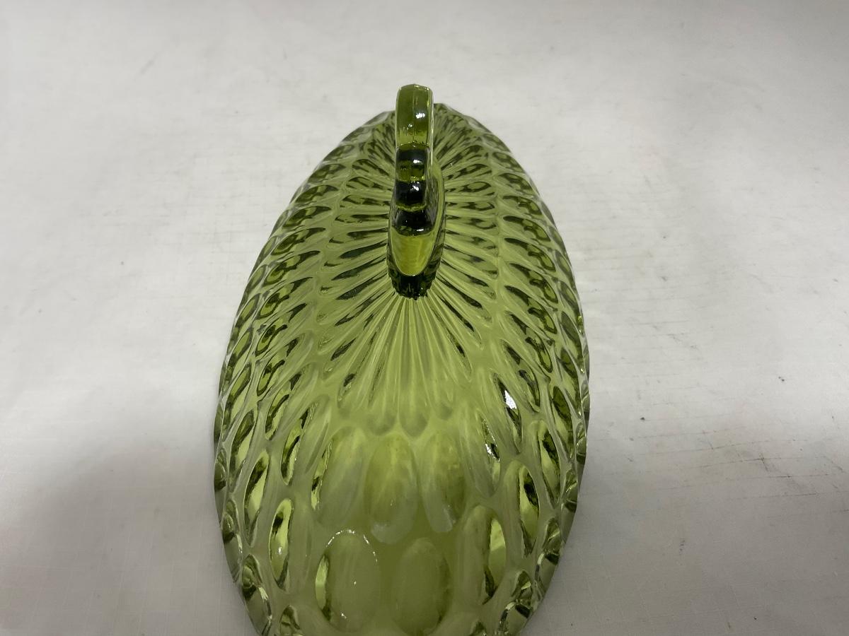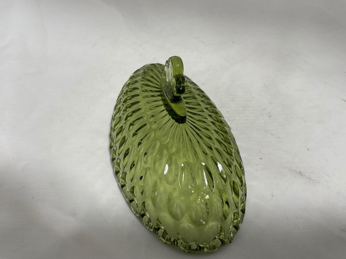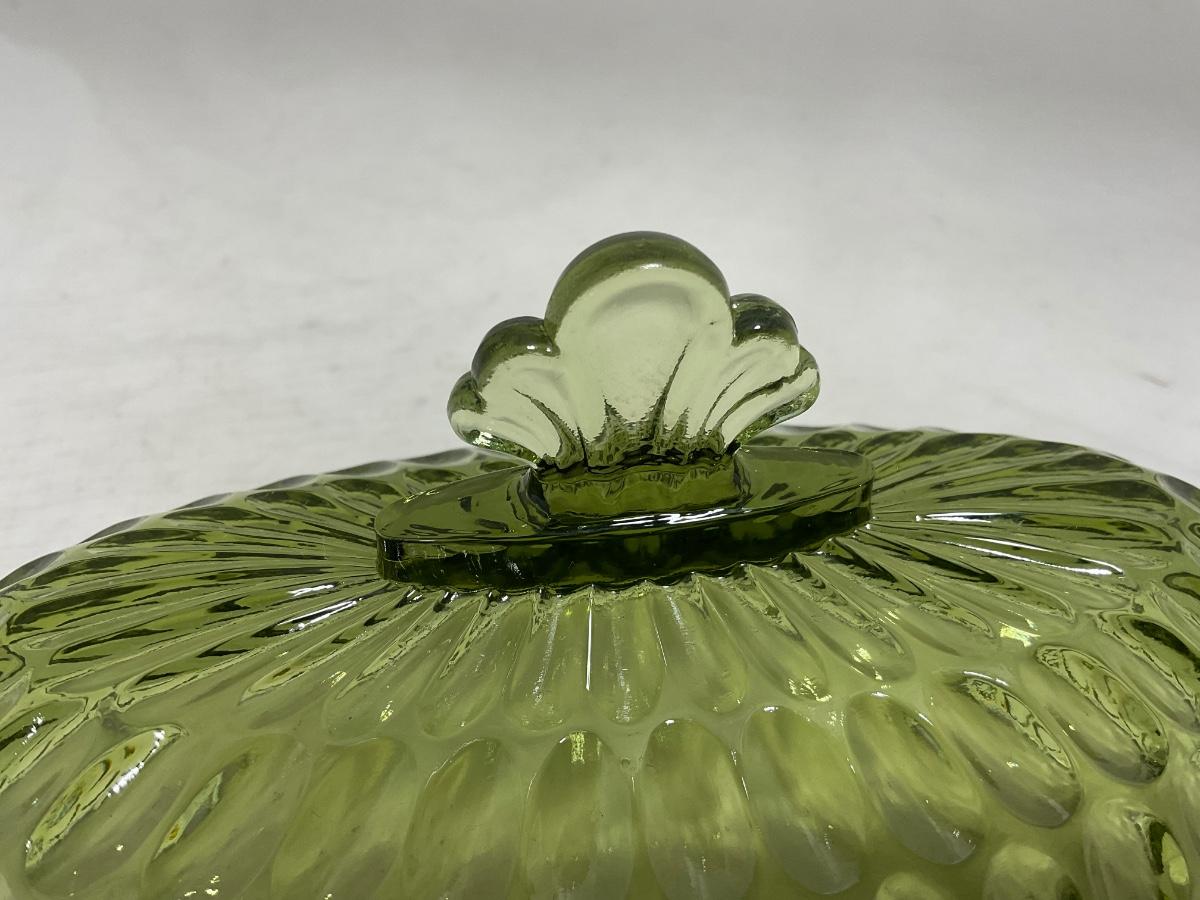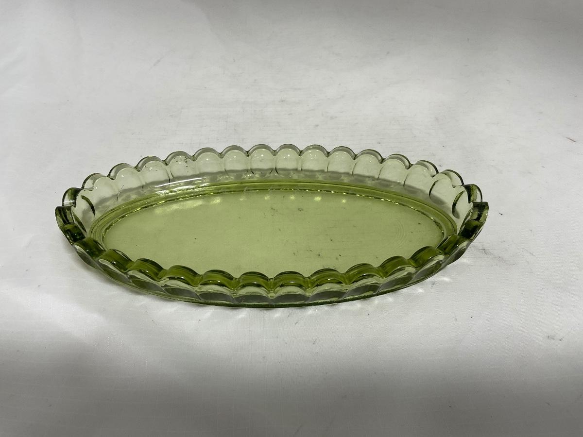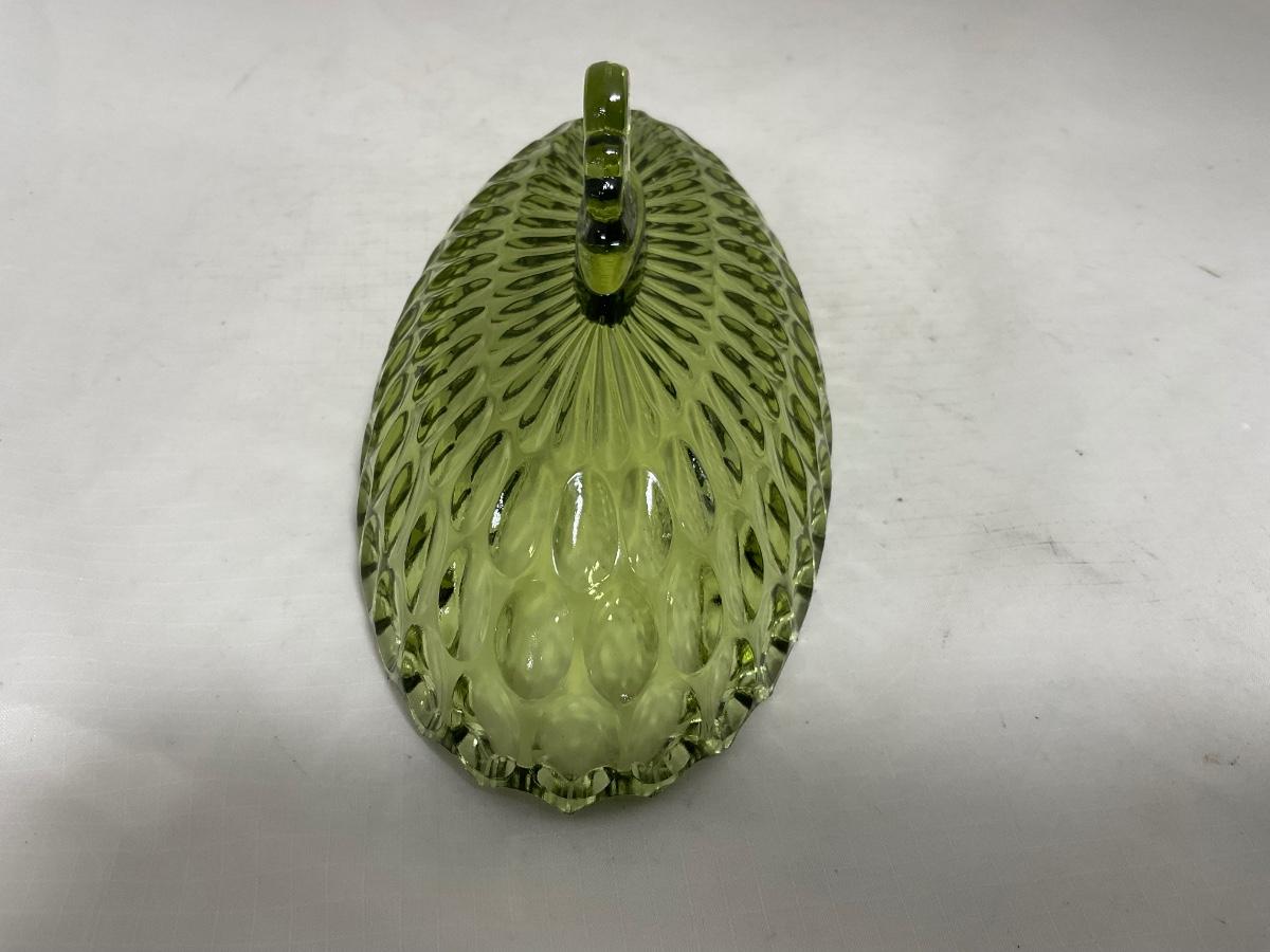 One long green glass covered butter dish. In amazing condition. Please see photos for details and condition. ::: Shipping is available on this lot. If you require shipping you must let us know at the close of the auction. We will coordinate with you after the item has been won. Shipping fees will include insurance up to or exceeding the value of all items being mailed. If you have any questions regarding this lot please contact the auctioneer either via this website, by direct email or by phone. PICK UP TIMES and other important information can be found in the TERMS and DESCRIPTION of the auction. Please take a look for pertinent information. Thanks!